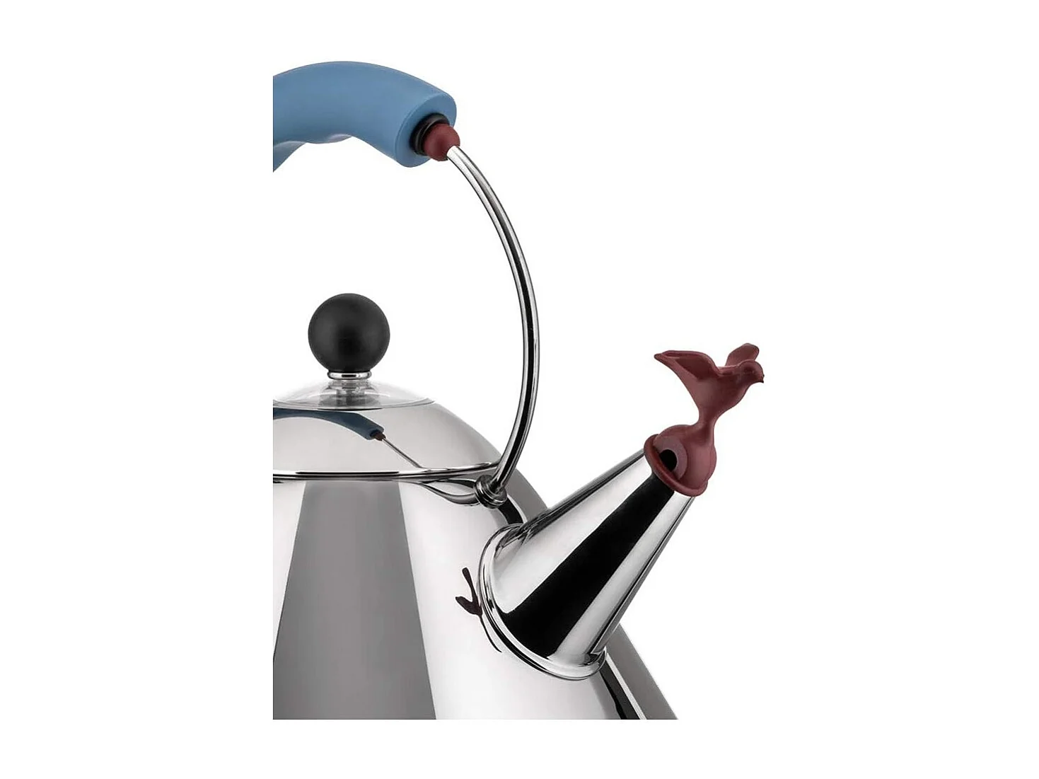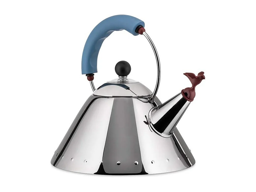 Czajnik Alessi 9093 ze stali nierdzewnej 2L z gwizdkiem w kształcie niebieskiego ptaka, ikoniczny design Michaela Gravesa