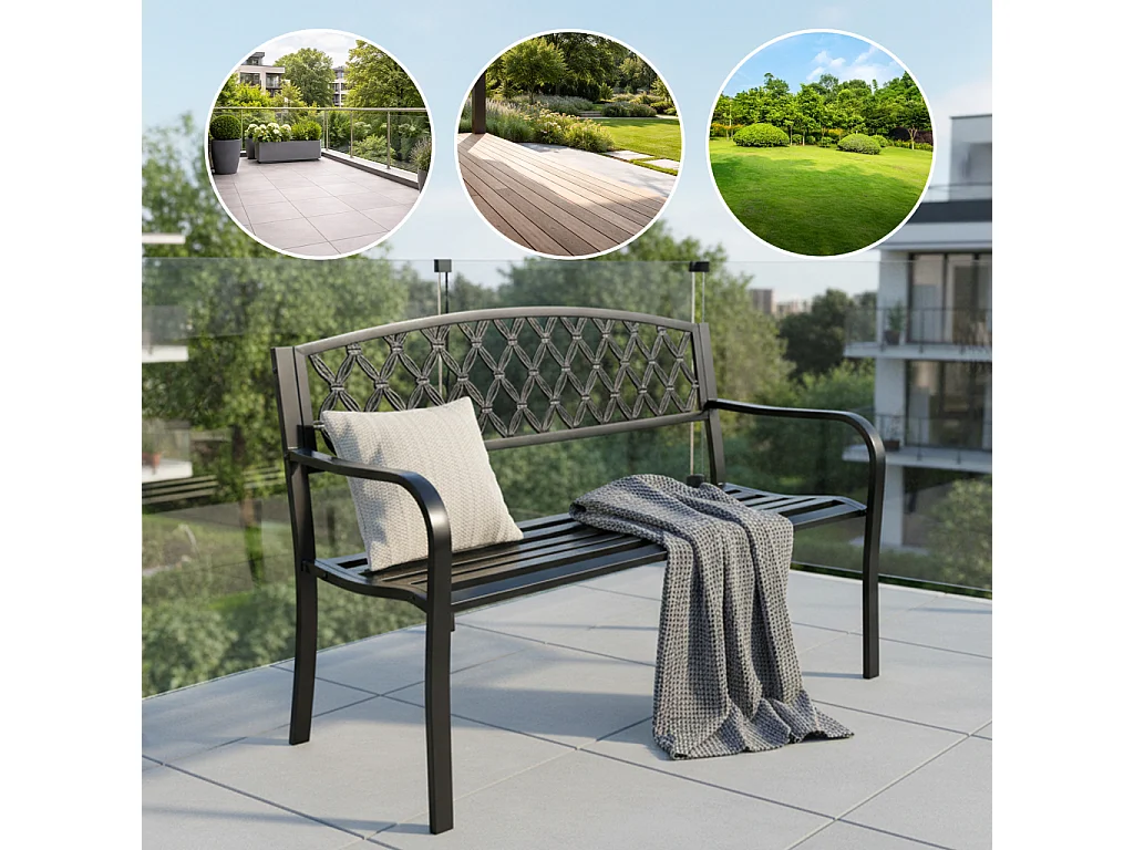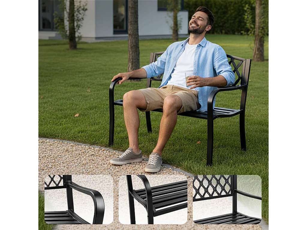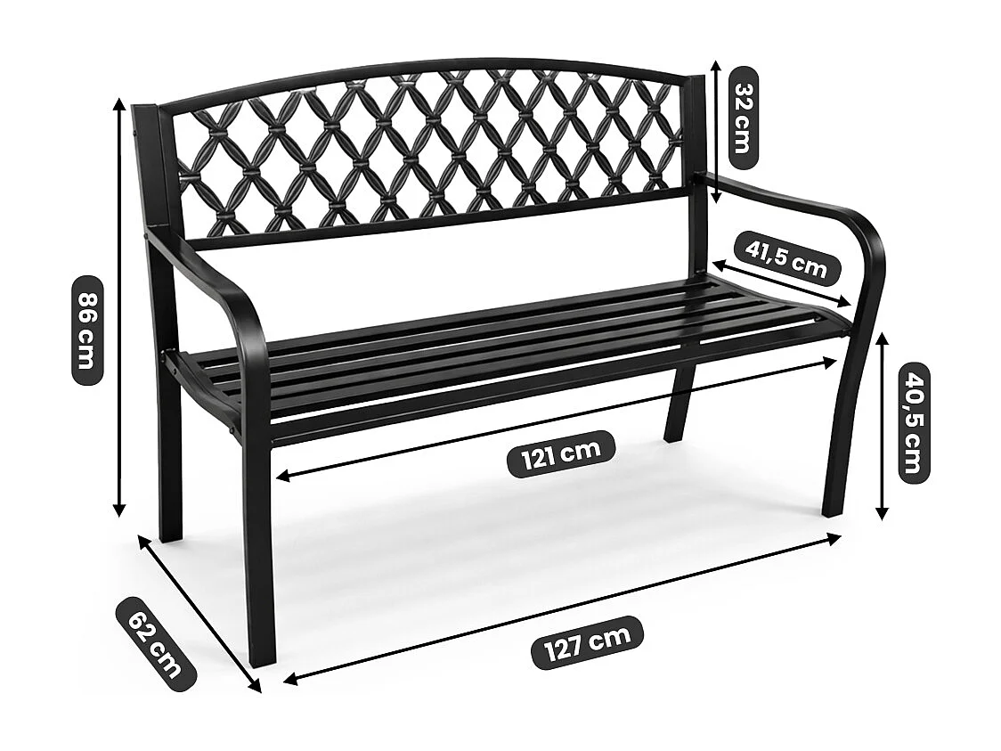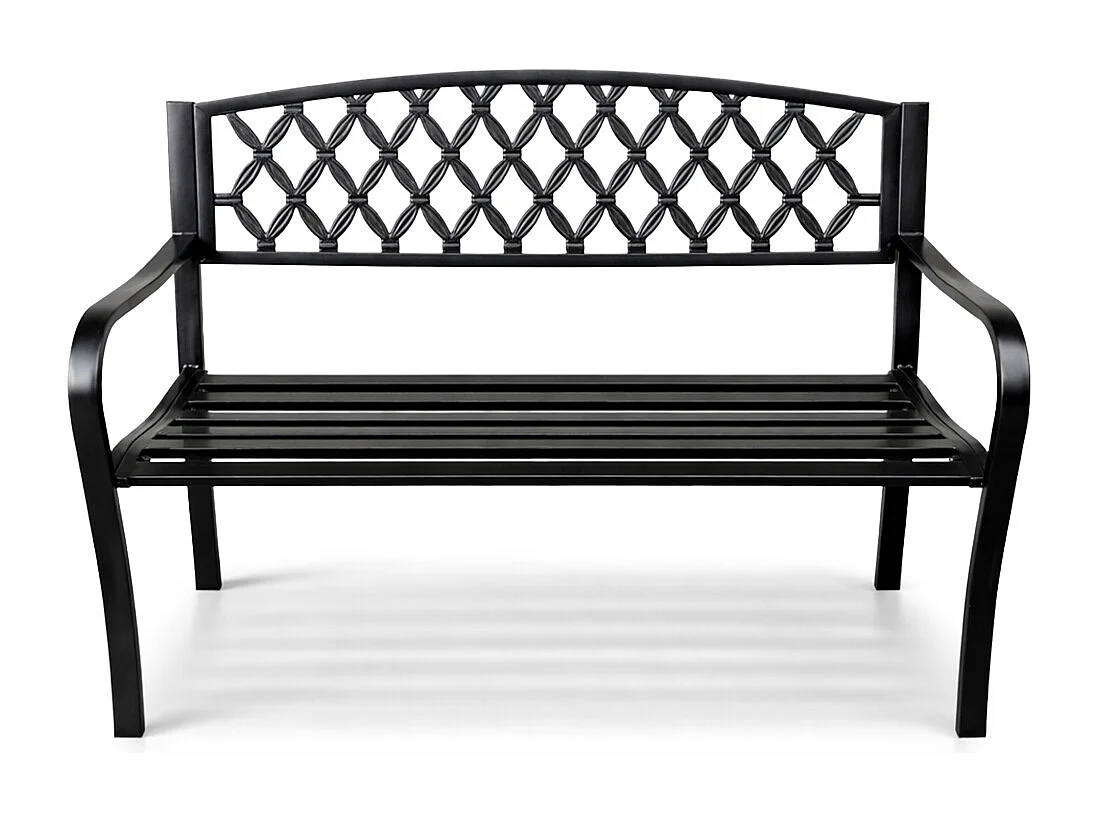 Czarna ławka ogrodowa CLASSICO ze stalowymi nogami i żeliwnym oparciem szerokość 127 cm
