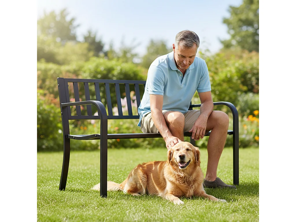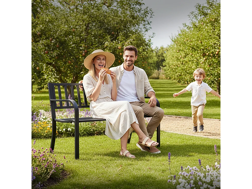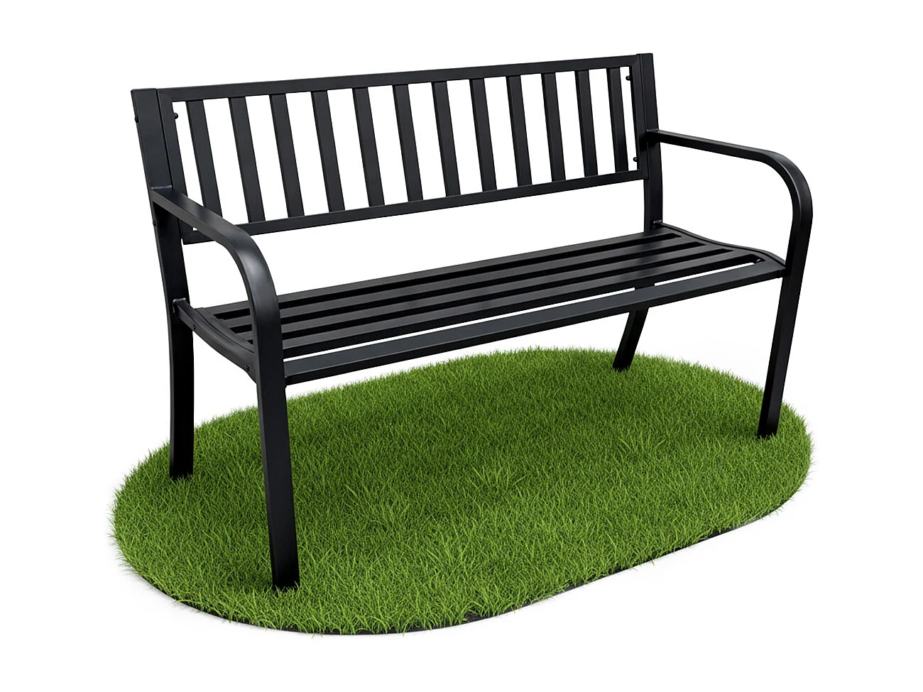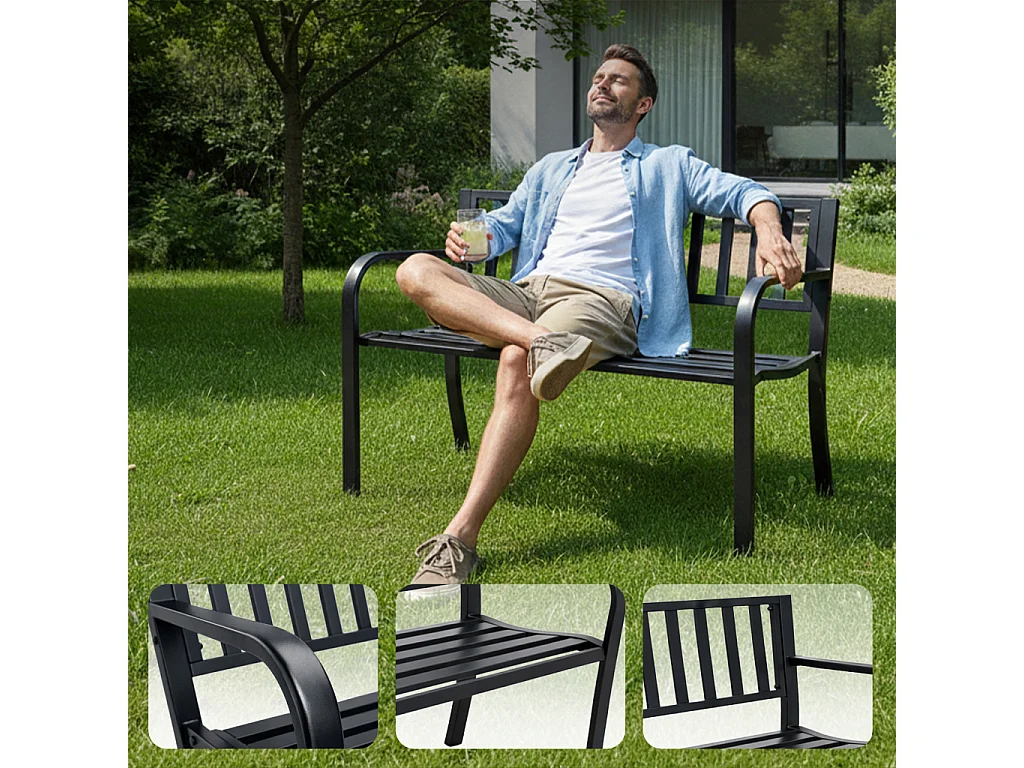 Czarna ławka ogrodowa LINEA ze stalowymi nogami i oparciem szerokość 119 cm
