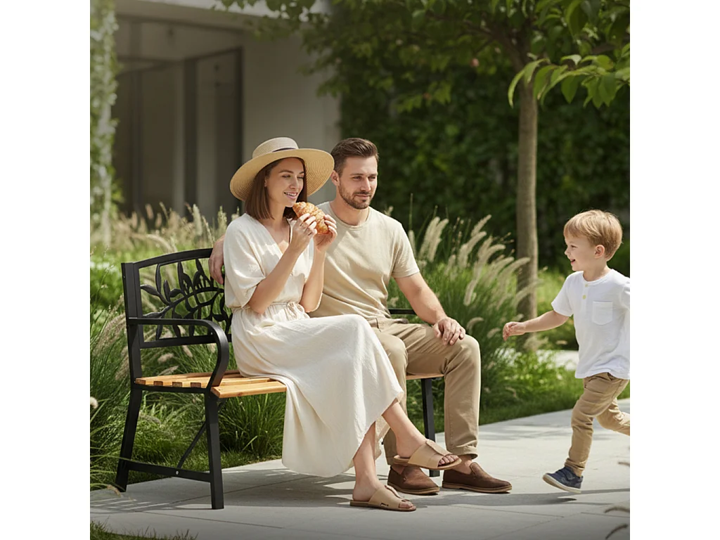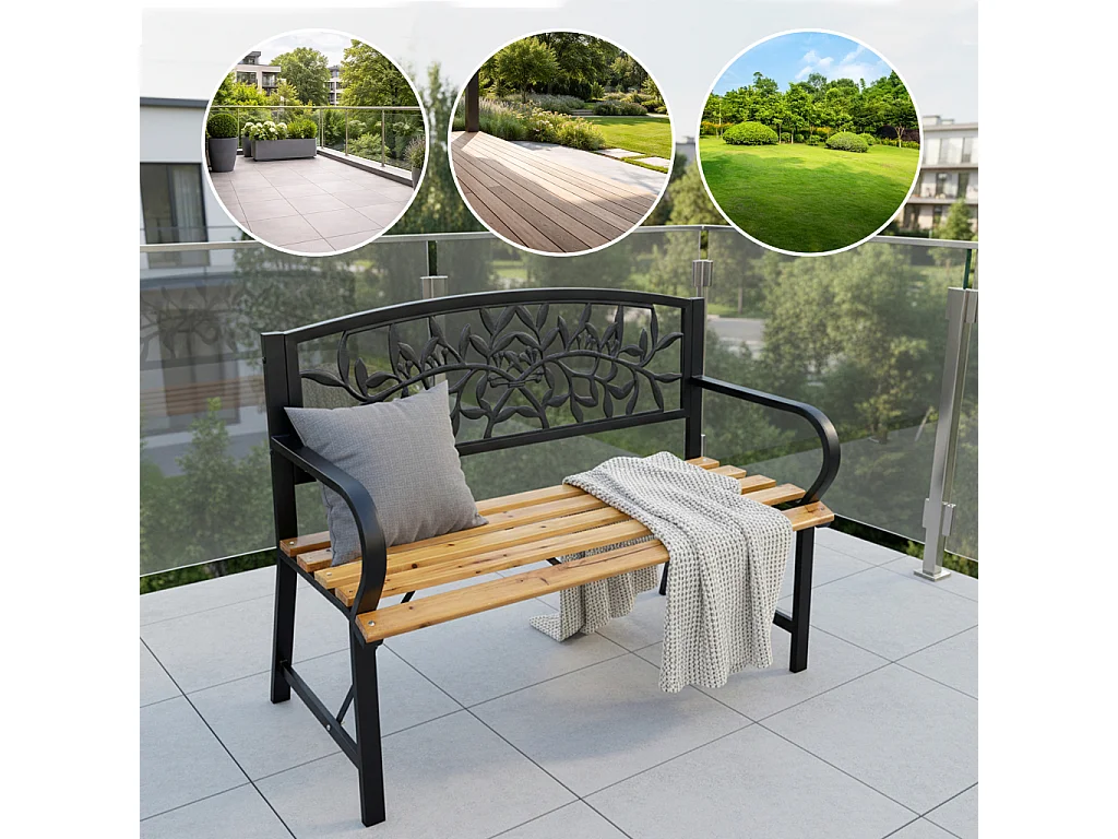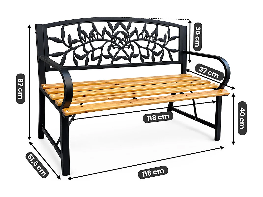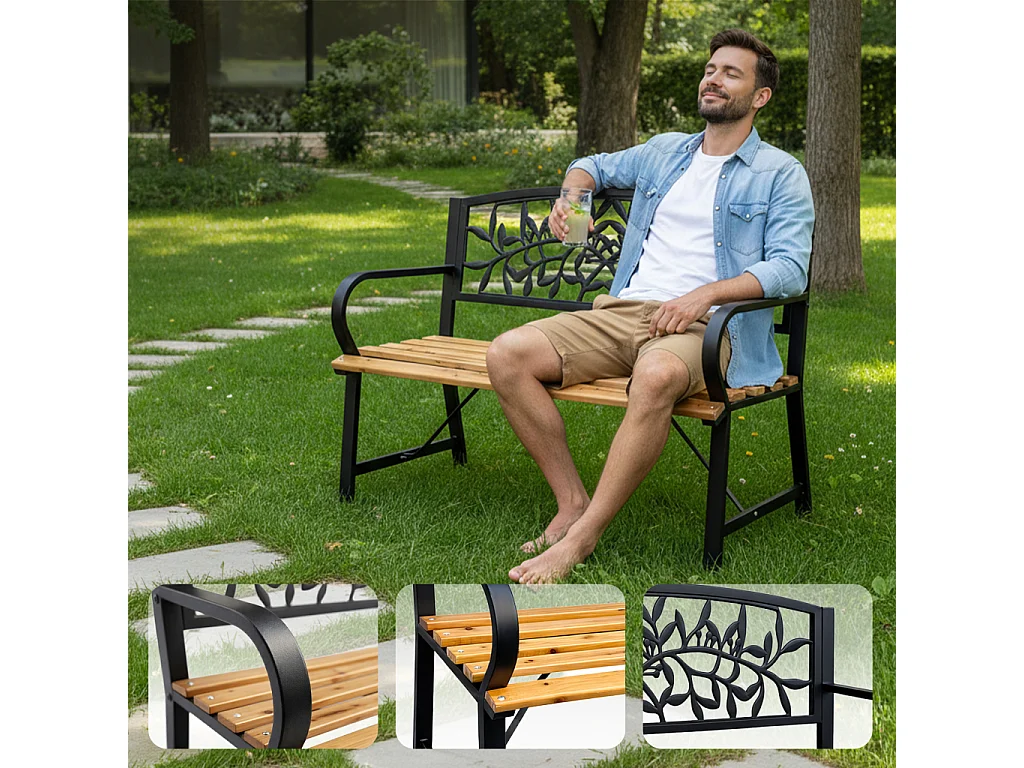 Czarna ławka ogrodowa REO z lakierowanym drewnem i stalowymi nogami szerokość 118 cm
