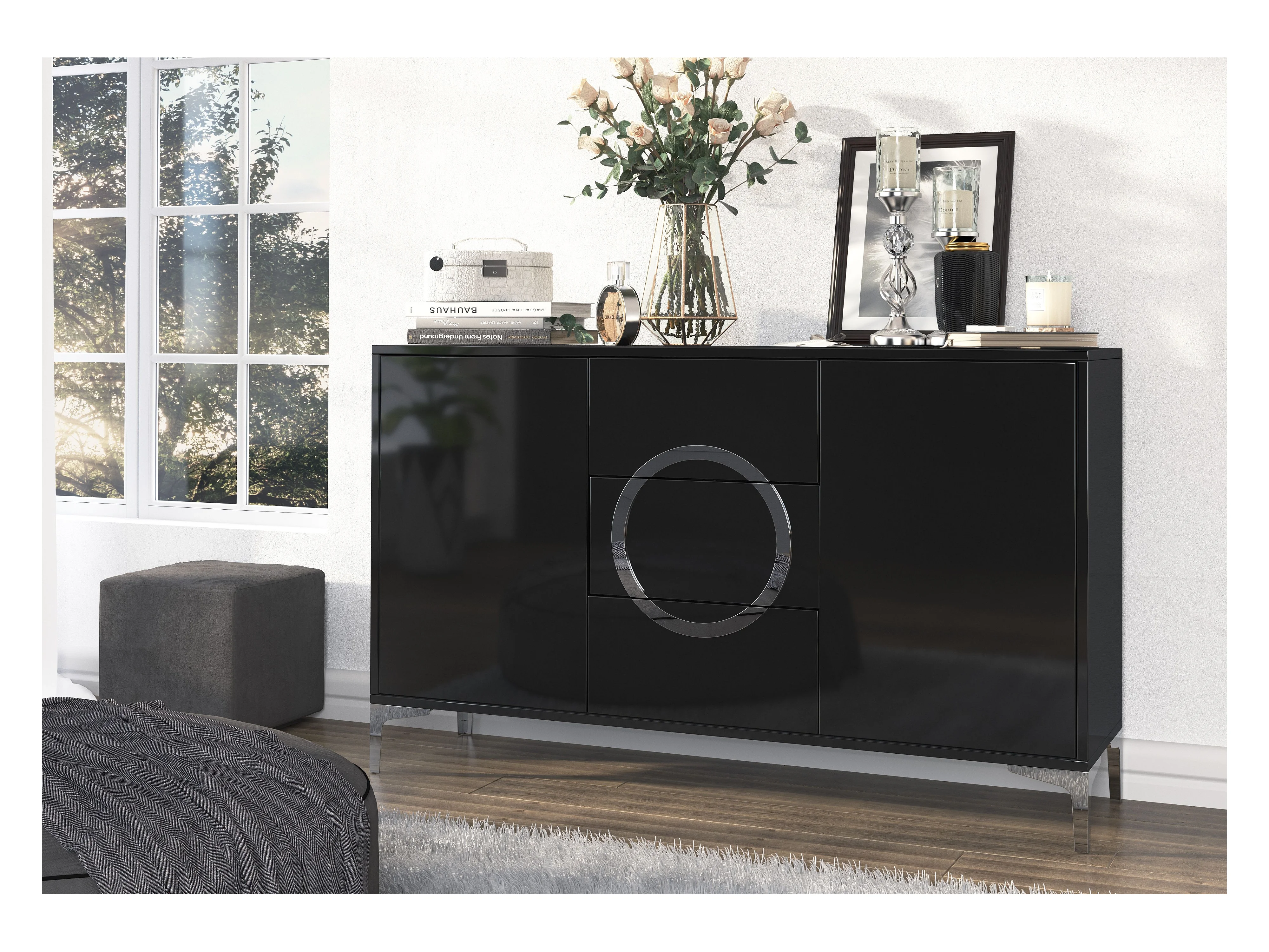 Błyszczący czarny bufet Dancan ARTEMISA z dodatkami w kolorze złota - Nowoczesny i elegancki design z systemem Push to Open
