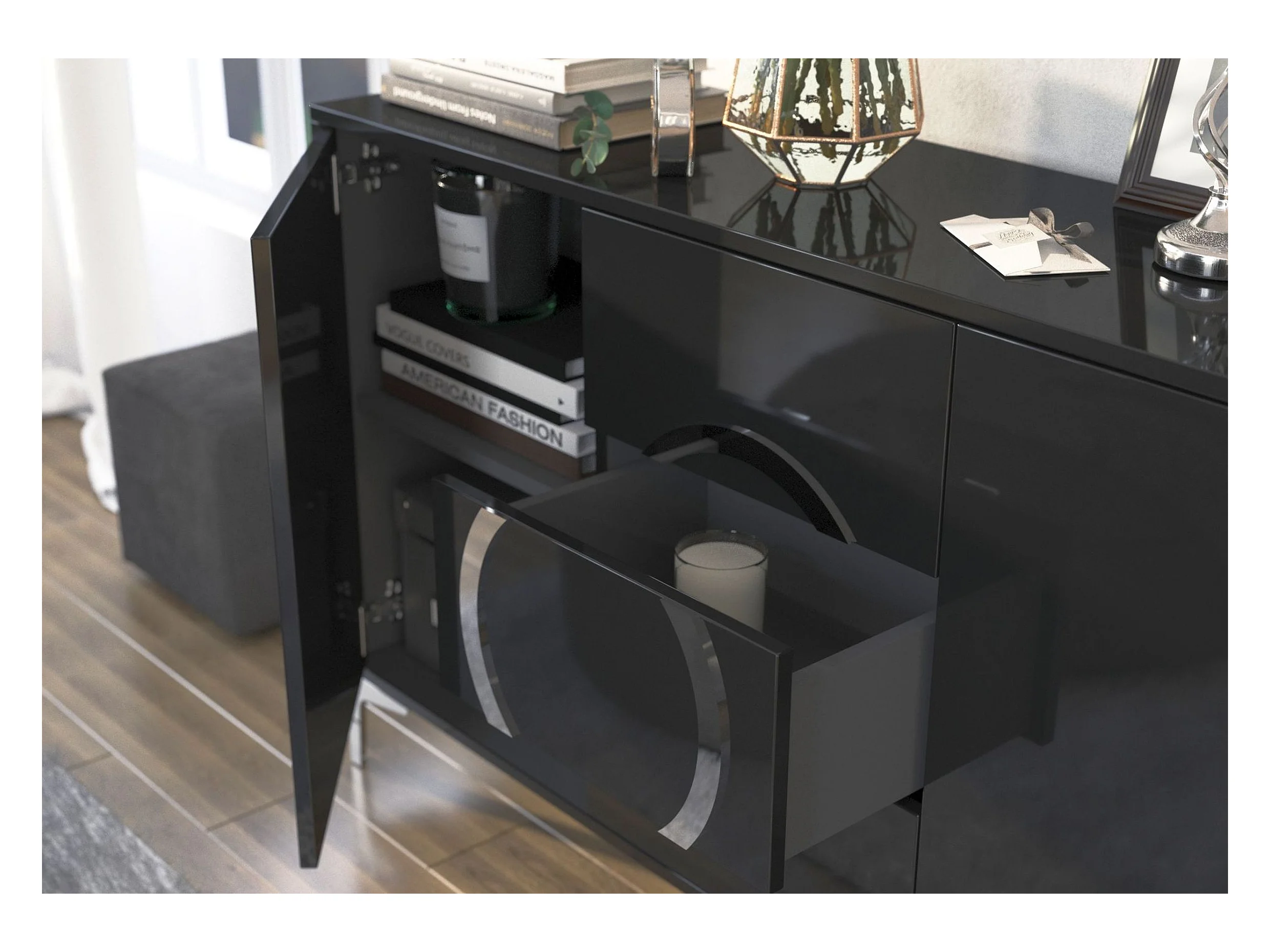 Czarna komoda, komoda w połysku z 4 drzwiami i 1 szufladą, oświetlenie LED, do salonu i jadalni