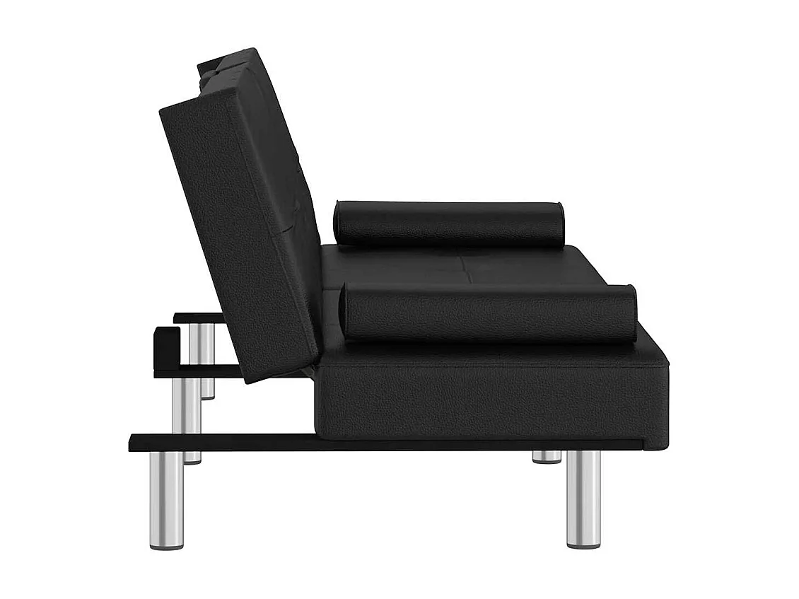 Czarna sofa rozkładana z ekoskóry z regulowanym oparciem, uchwytami na kubki i wbudowanymi portami USB