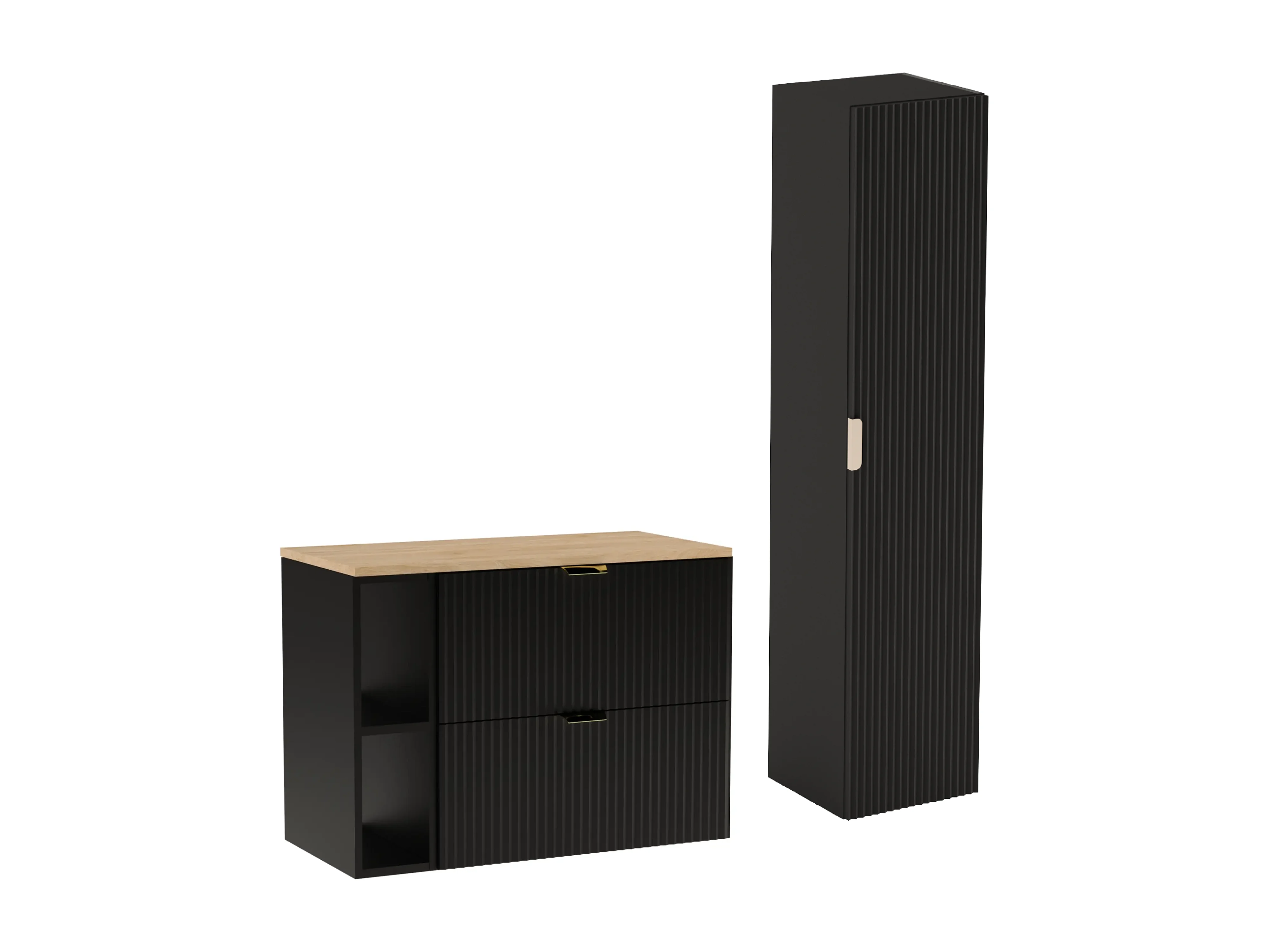 Czarny Zestaw Łazienkowy 80cm Szafka Regał Blat Orzech Słupek Ryflowane Fronty