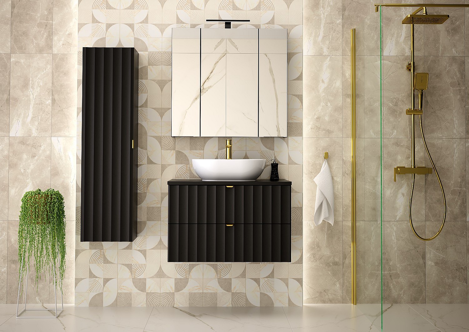 Czarny Zestaw Łazienkowy 80cm Szafka z Blatem Regał Ryflowane Fronty Arcos