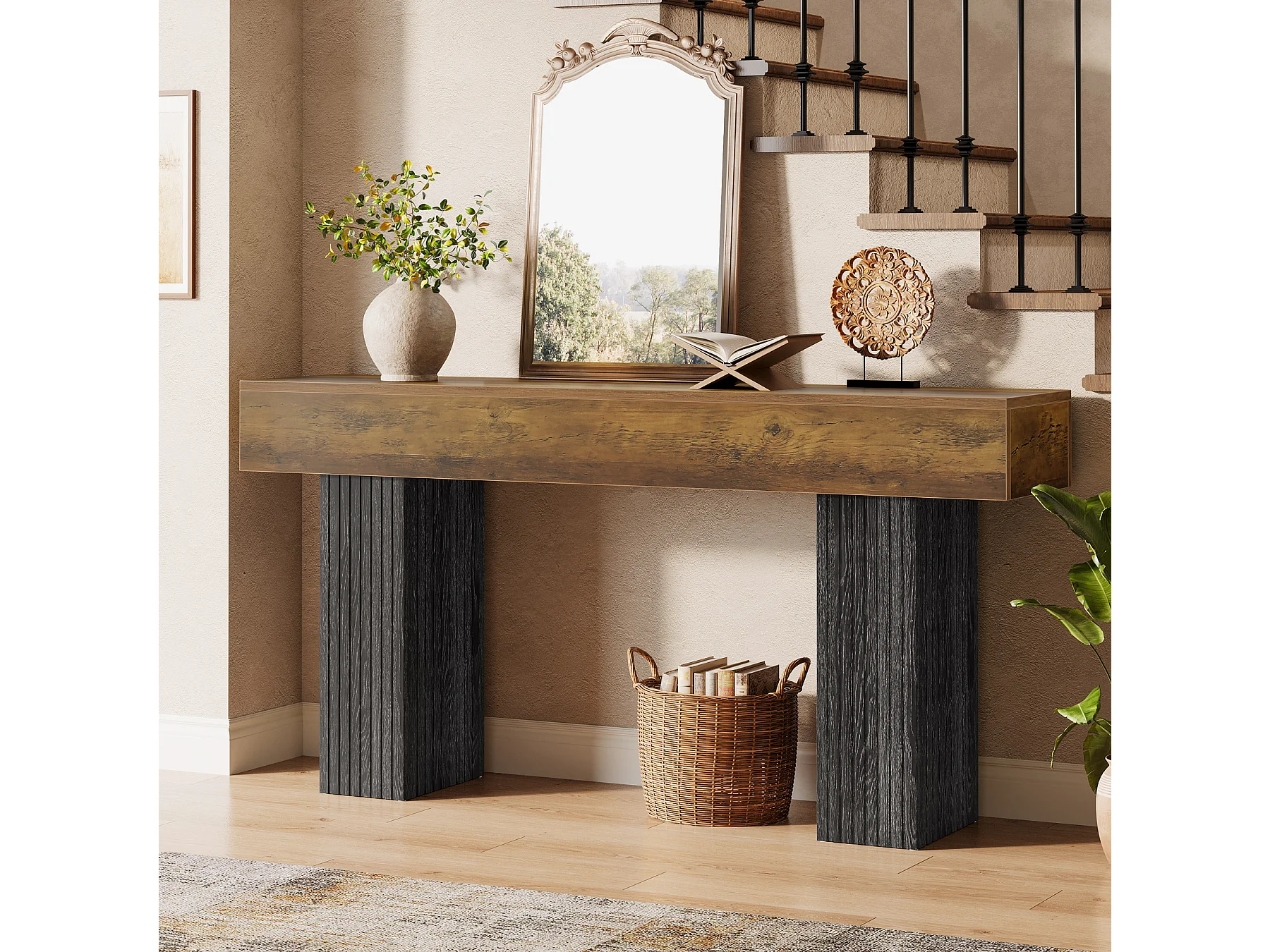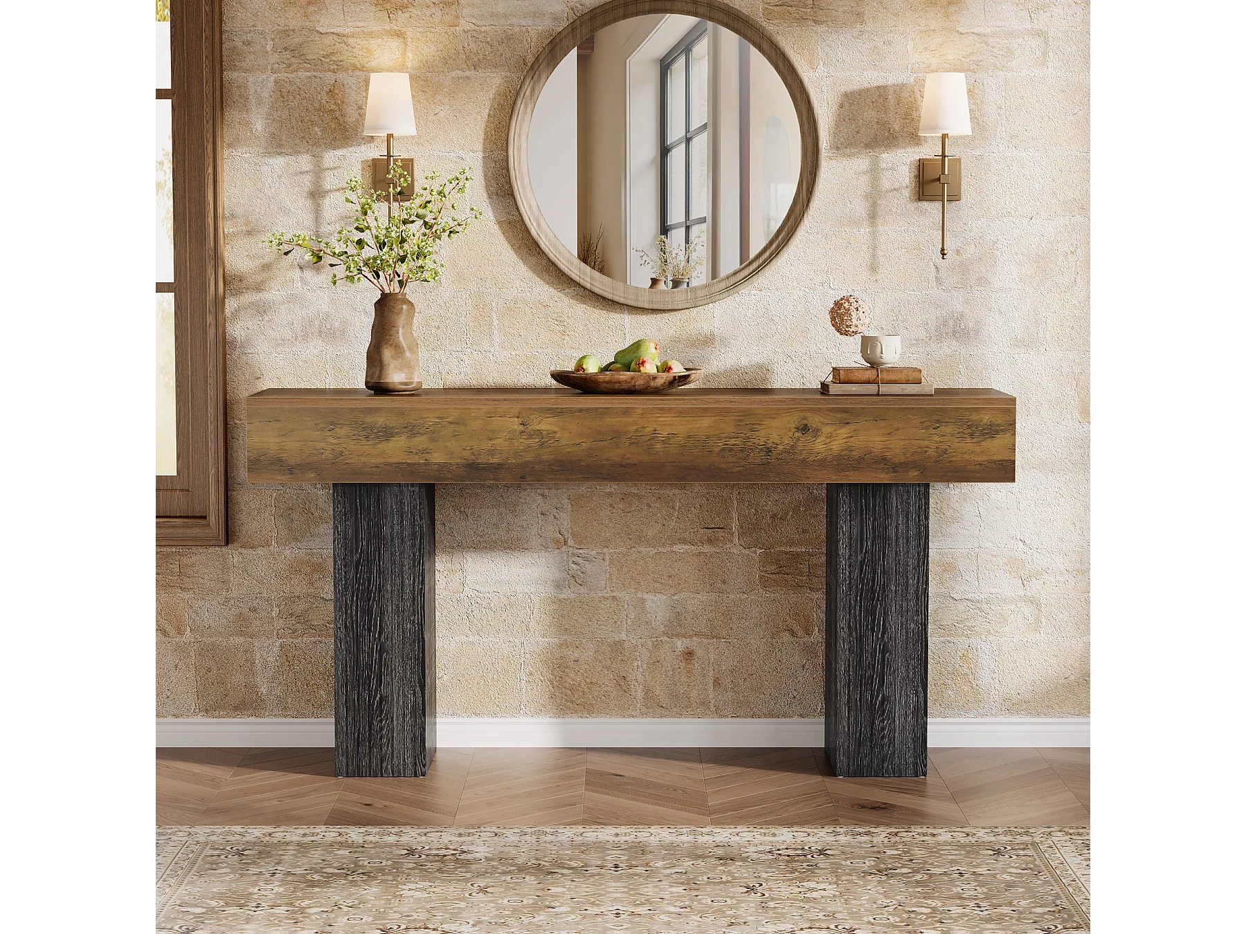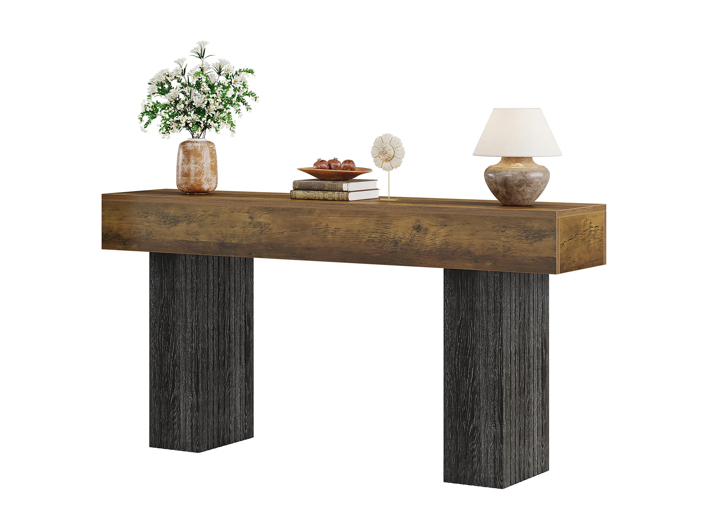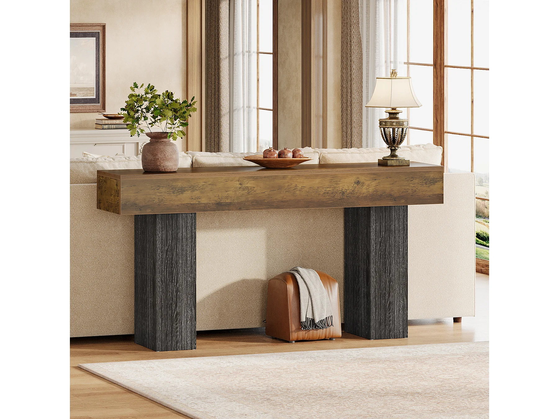 Długi stół do przedpokoju, konsola w stylu rustykalnym za kanapą do przedpokoju, korytarza, salonu