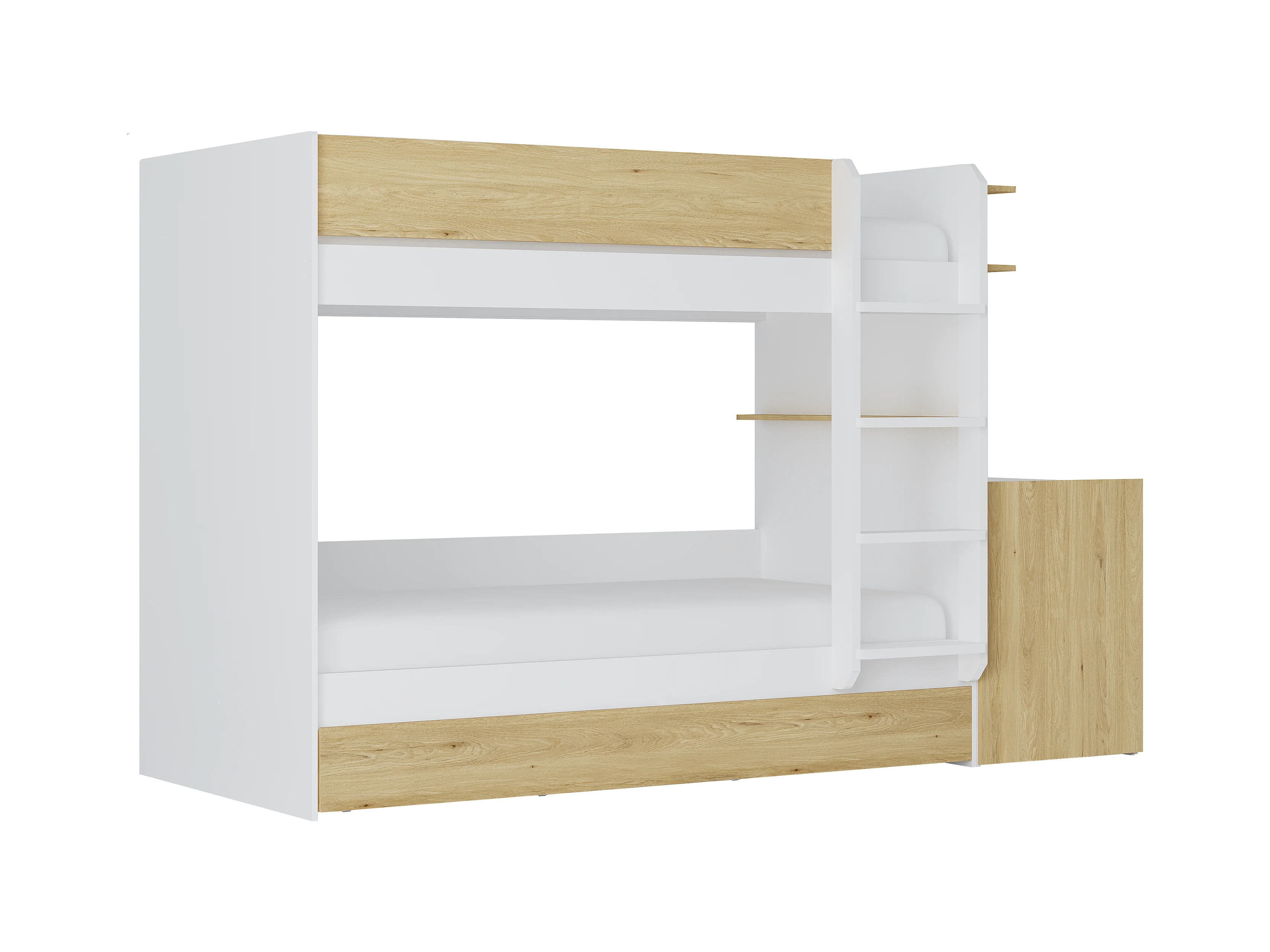 Łóżko piętrowe z wysuwanym posłaniem i 2 biurkami 3 x 90 x 190 cm - Biały i naturalny + Materac - DOMATI