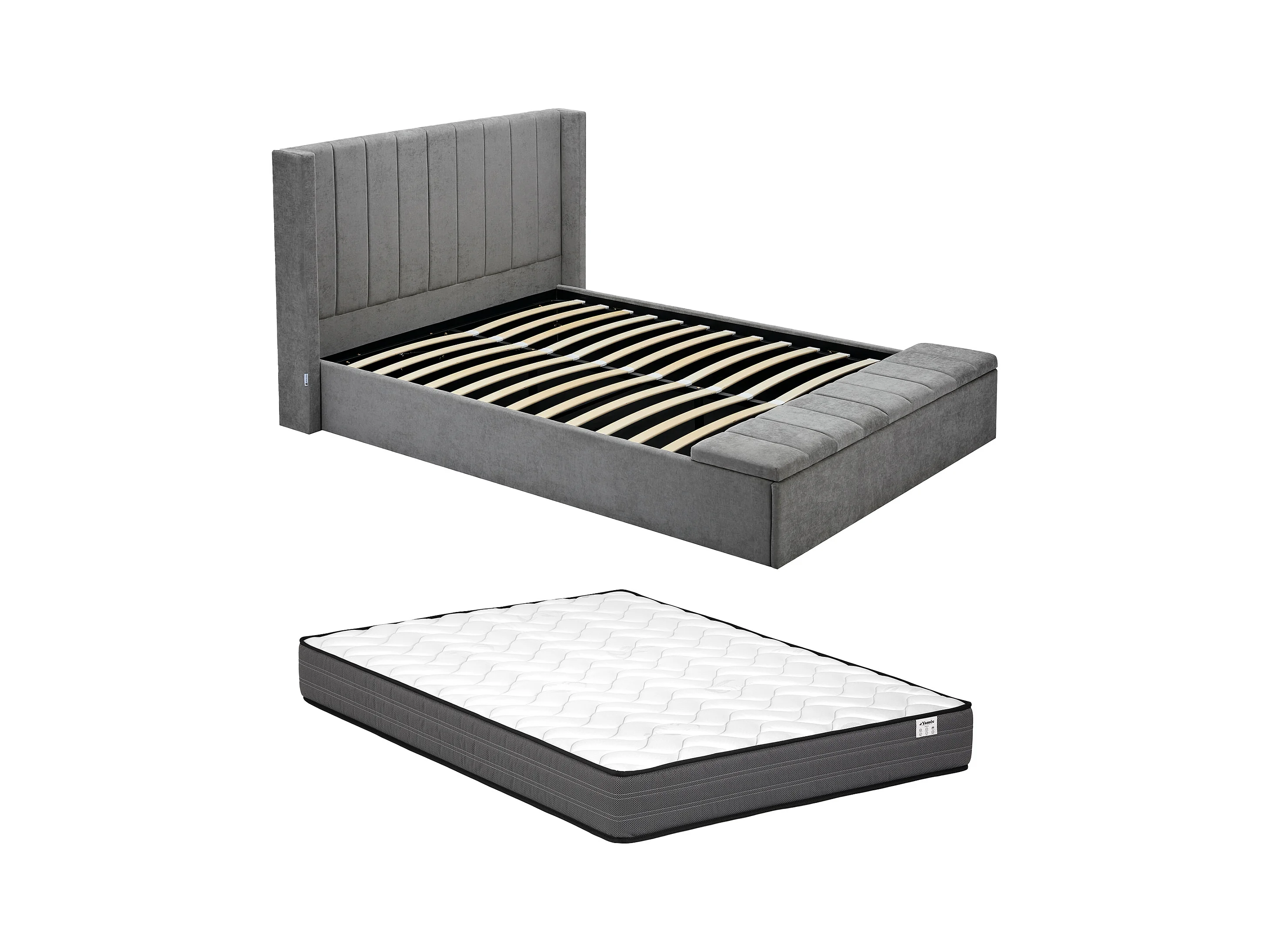 Łóżko ze skrzynią i ławką 140 x 190 cm - Tkanina - Szary + Materac - DOUINO