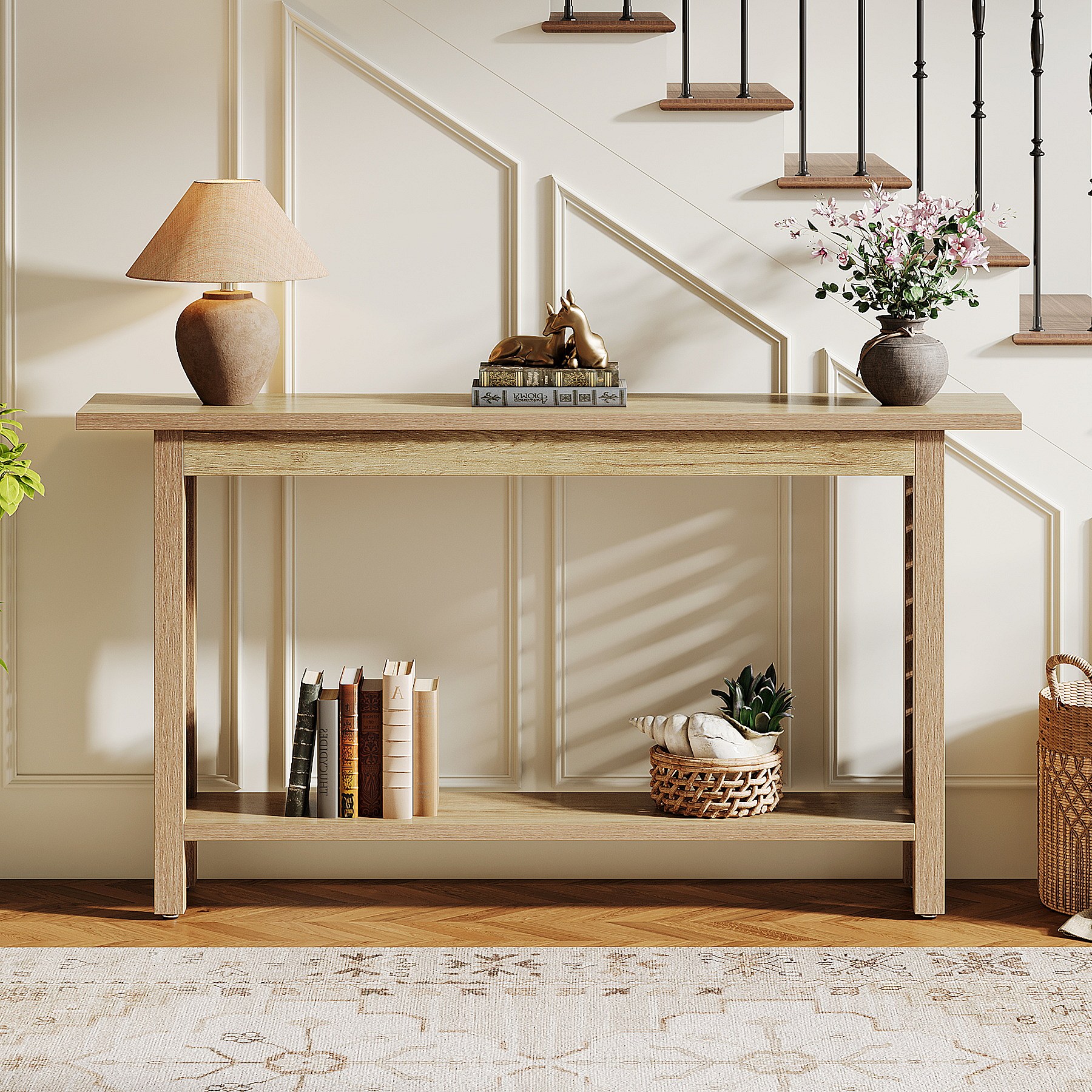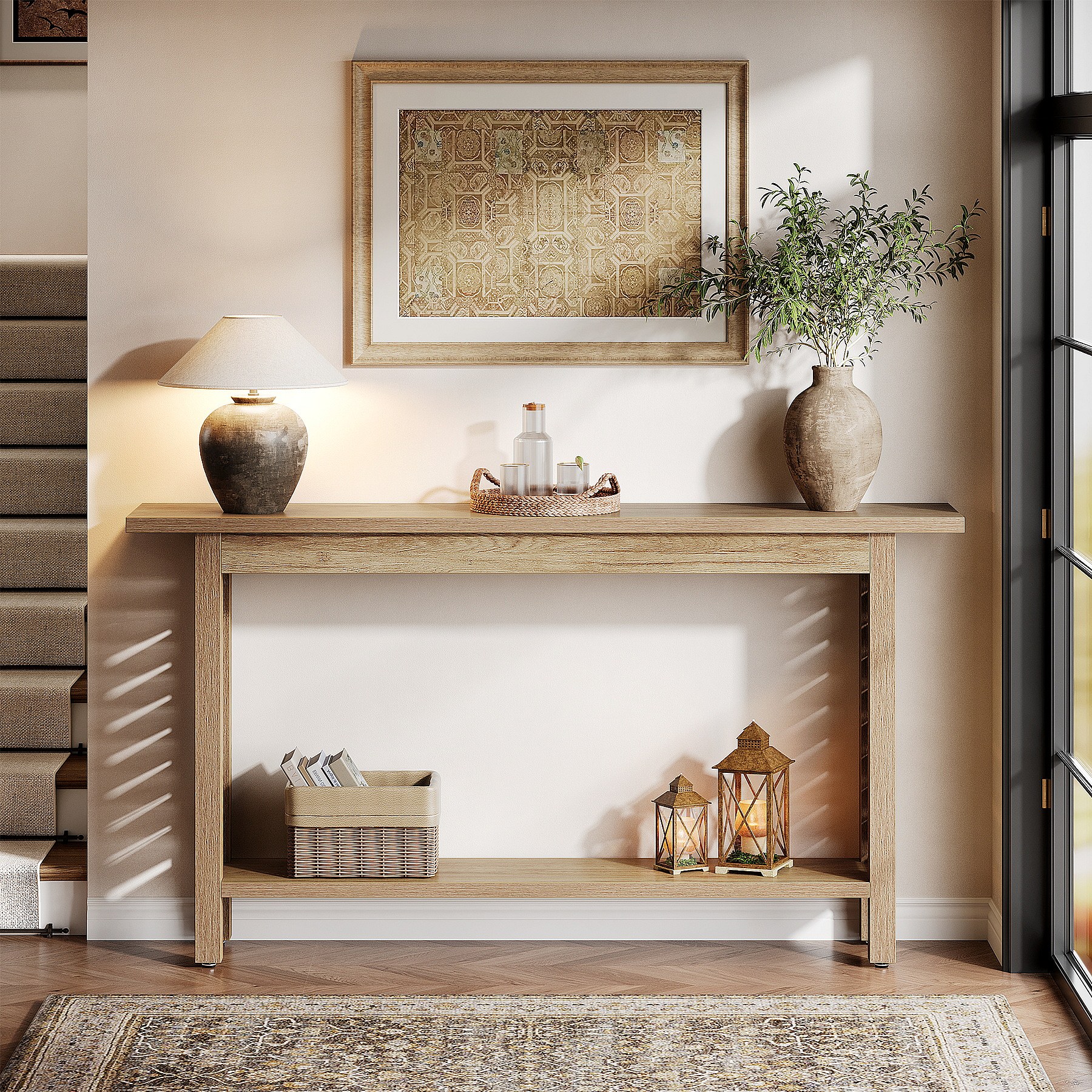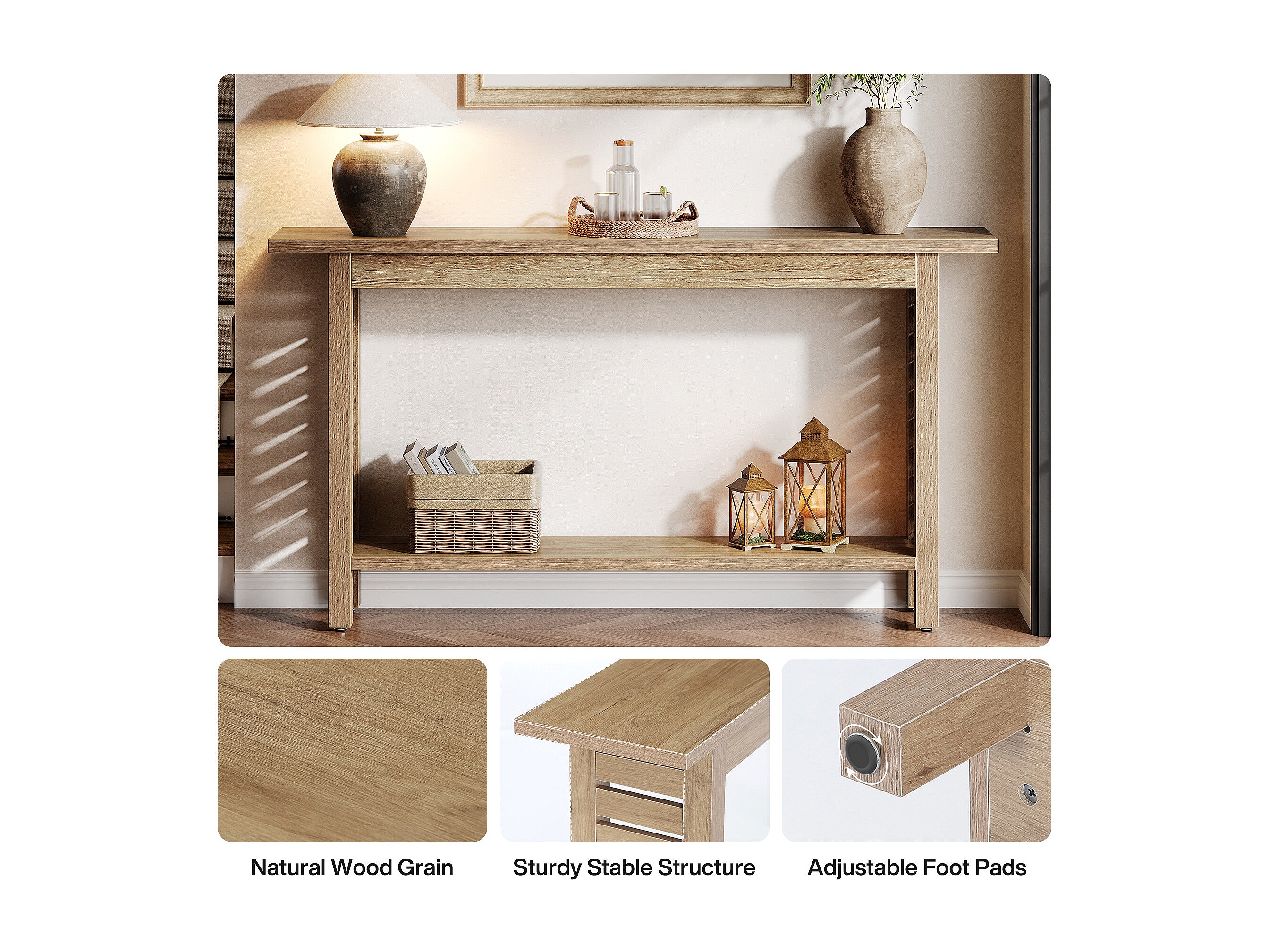 • Dwupoziomowa otwarta konstrukcja do przechowywania: Dwie przestronne, otwarte półki tego dębowego stolika konsolowego zapewniają wszechstronne miejsce do przechowywania koszyków, przedmiotów dekoracyjnych lub codziennych drobiazgów. Z łatwością uporządkuj różnorodne przedmioty codziennego użytku, eksponując jednocześnie ulubione przedmioty na tym stoliku kawowym.