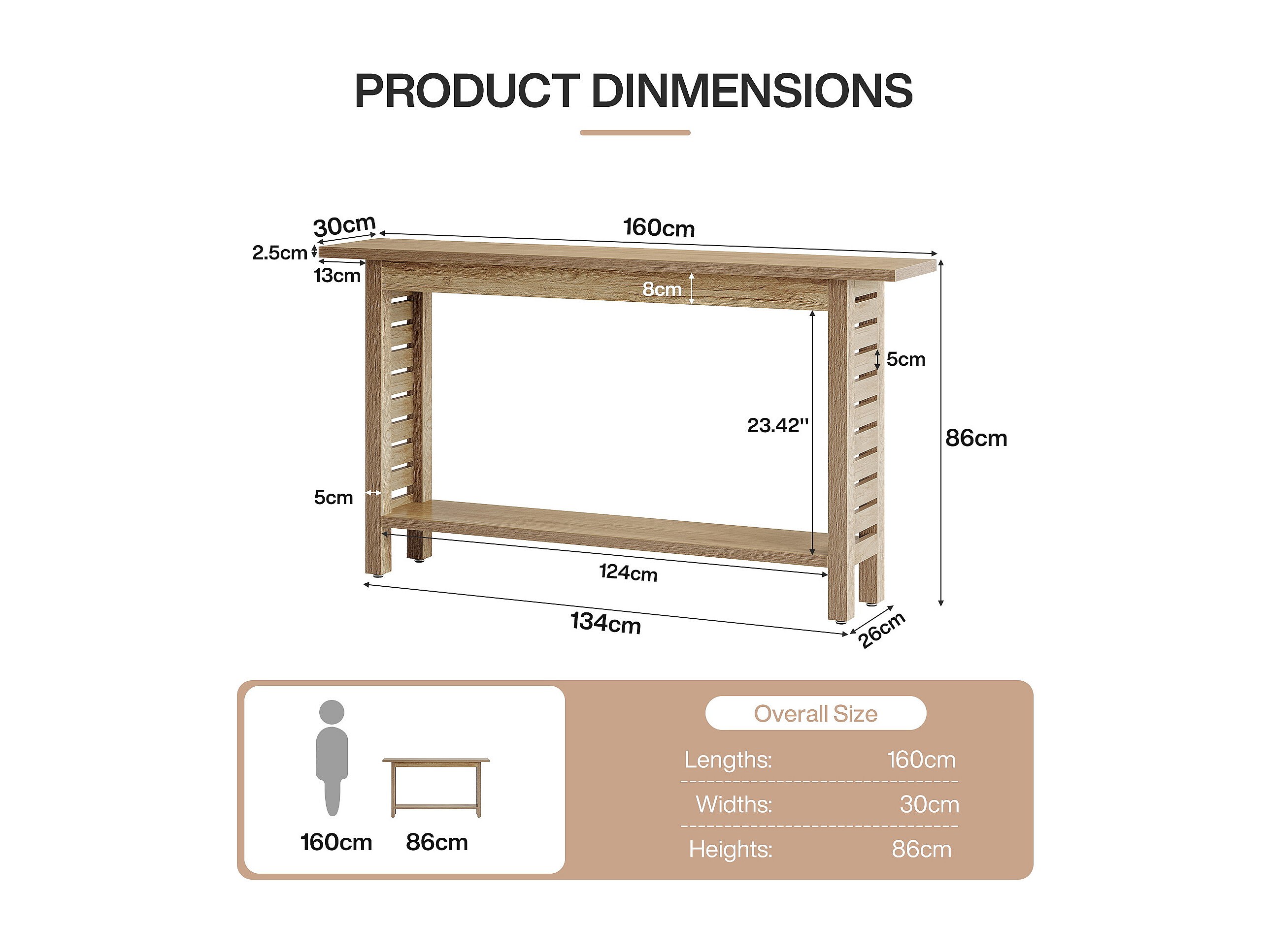 Dwupoziomowy stolik konsolowy w stylu rustykalnym, długi, wąski, z wykończeniem w kolorze drewna, do przedpokoju, 160 cm