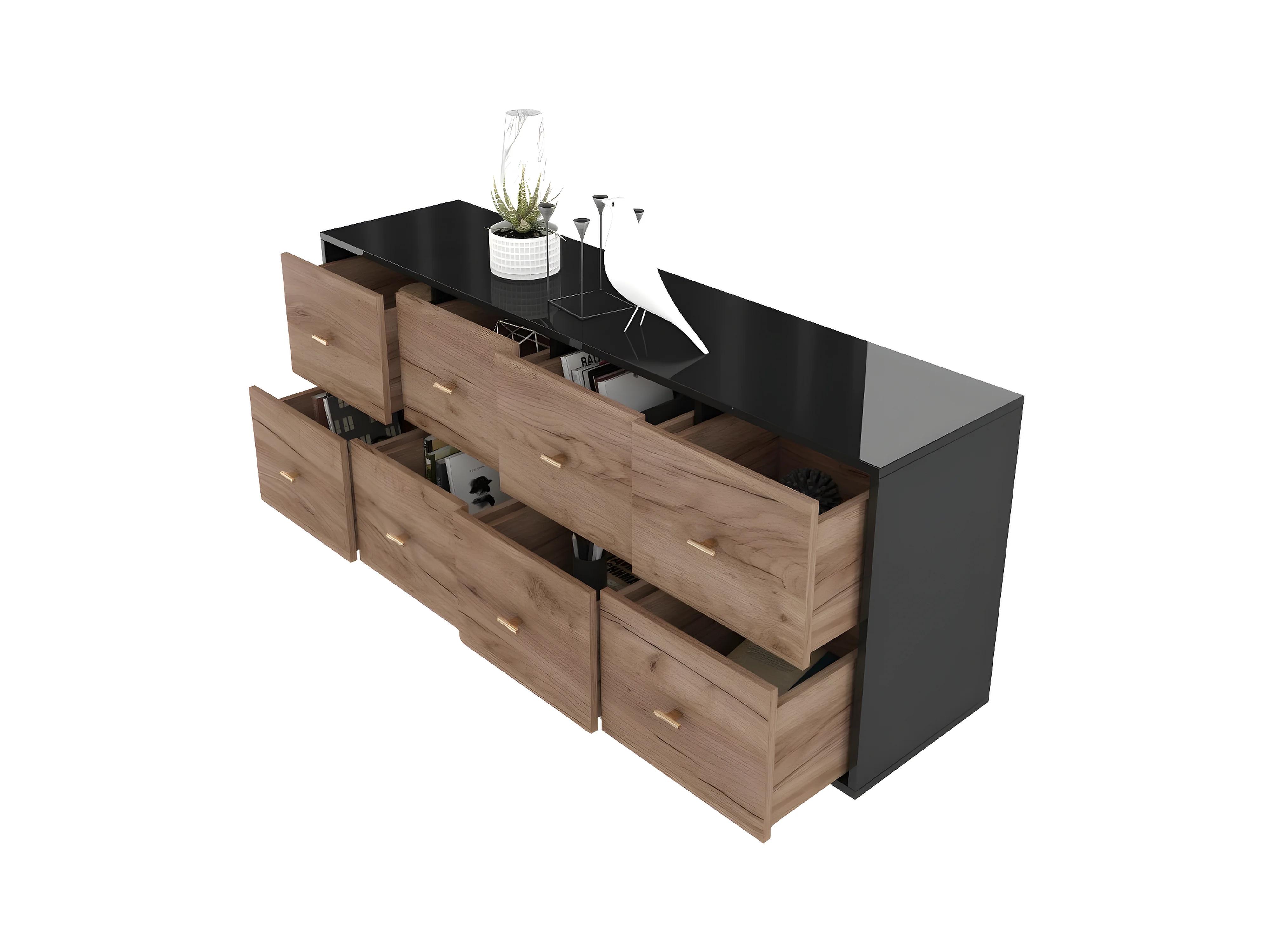 Błyszczący czarny bufet Dancan ARTEMISA z dodatkami w kolorze złota - Nowoczesny i elegancki design z systemem Push to Open