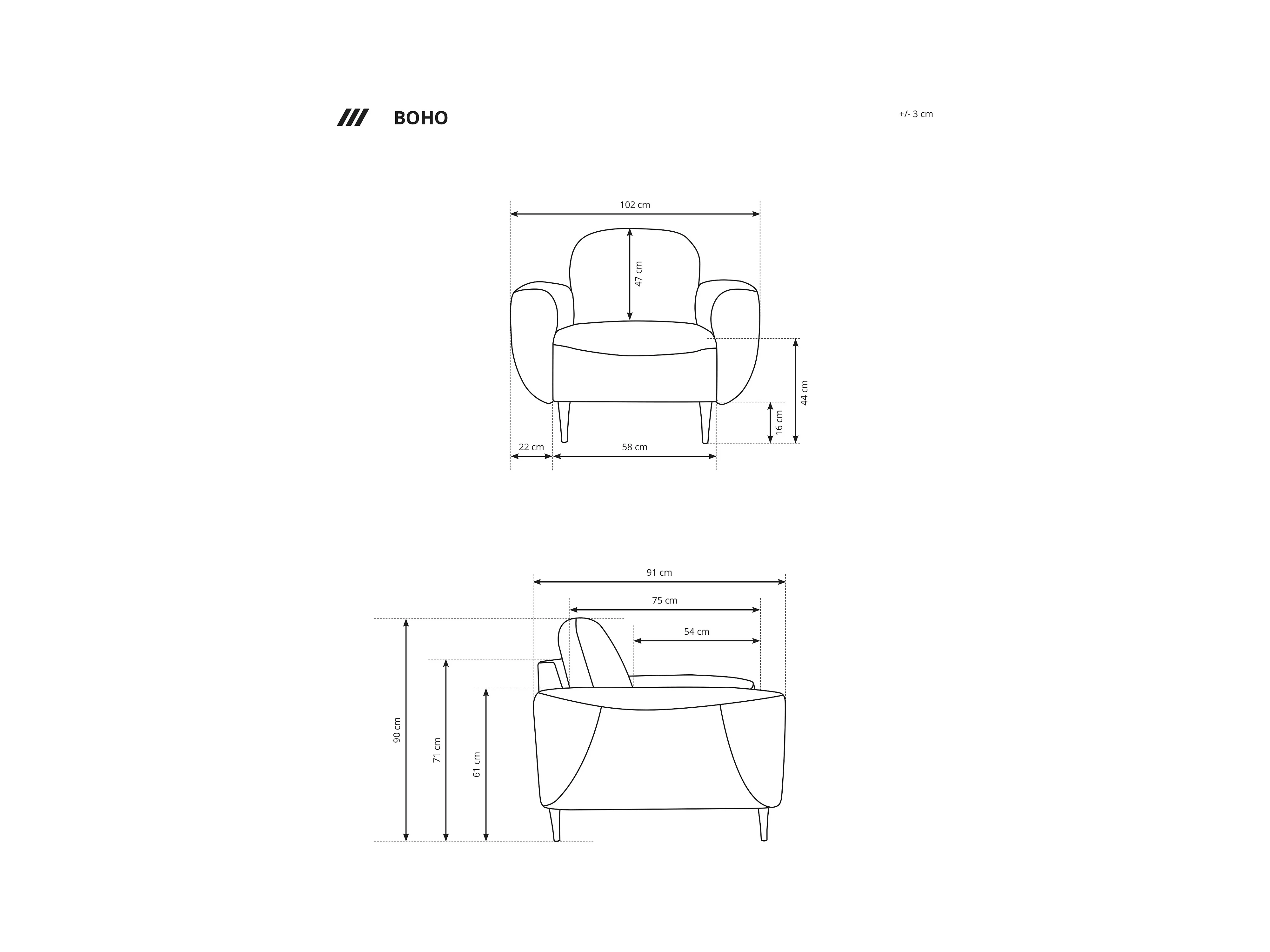 Fotel BOHO nowoczesny elegancki z drewnianymi nogami, z oparciem i podłokietnikami, do salonu i biura, rozmiar: 90x91x102cm GRAFITOWY