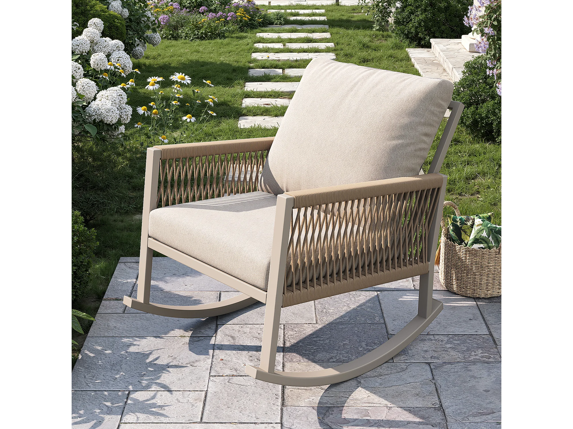 Fotel bujany ogrodowy - 65 x 79 x 78 cm - metalowa rama - z poduszkami - metal - beżowy