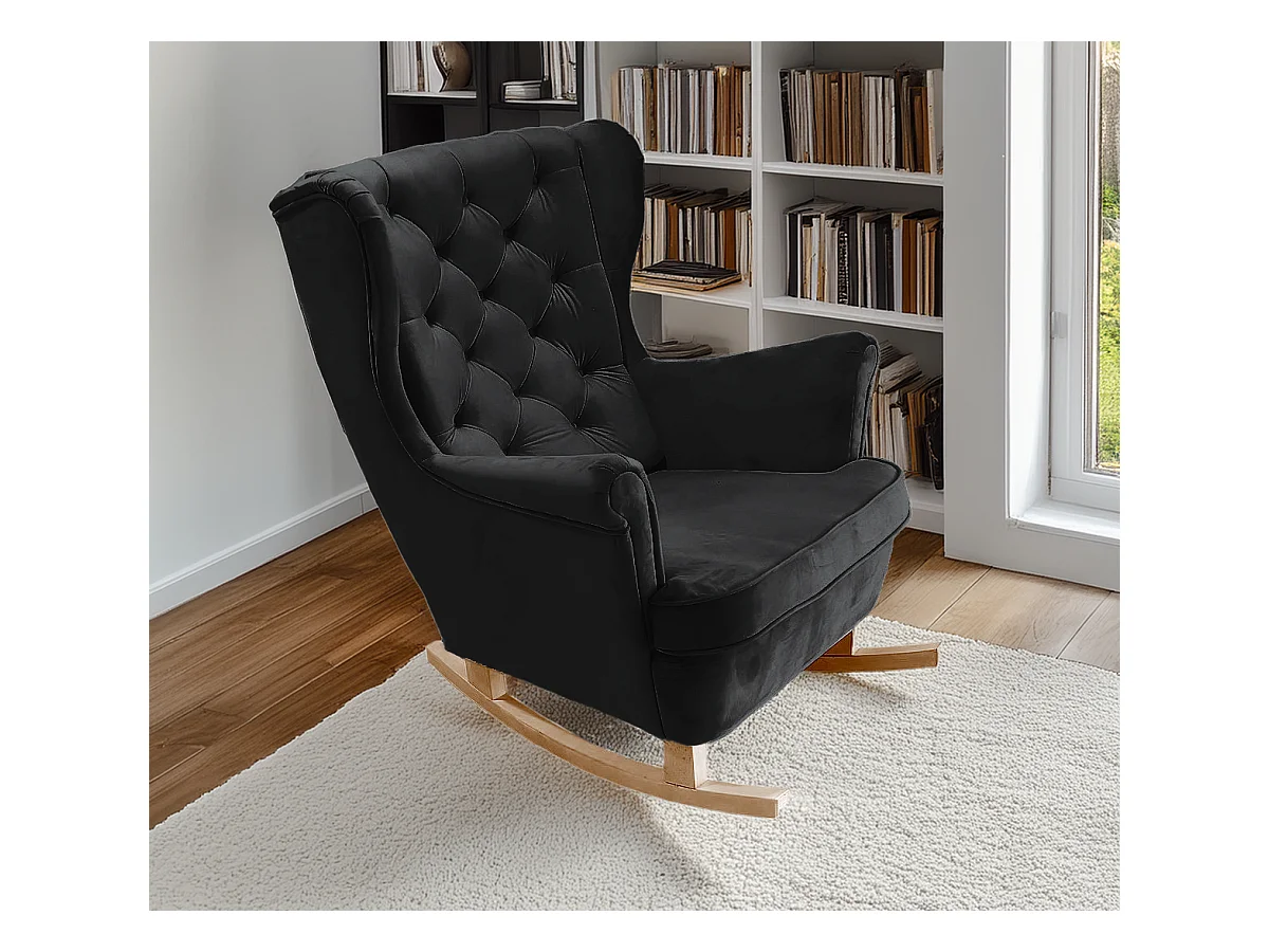 Tapicerowany fotel bujany, plusz, czarny fotel bujany z wysuwanym podnóżkiem, metalowa rama