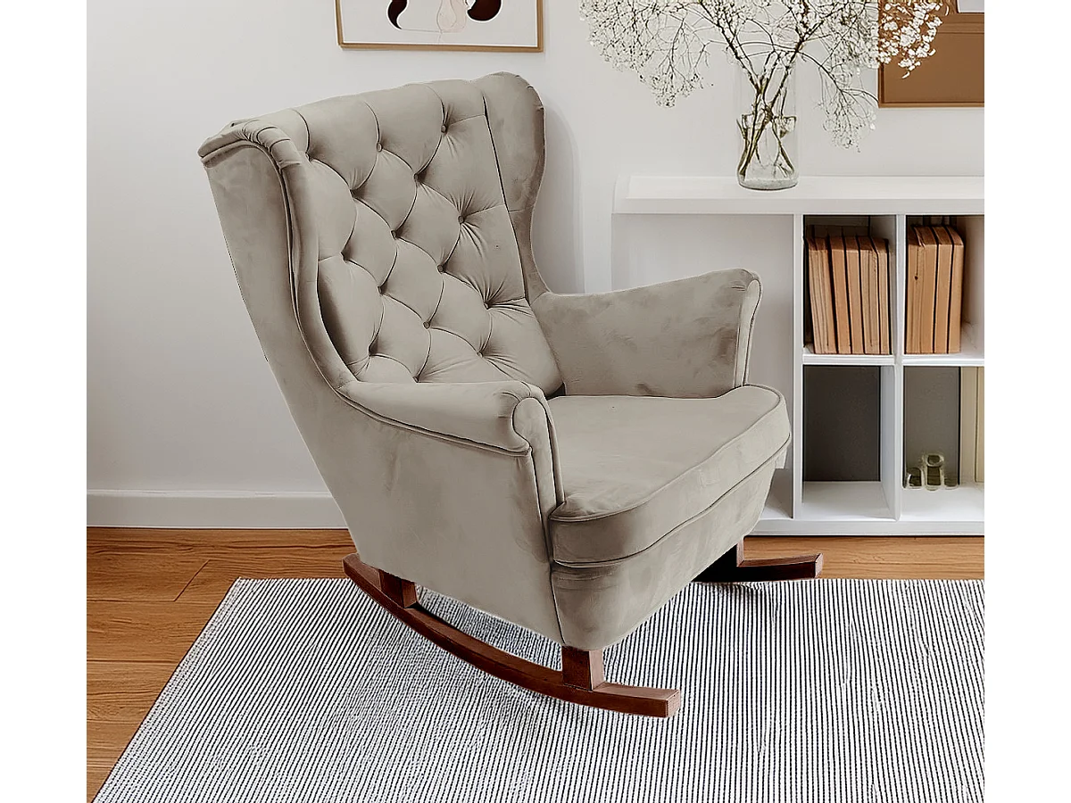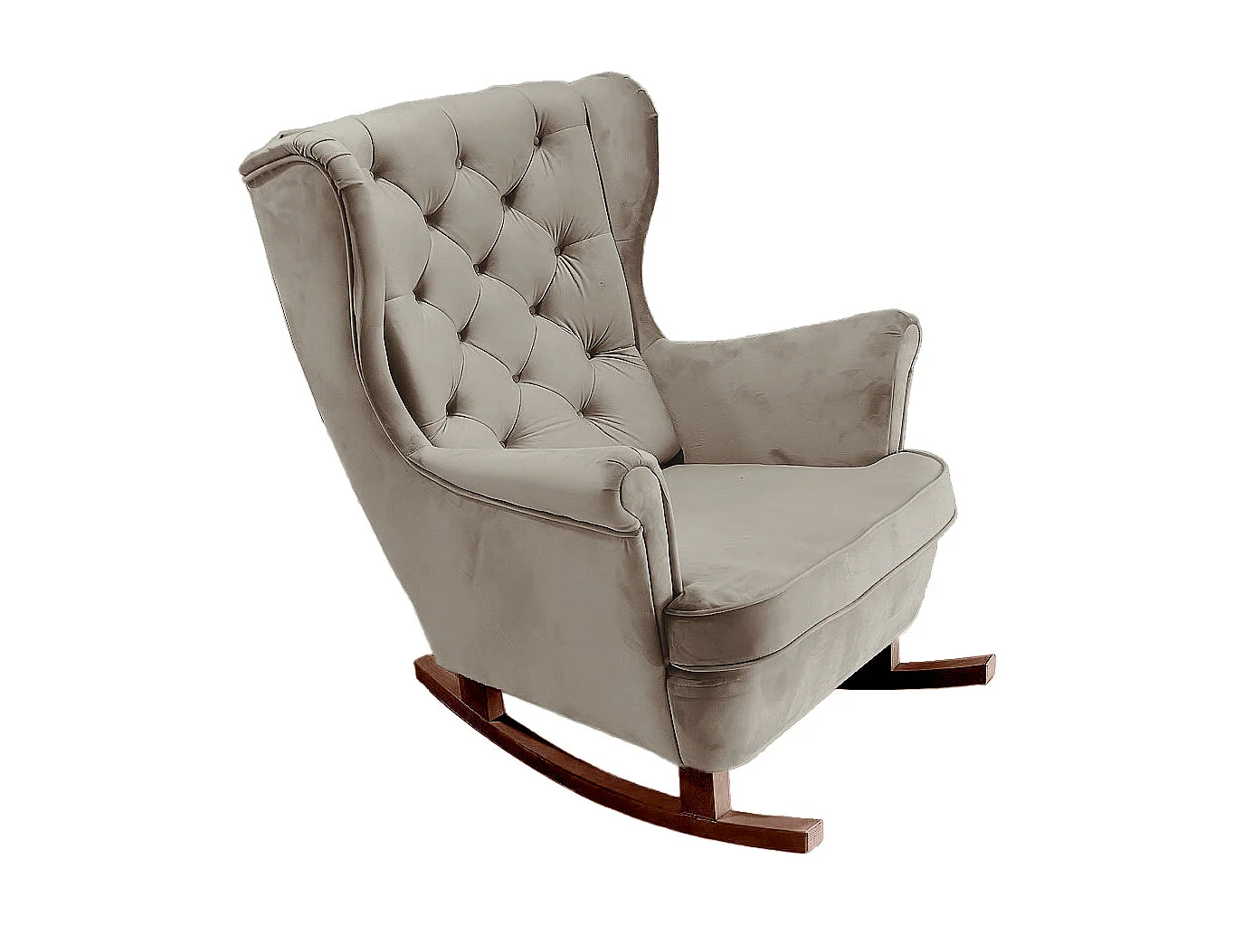 Nowoczesny fotel bujany, jasnoszary plusz, fotel bujany z podłokietnikami i oparciem, odpowiedni do salonu i sypialni