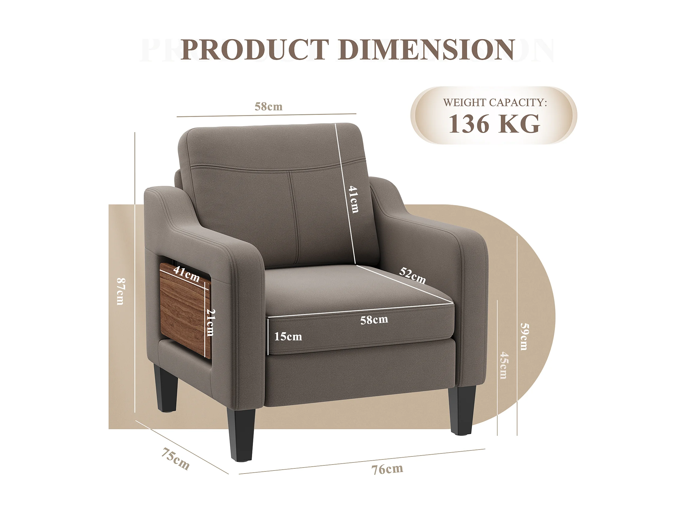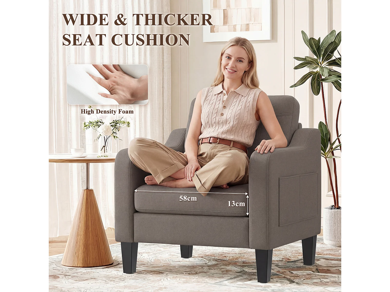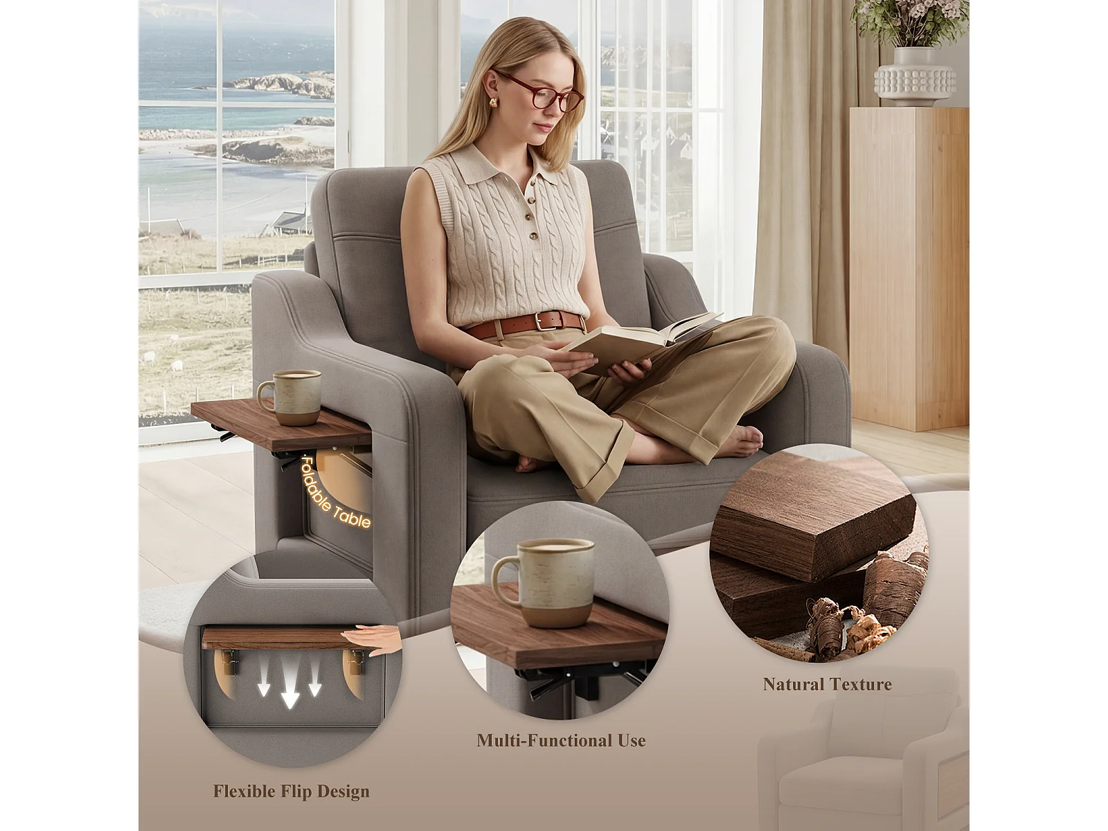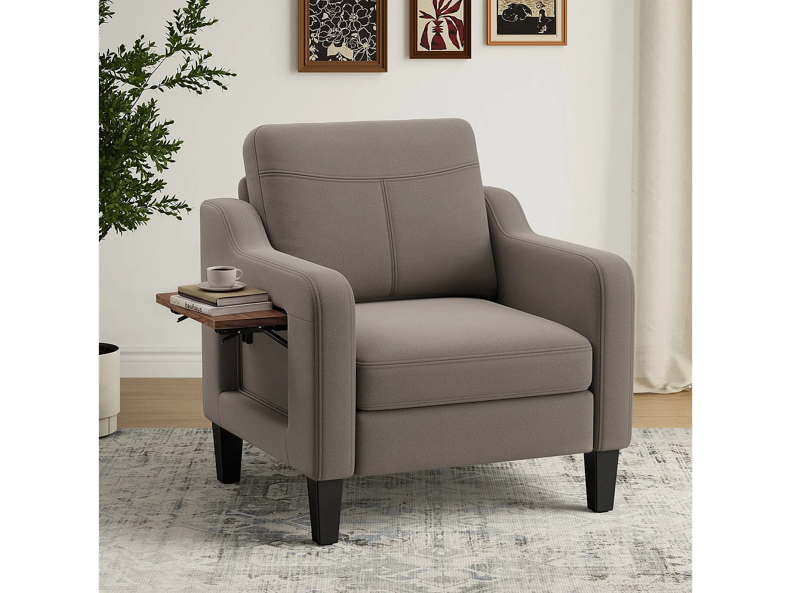 Fotel z tkaniny lnianej z rozkładanym stolikiem i boczną kieszenią, wypełnienie z pianki memory, lekki i łatwy do przenoszenia, brązowy