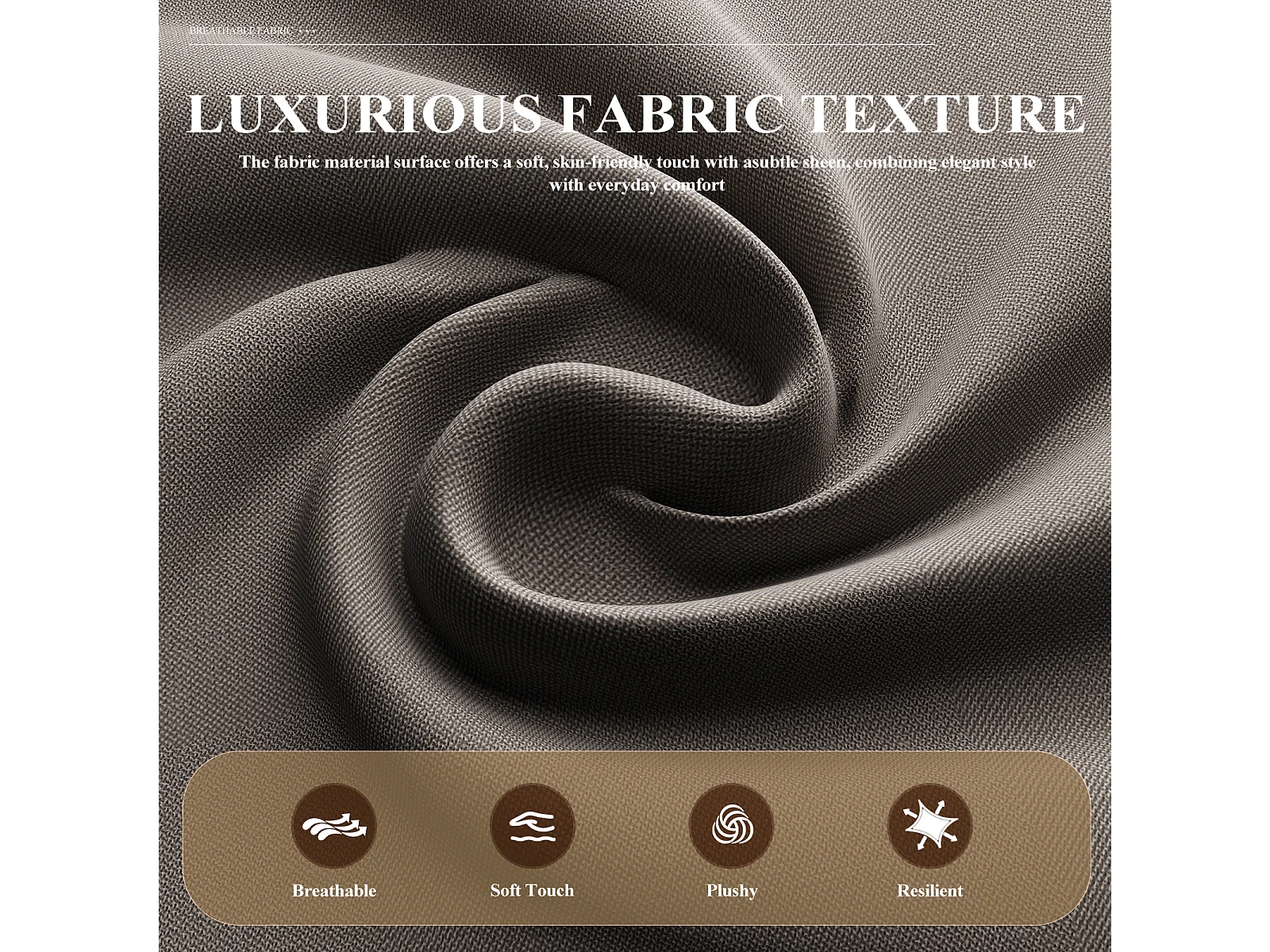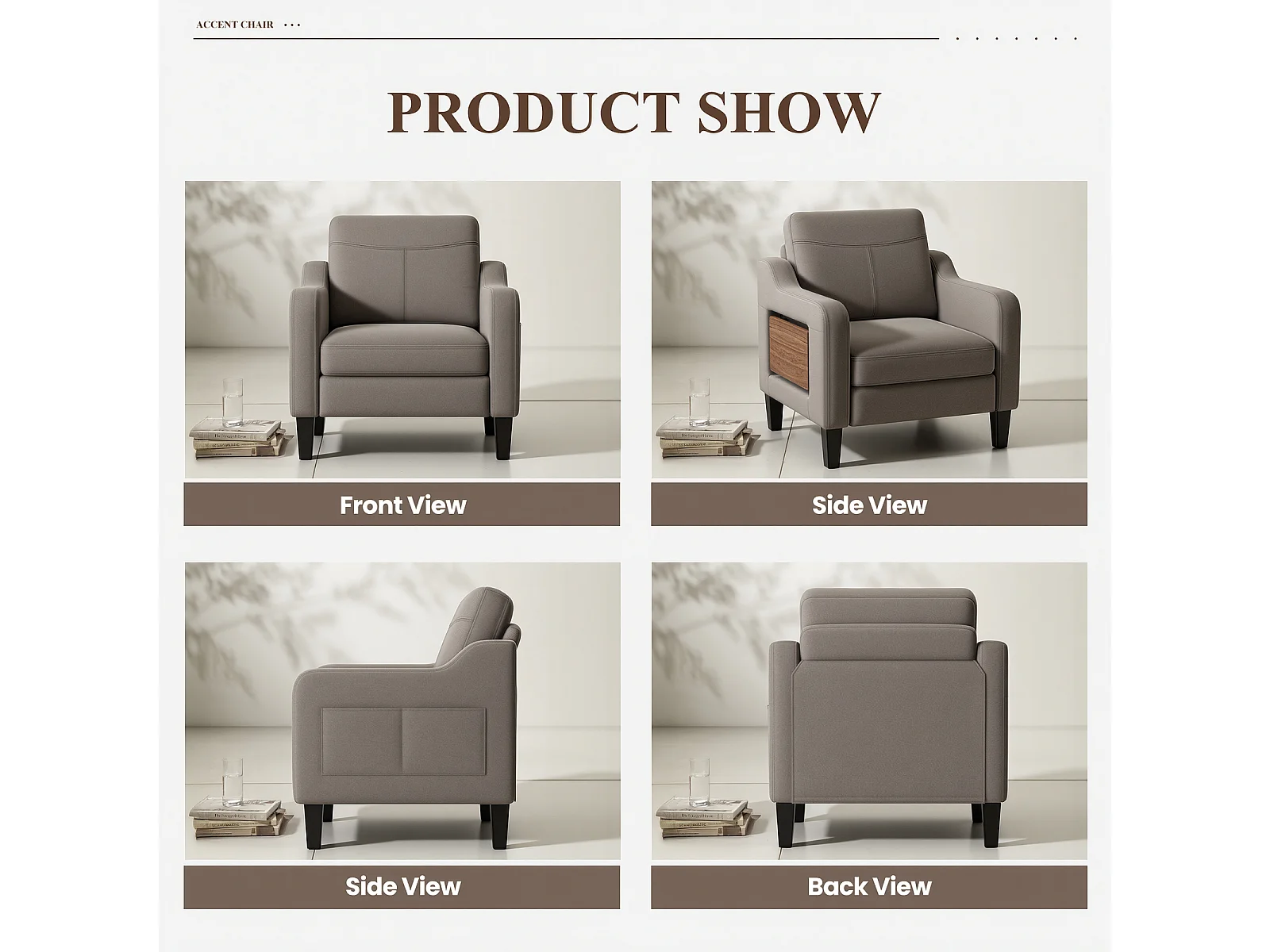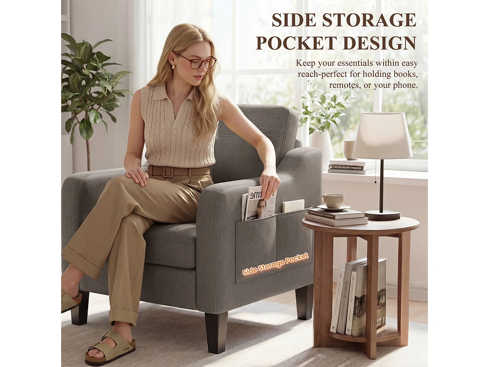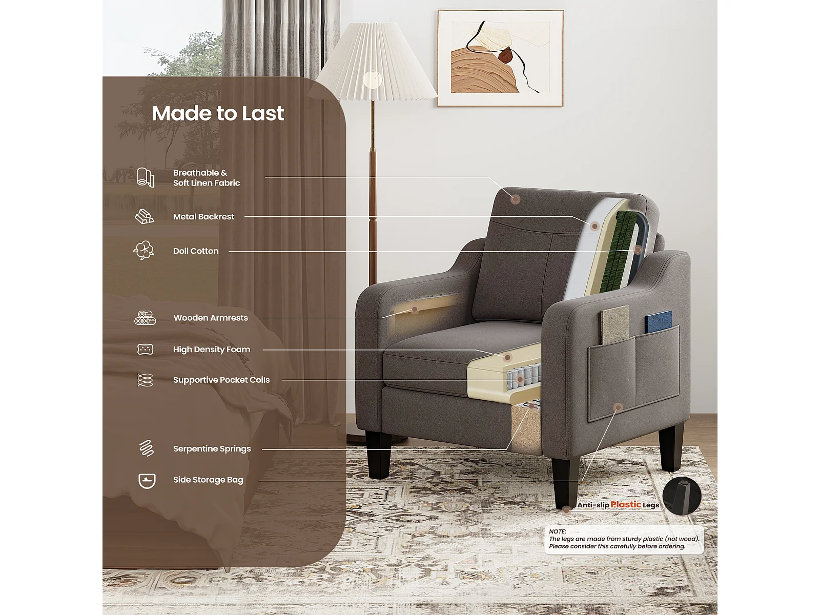 Fotel z tkaniny lnianej z rozkładanym stolikiem i boczną kieszenią, wypełnienie z pianki memory, lekki i łatwy do przenoszenia, brązowy