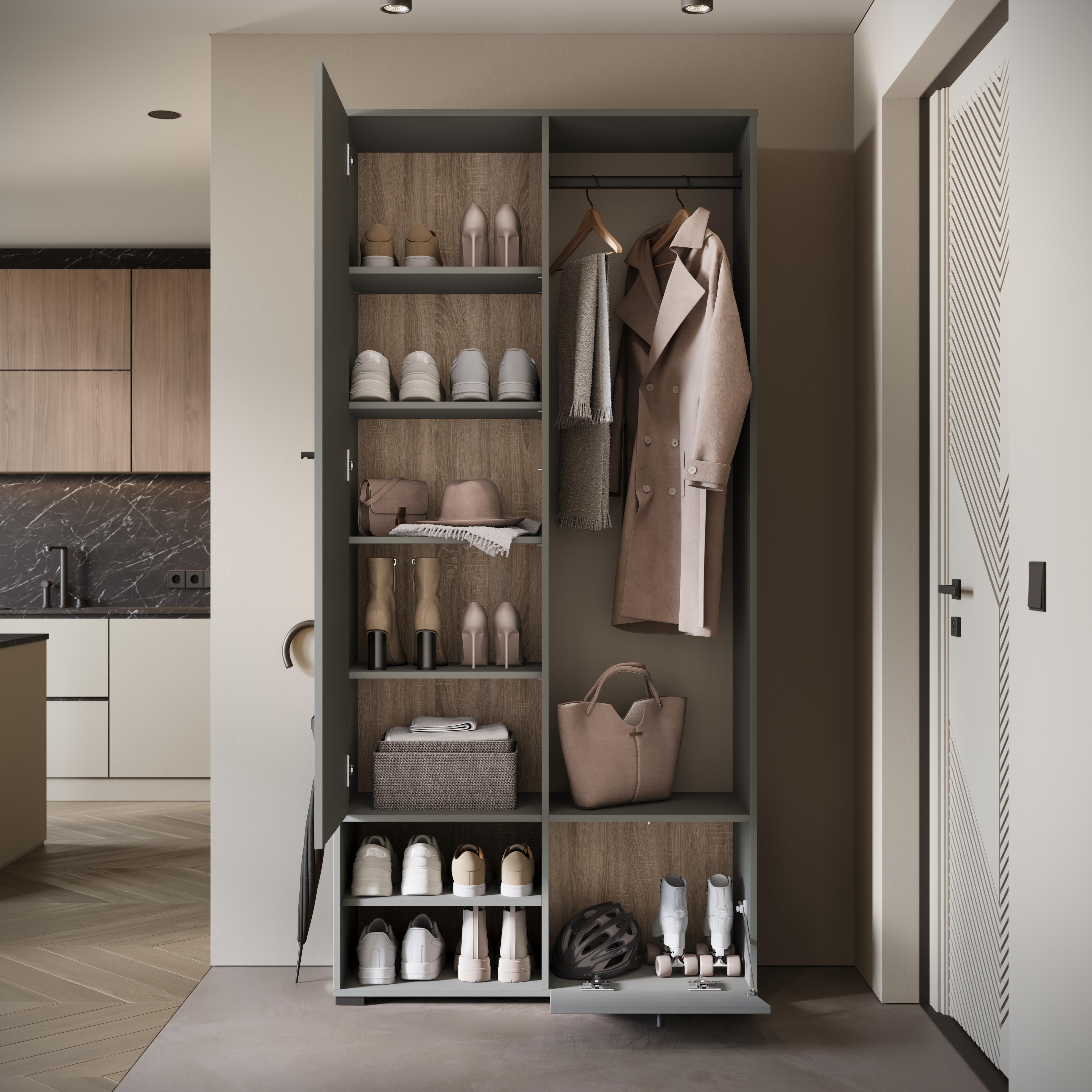 • Przemyślany układ: półki, drążek i dolna klapa na buty