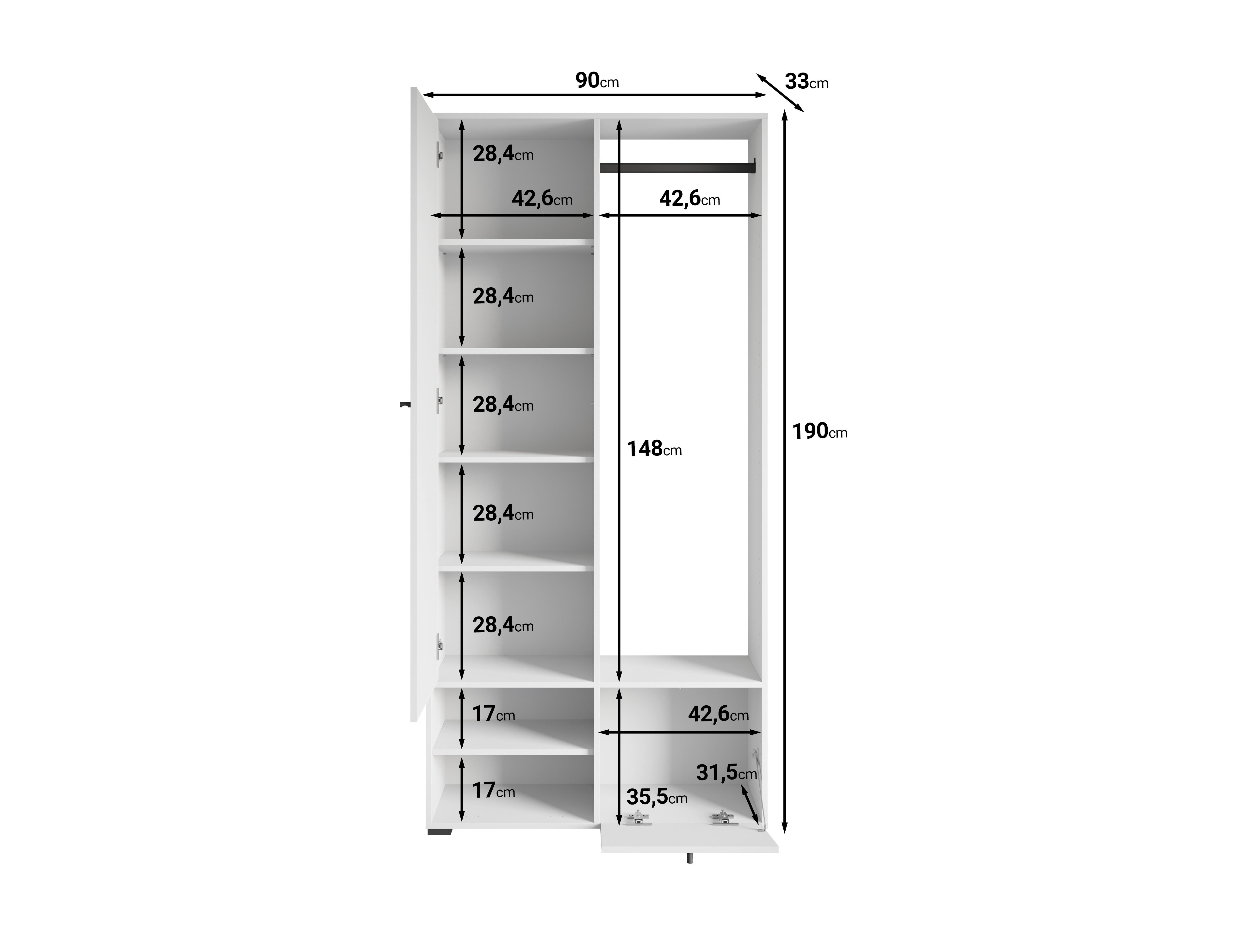 • Półki po lewej stronie: zamknięte – wys. 28,4 cm x szer. 42,6 cm; otwarte – 17 cm x 42,6 cm