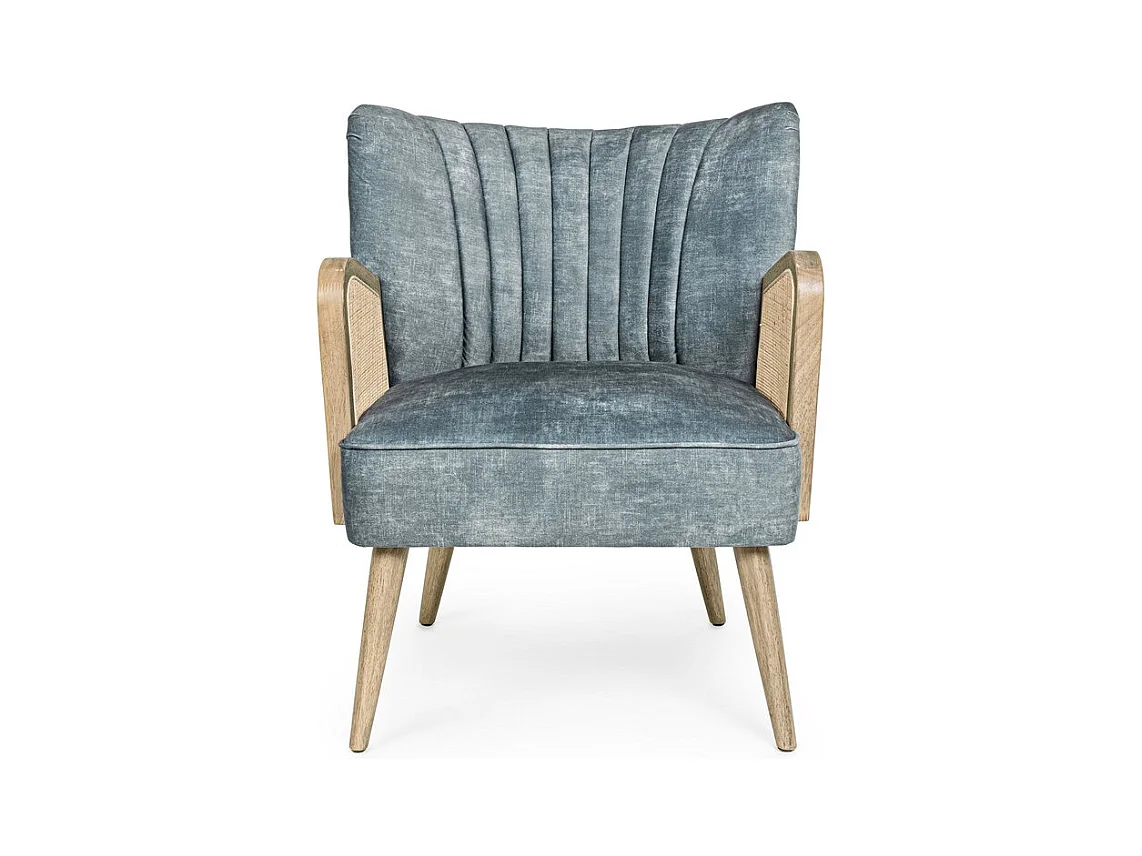 Jasnoniebieski fotel z tkaniny z efektem aksamitu, drewniane nogi i podłokietniki - VIRNA