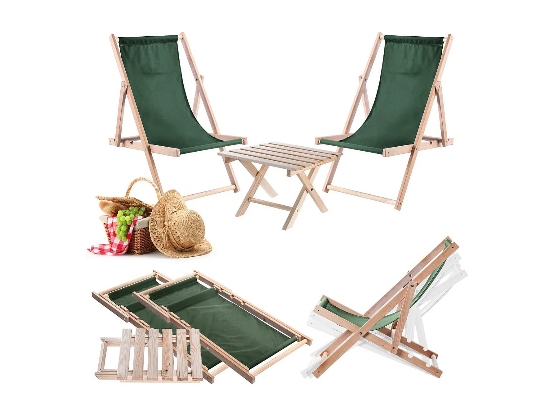KADAX Zestaw stolik kawowy do leżaków Anjouin naturalny + 2 leżaki zielone butelkowe