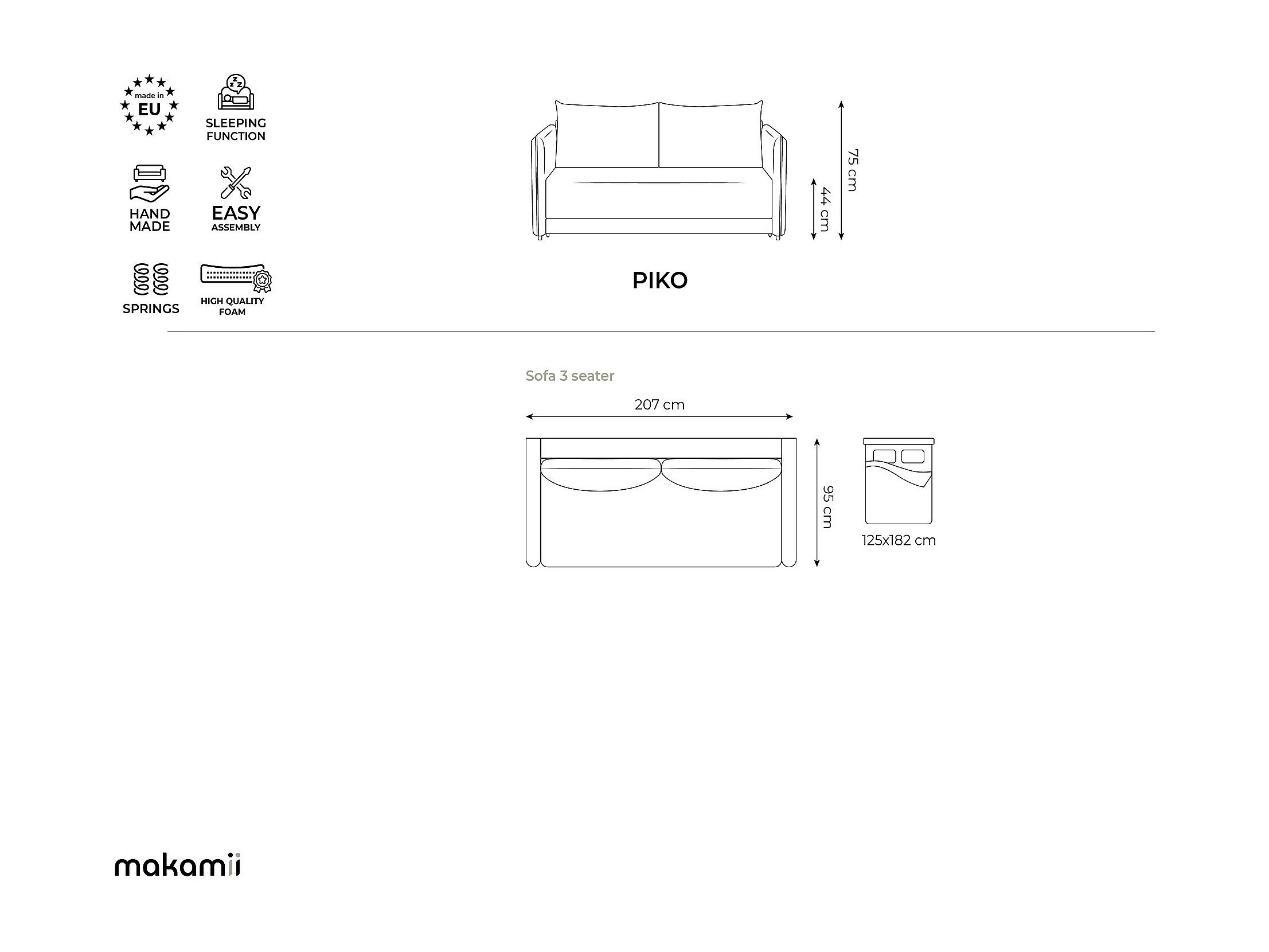 3-osobowa sofa Piko z funkcją spania to idealne rozwiązanie dla każdego, kto szuka komfortu, stylu i funkcjonalności w jednym meblu. W ciągu dnia przestronne siedzisko i miękka tapicerka z pianki HR zachęcają do relaksu. Wieczorem w mgnieniu oka można przekształcić ją w łóżko dla gości - idealne rozwiązanie dla nocujących gości lub małych mieszkań, w których trzeba zoptymalizować przestrzeń. Wysokiej jakości szenilowe obicie jest nie tylko przyjemnie miękkie, ale także wyjątkowo łatwe w czyszczeniu dzięki nowoczesnej technologii blokowania wody: płyny nie wnikają natychmiast i można je łatwo zetrzeć. Dzięki eleganckiej strukturze i wysokiej trwałości (60 000 cykli Martindale) sofa zachowuje swój elegancki wygląd przez długi czas, nawet przy codziennym użytkowaniu. Solidna rama w połączeniu ze sprężynami falistymi i trwałą pianką HR zapewnia wysoki poziom komfortu siedzenia i stałą stabilność wymiarową. Dzięki nowoczesnemu designowi, kompaktowym rozmiarom i praktycznej funkcjonalności, sofa Piko doskonale pasuje do stylowych salonów, mieszkań czy pokoi gościnnych.