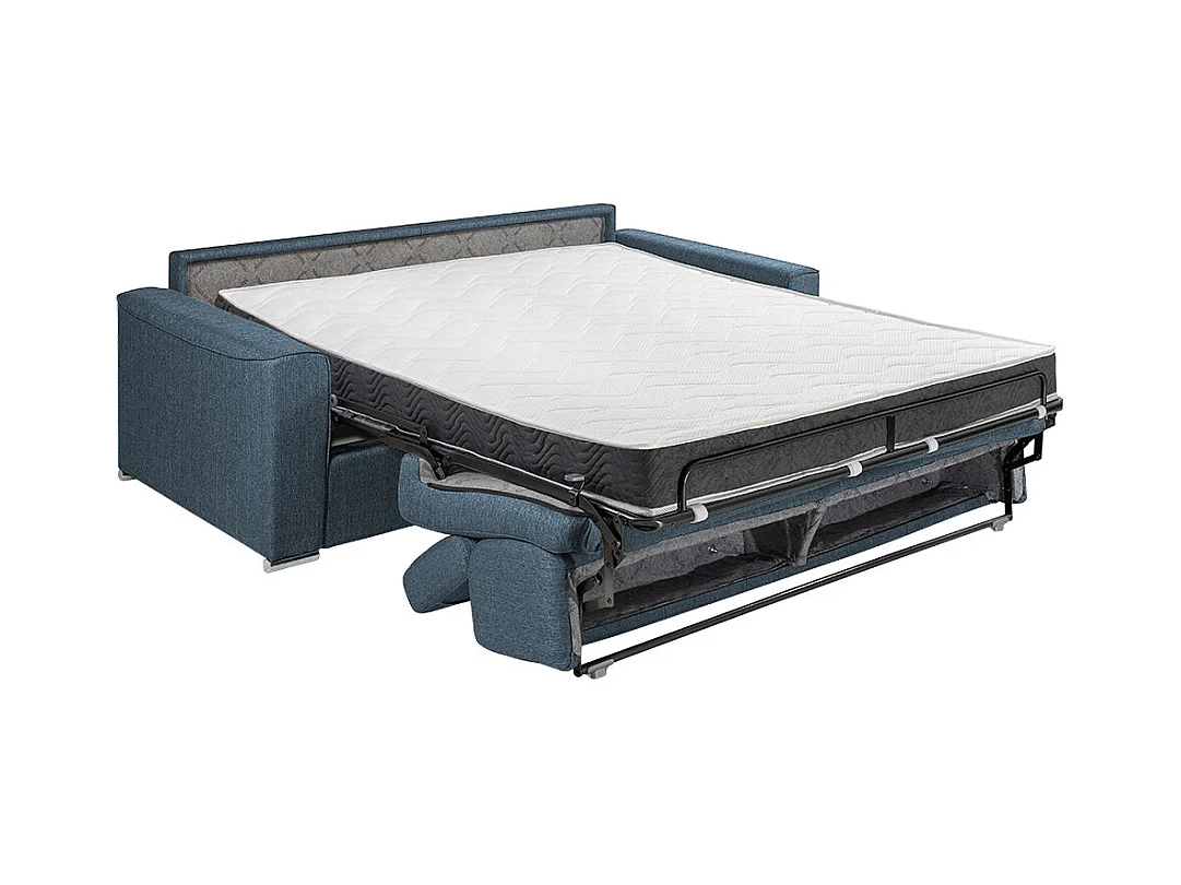 Kanapa rozkładana 3-osobowa VIZIR typu express z tkaniny – kolor niebieski – miejsce do spania z szerokimi listewkami 140 cm – materac 16 cm z pamięcią kształtu