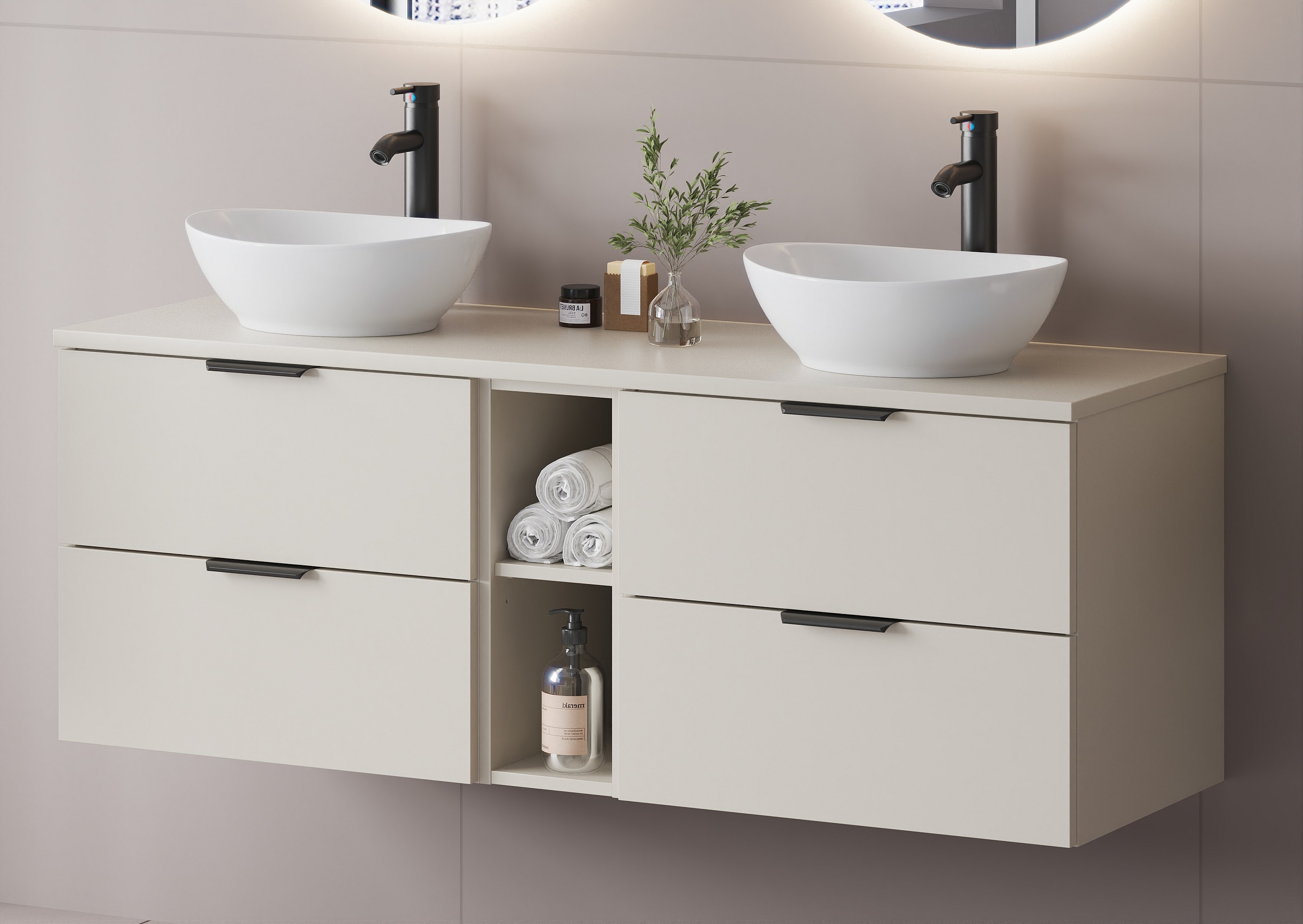 Uwagę przykuwają minimalistyczne, gładkie fronty oraz wyjątkowy akcent w postaci uchwytów – do każdej szafki dołączony jest komplet aż trzech ich wariantów kolorystycznych: czarny, złoty oraz chrom. To rozwiązanie daje pełną swobodę w dopasowaniu mebli do wybranej armatury i stylu wnętrza. Wszystkie elementy kolekcji są wiszące i wyposażone w system cichego domyku, co zwiększa komfort codziennego użytkowania.