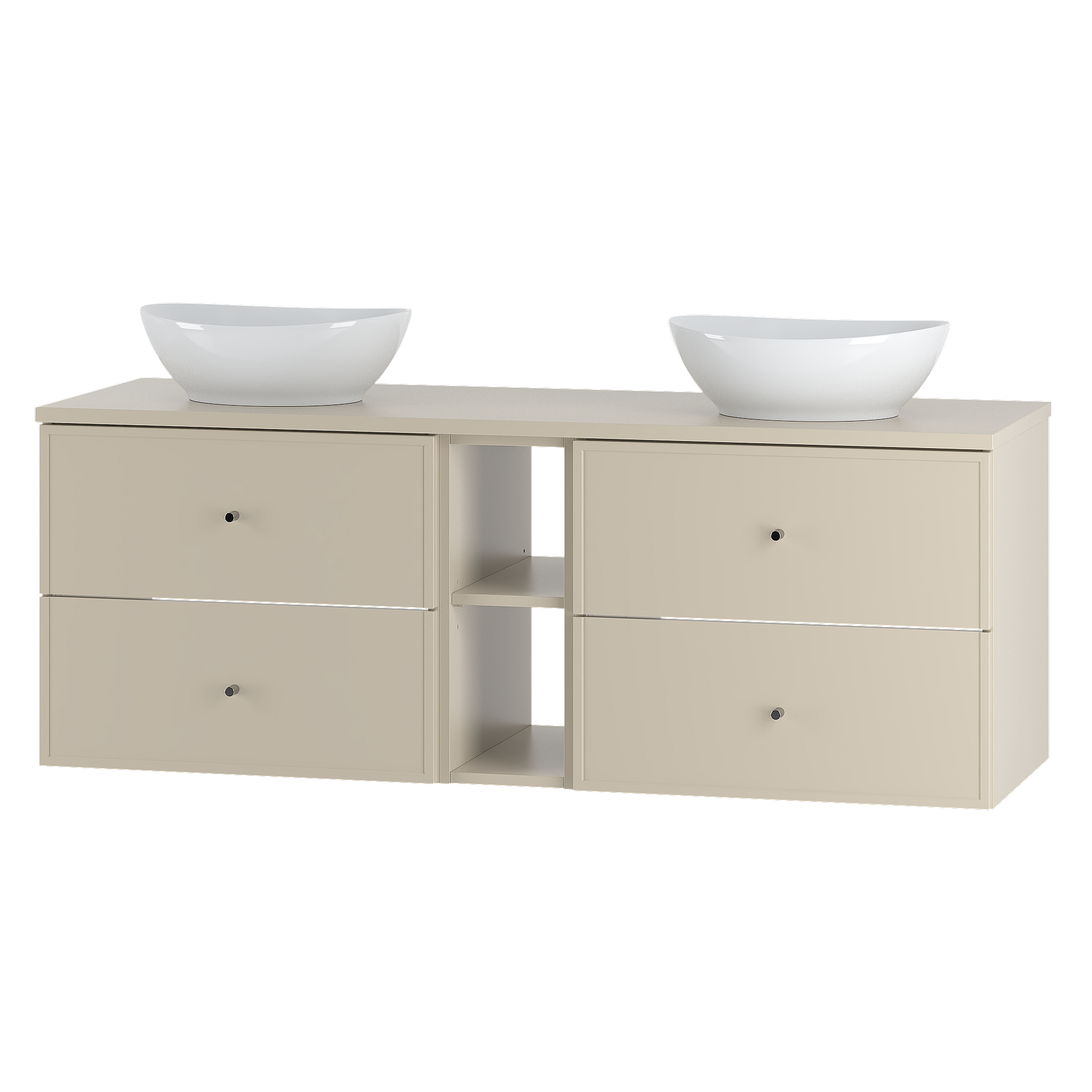 Szafka łazienkowa wisząca ryflowana z wnękami i dwoma okrągłymi umywalkami nablatowymi - Naturalny jasny - szer. 140 cm - ZEVARA