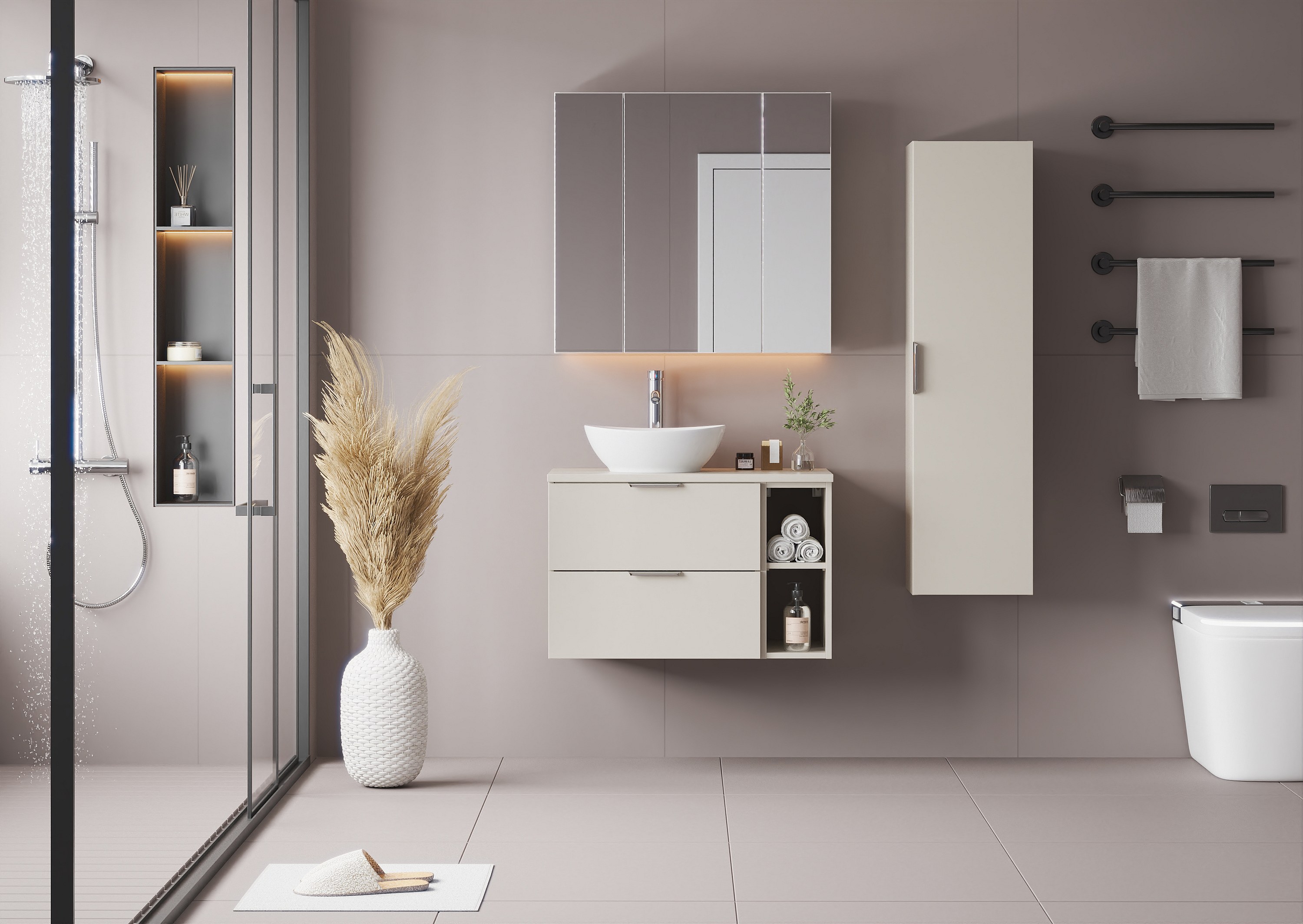 Kaszmirowy Zestaw do Łazienki 140cm Szafka Regał Blat Marco