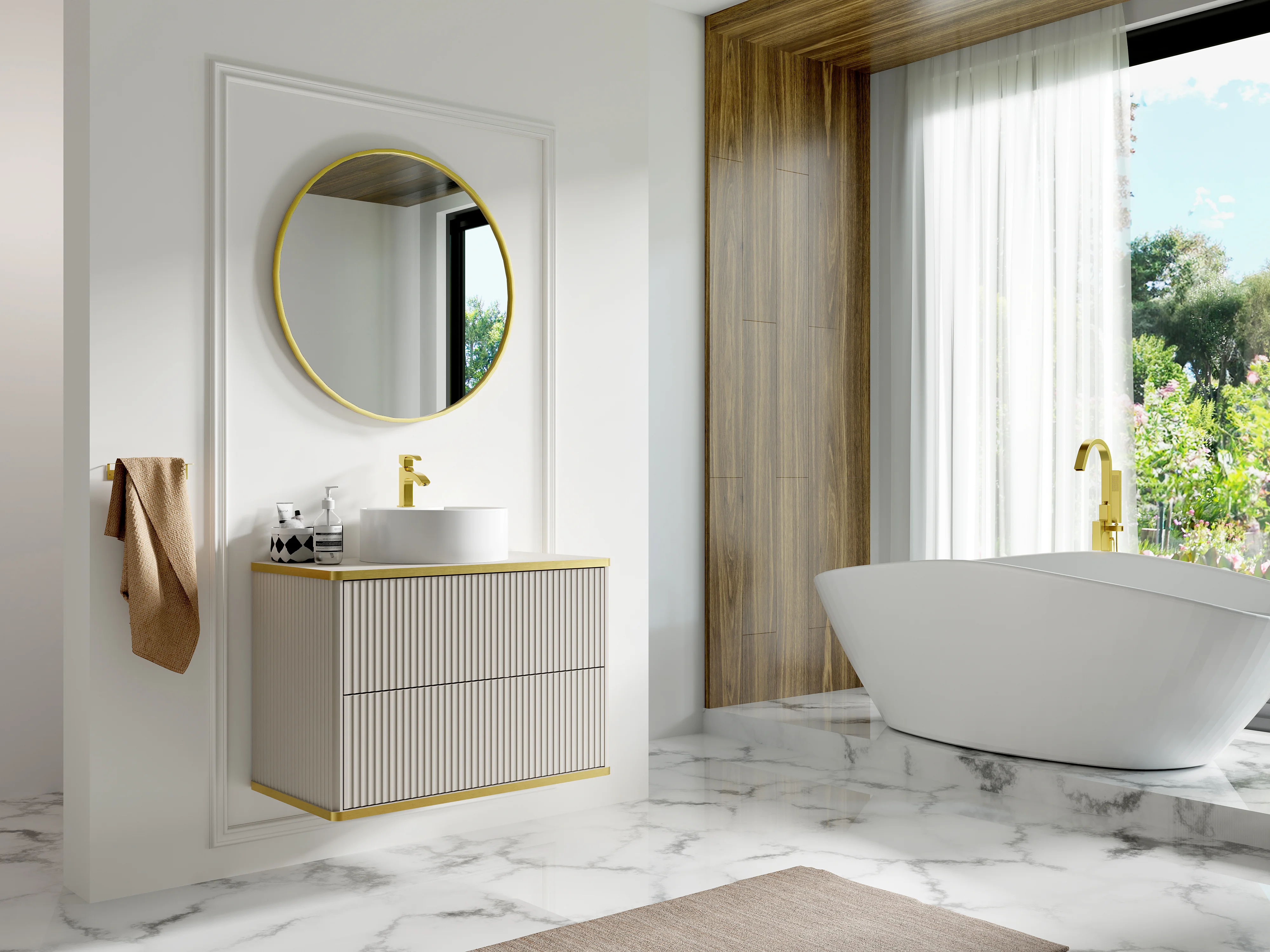 Szafka łazienkowa wisząca ryflowana ze złotą listwą i okrągłą umywalką nablatową - Beżowy - 80 cm - KELIZA