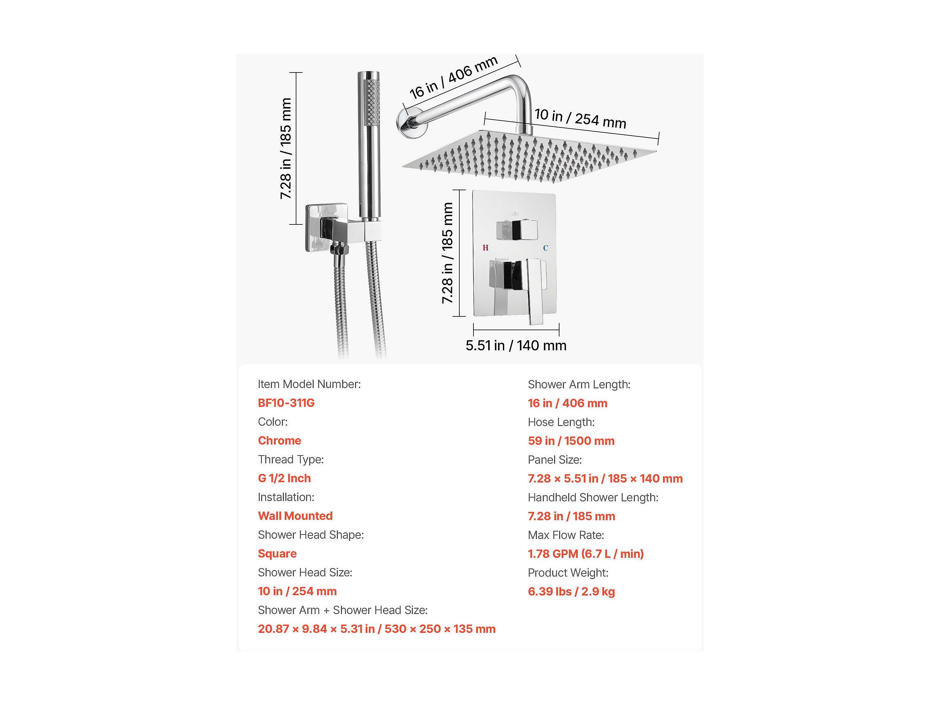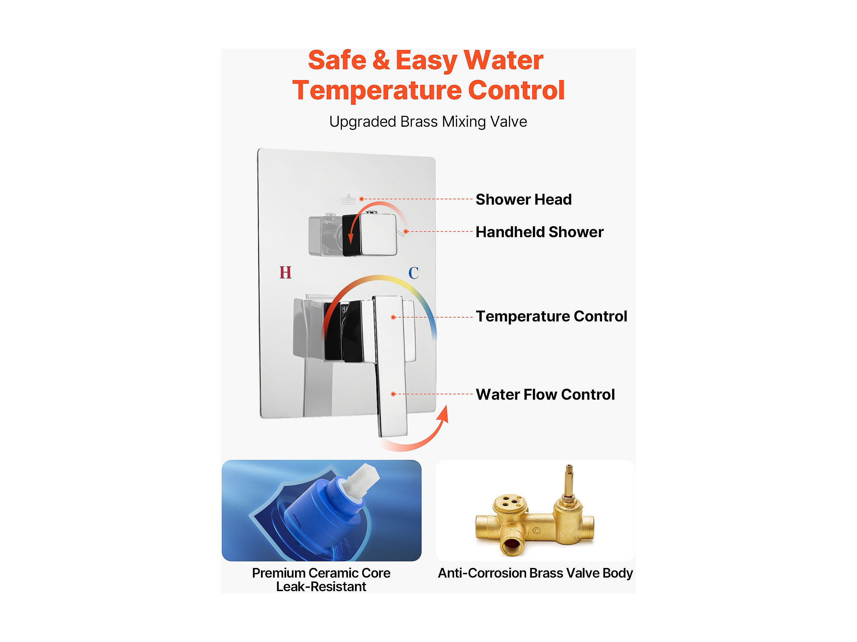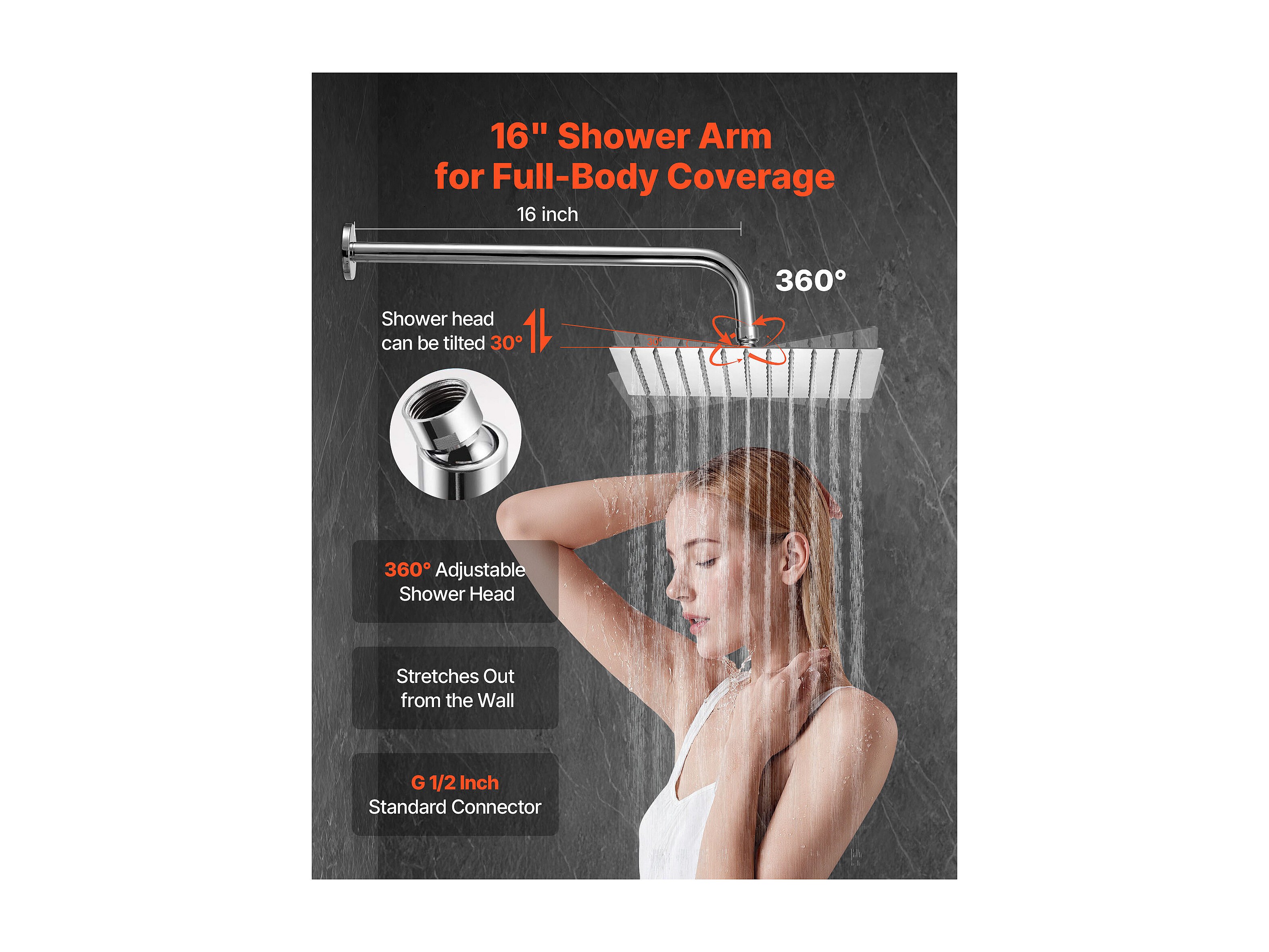 Kolumna Prysznicowa SucceBuy Zestaw Prysznicowy, Deszczownica z Kwadratową Głowicą Prysznicową 254 mm, Prysznicem Ręcznym i Zestawem do Montażu na Ścianie