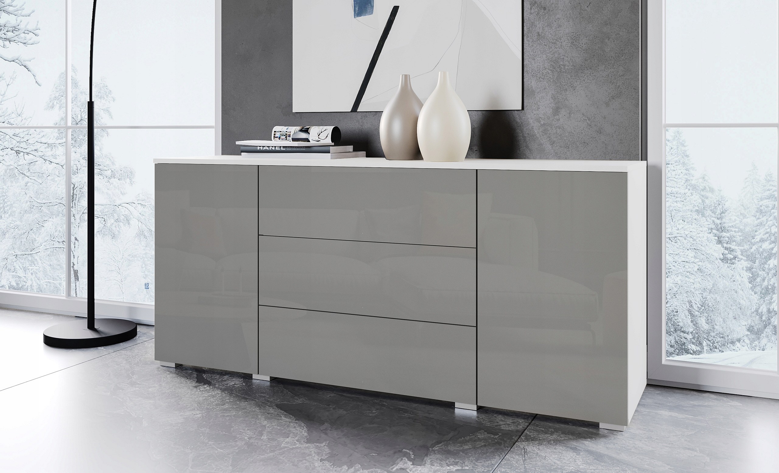 Komoda 150 cm do salonu – nowoczesna komoda z szufladami i szafkami korpus biały mat i fronty szary połysk