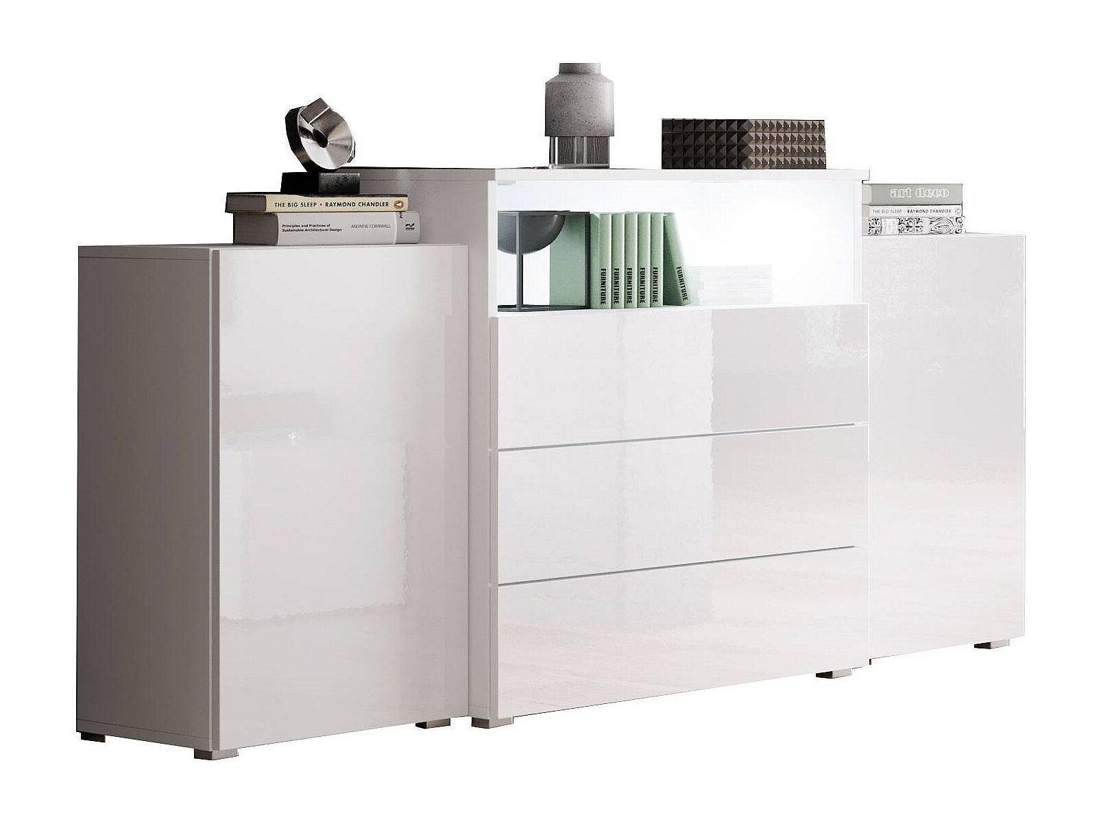 Komoda 150 cm do salonu z LED – nowoczesna stojąca z 3 szufladami, korpus biały mat, fronty biały połysk