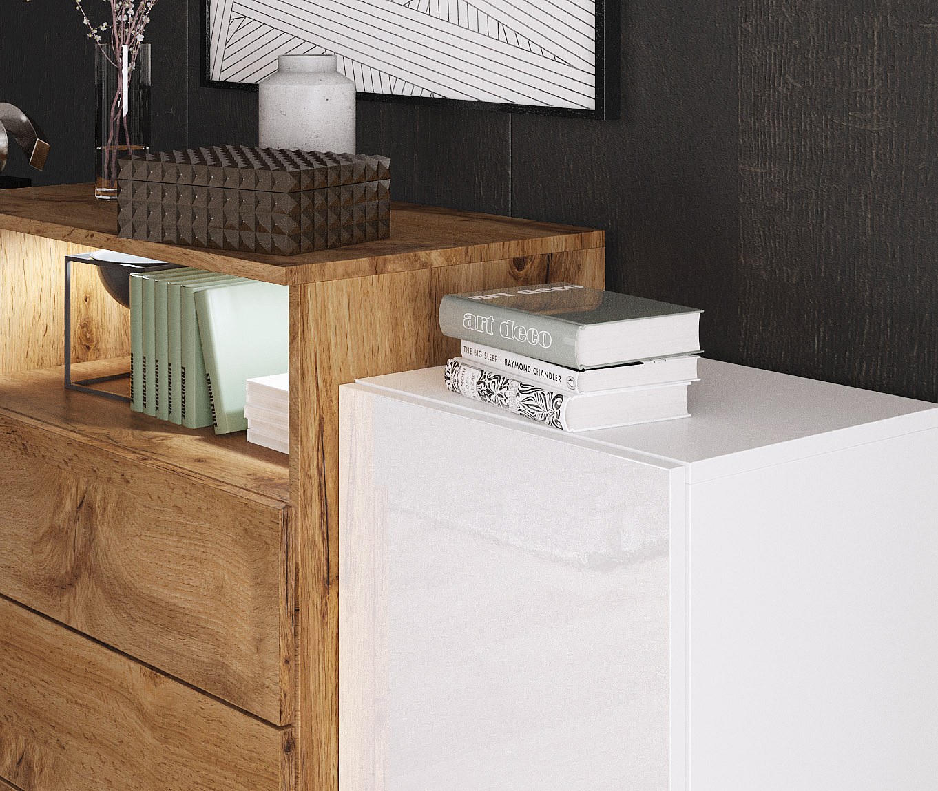 Komoda 150 cm do salonu z LED – nowoczesna stojąca z 3 szufladami, korpus dąb wotan, fronty biały połysk