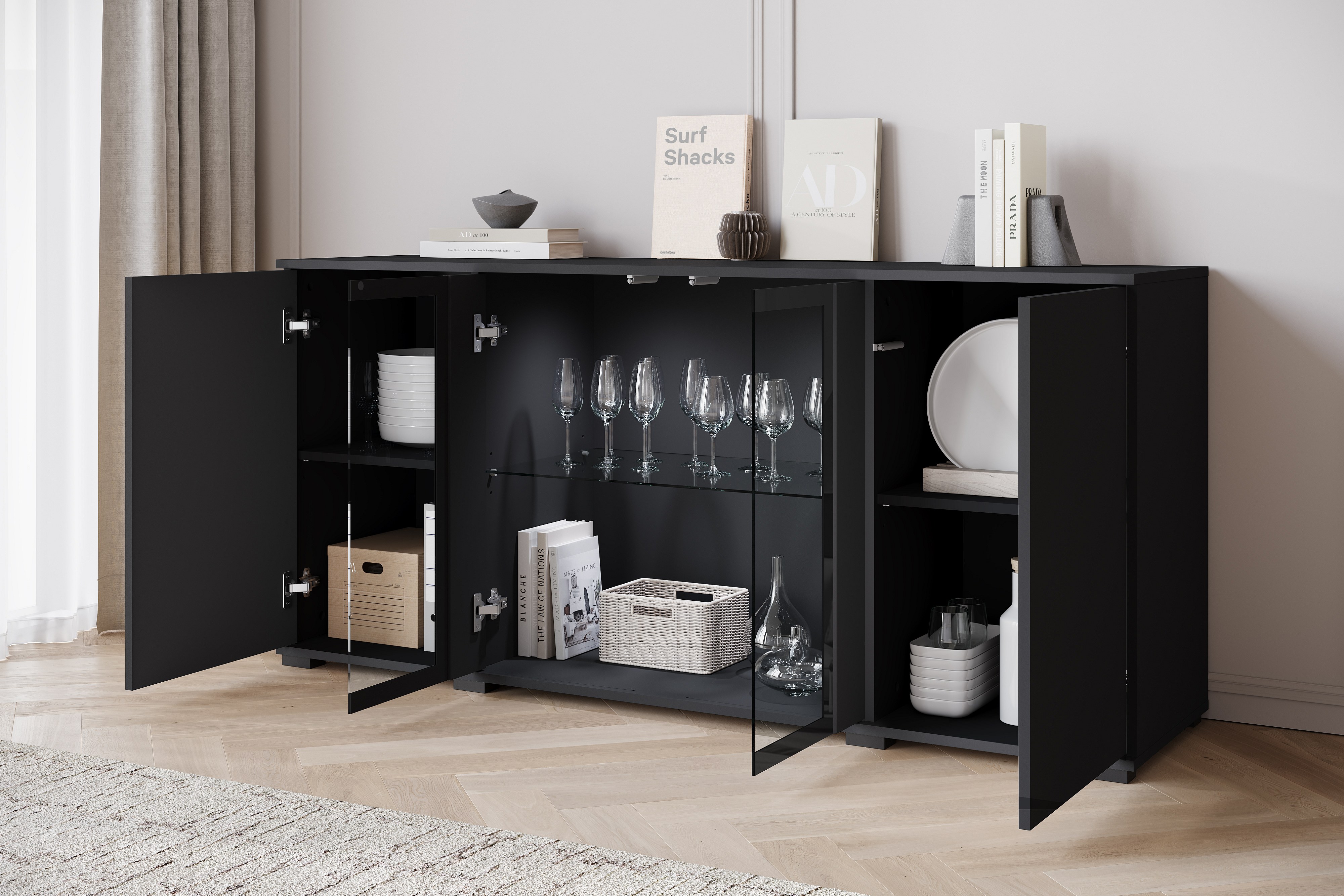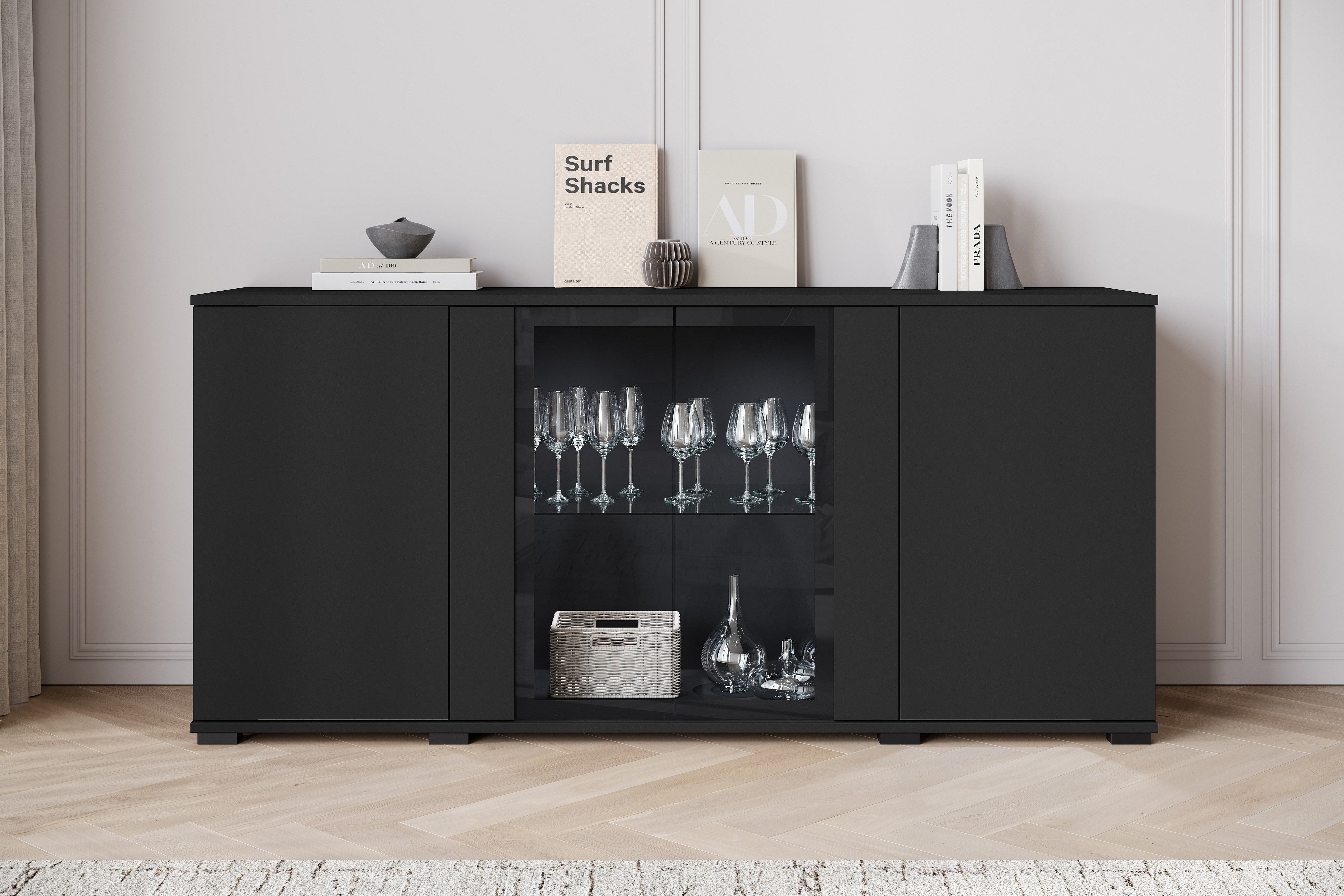 Komoda 150 cm do salonu z LED – nowoczesna witryna z przeszkleniami, czarny mat