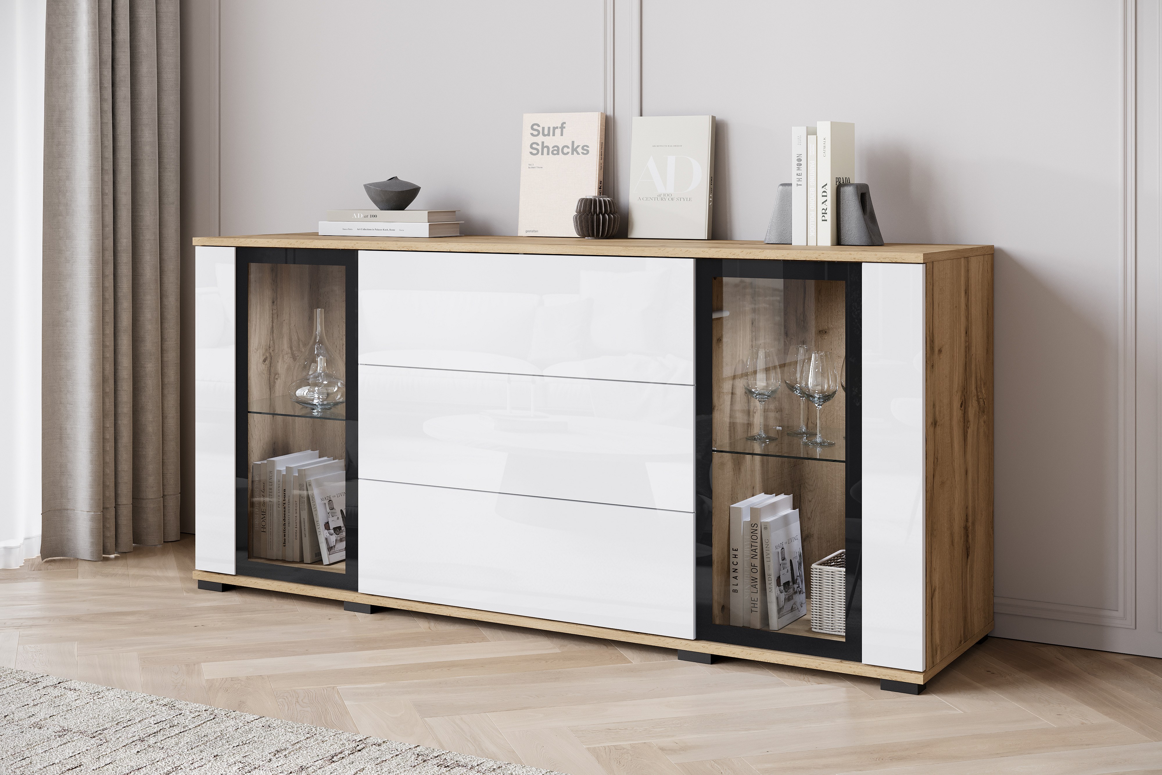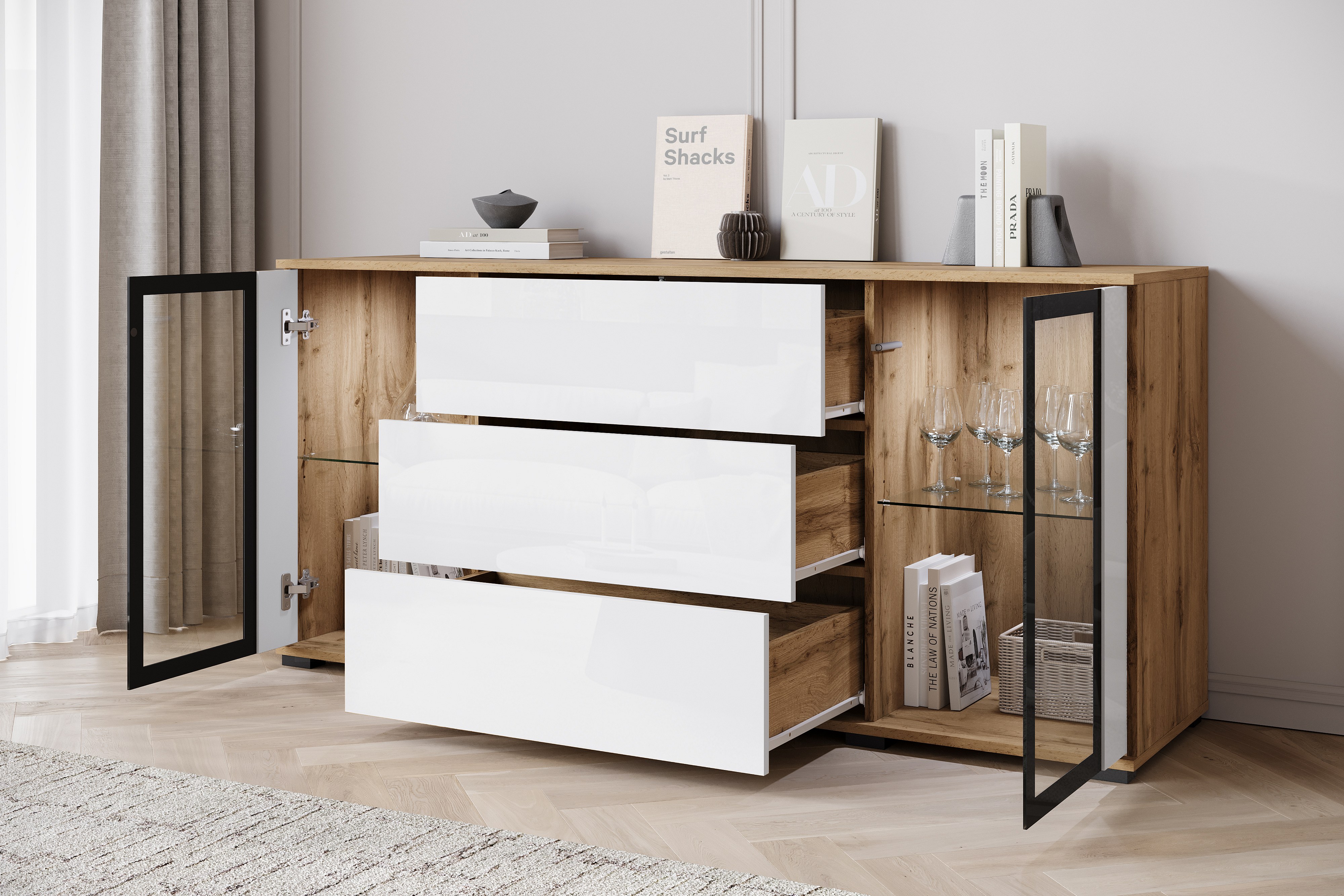 Komoda 150 cm do salonu z LED – nowoczesna witryna z przeszkleniami + szuflady, dąb wotan