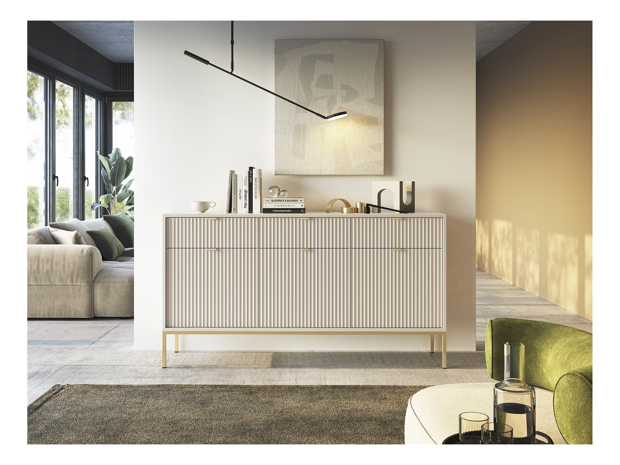 Komoda: 3 szuflady, 3 drzwi, kaszmir, złoty, 154 x 83 x 39 cm, złote uchwyty