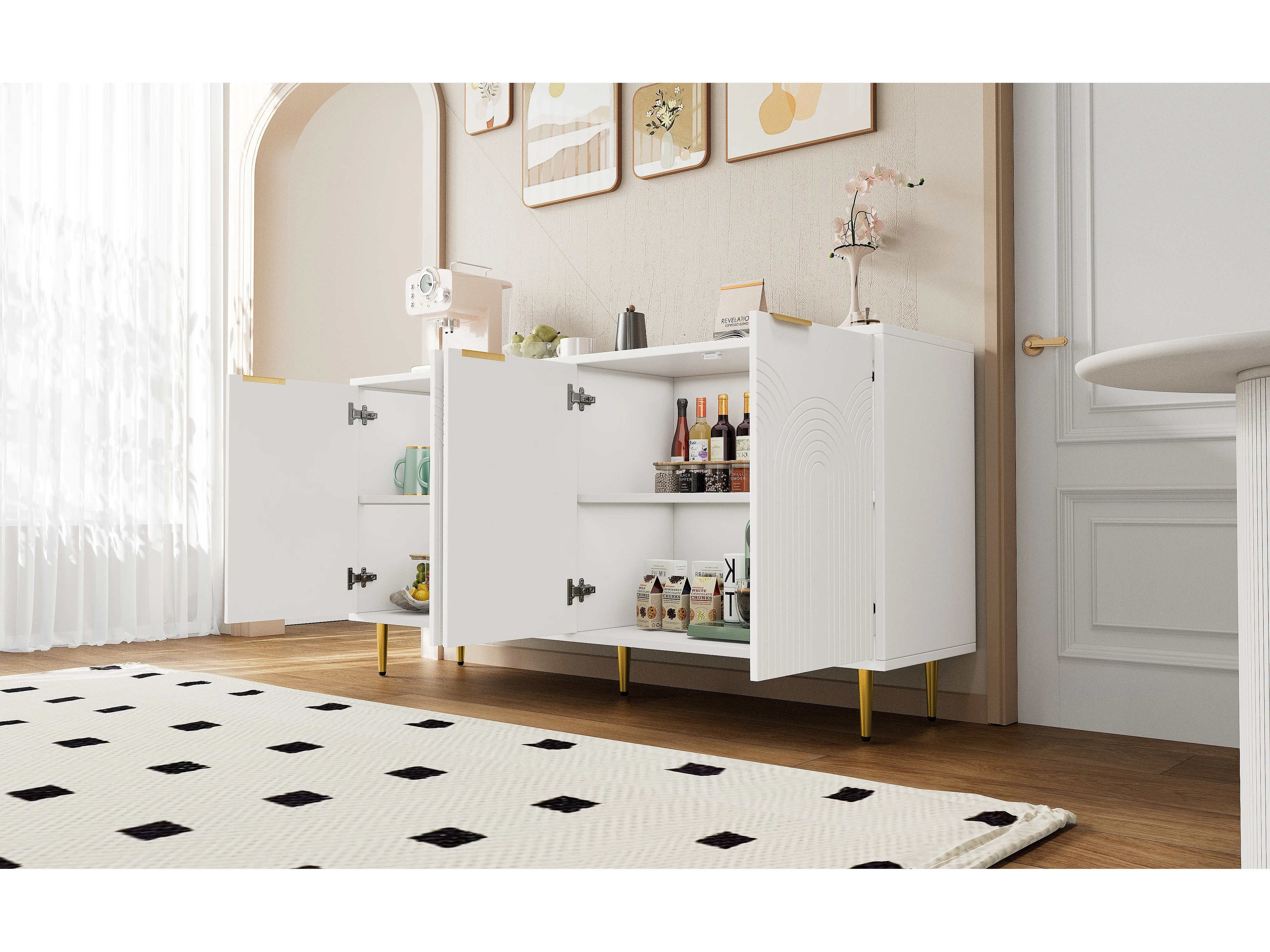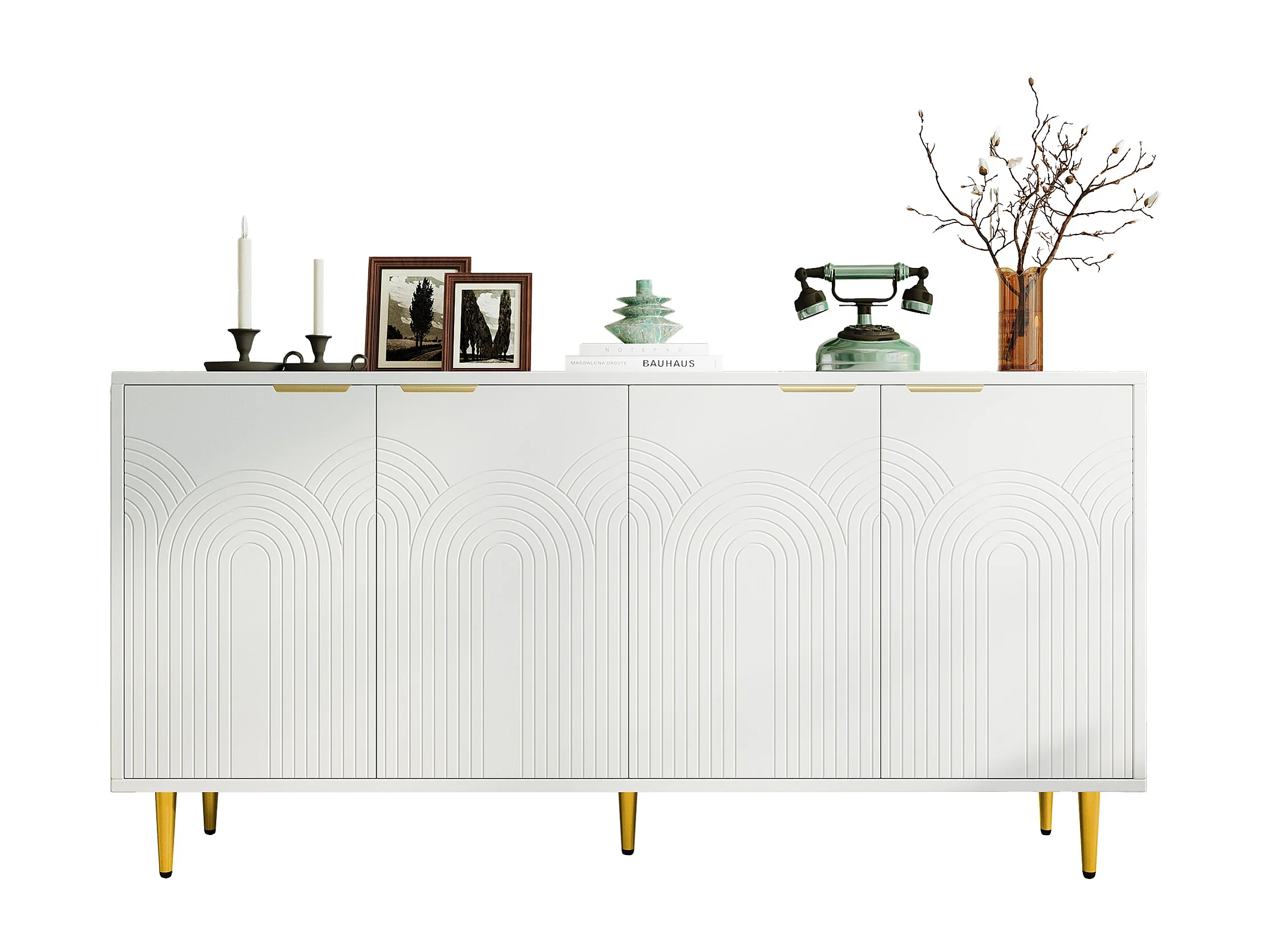 Komoda do salonu - 160 x 40 x 80 cm - 4 drzwi + lakierowane nogi + uchwyty metalowe w kolorze złotym - płyta wiórowa - biała