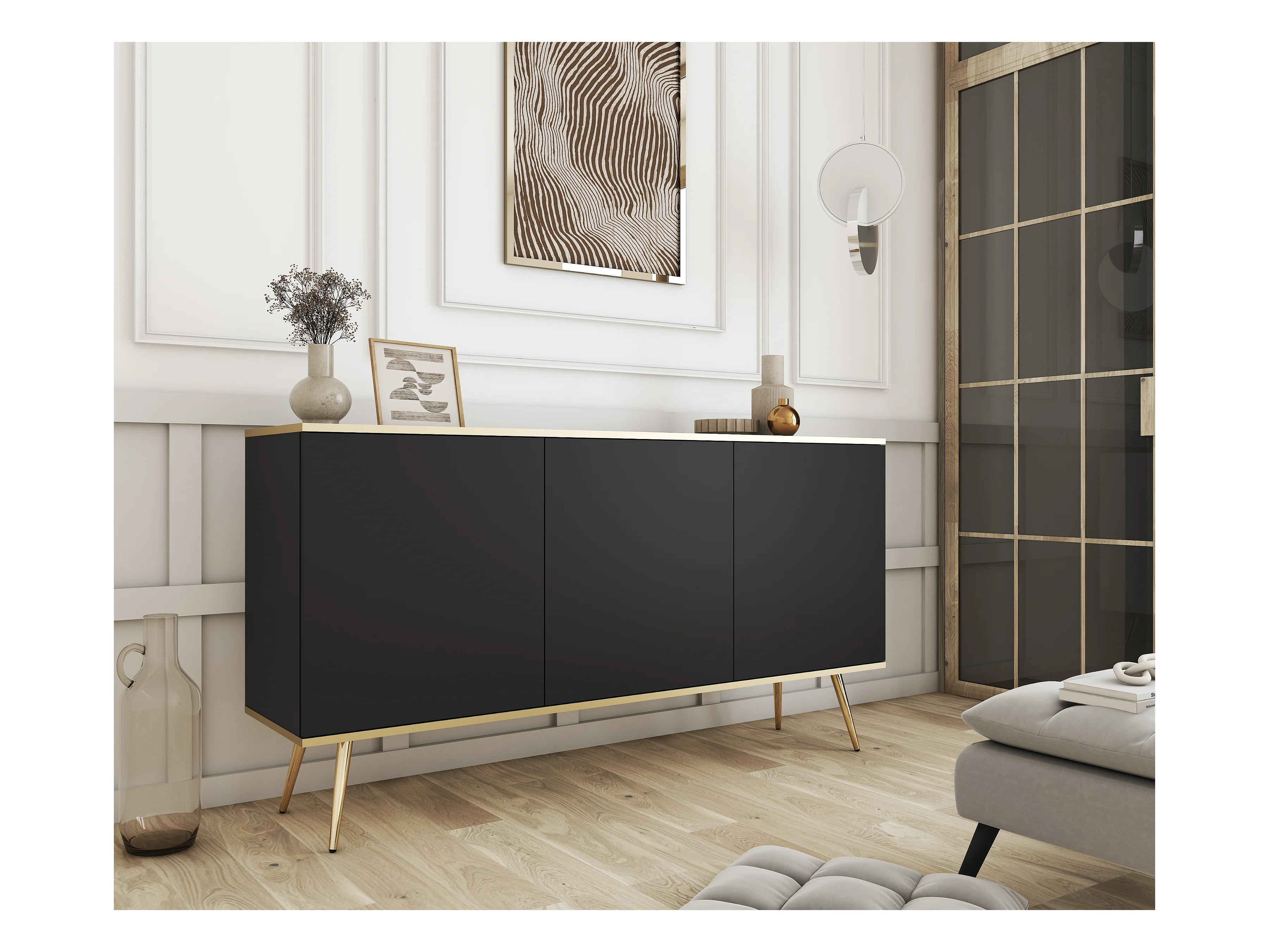 Komoda Elegancka DomoHome NOVA – 154x83x39cm, fasada Geriffelt, złote uchwyty, uniwersalny design, 3 szuflady i 3 drzwi, Czarna rama złota