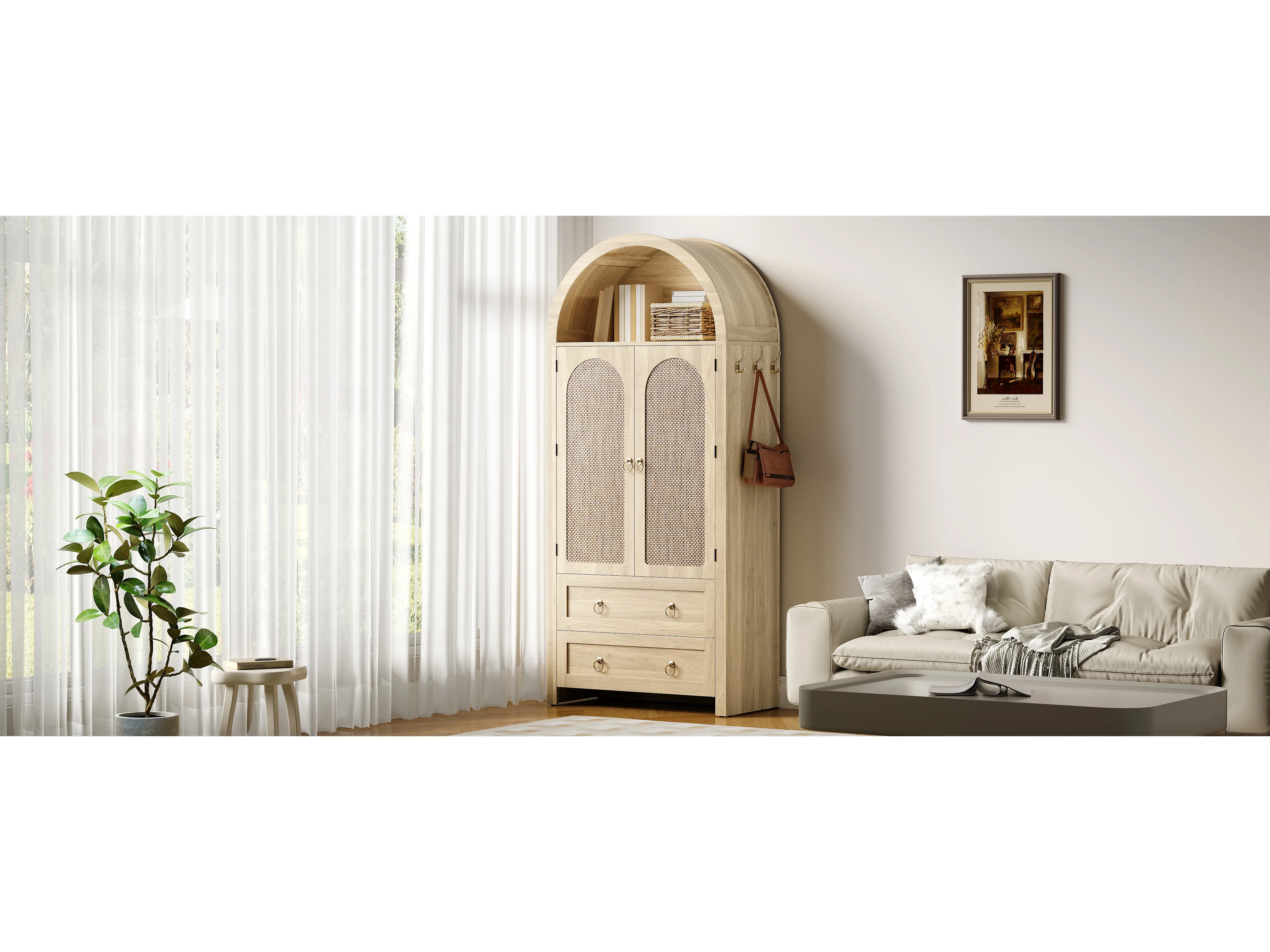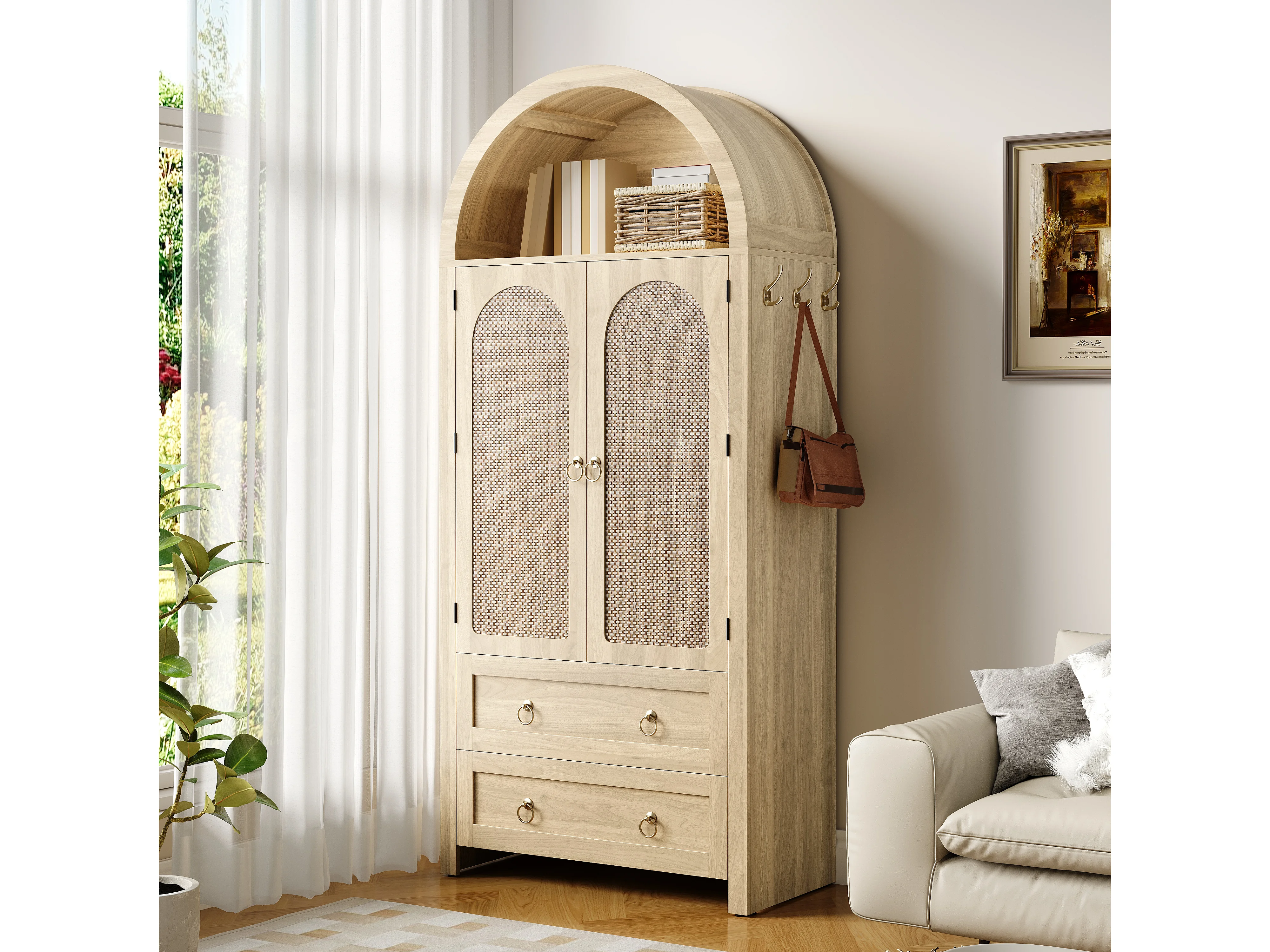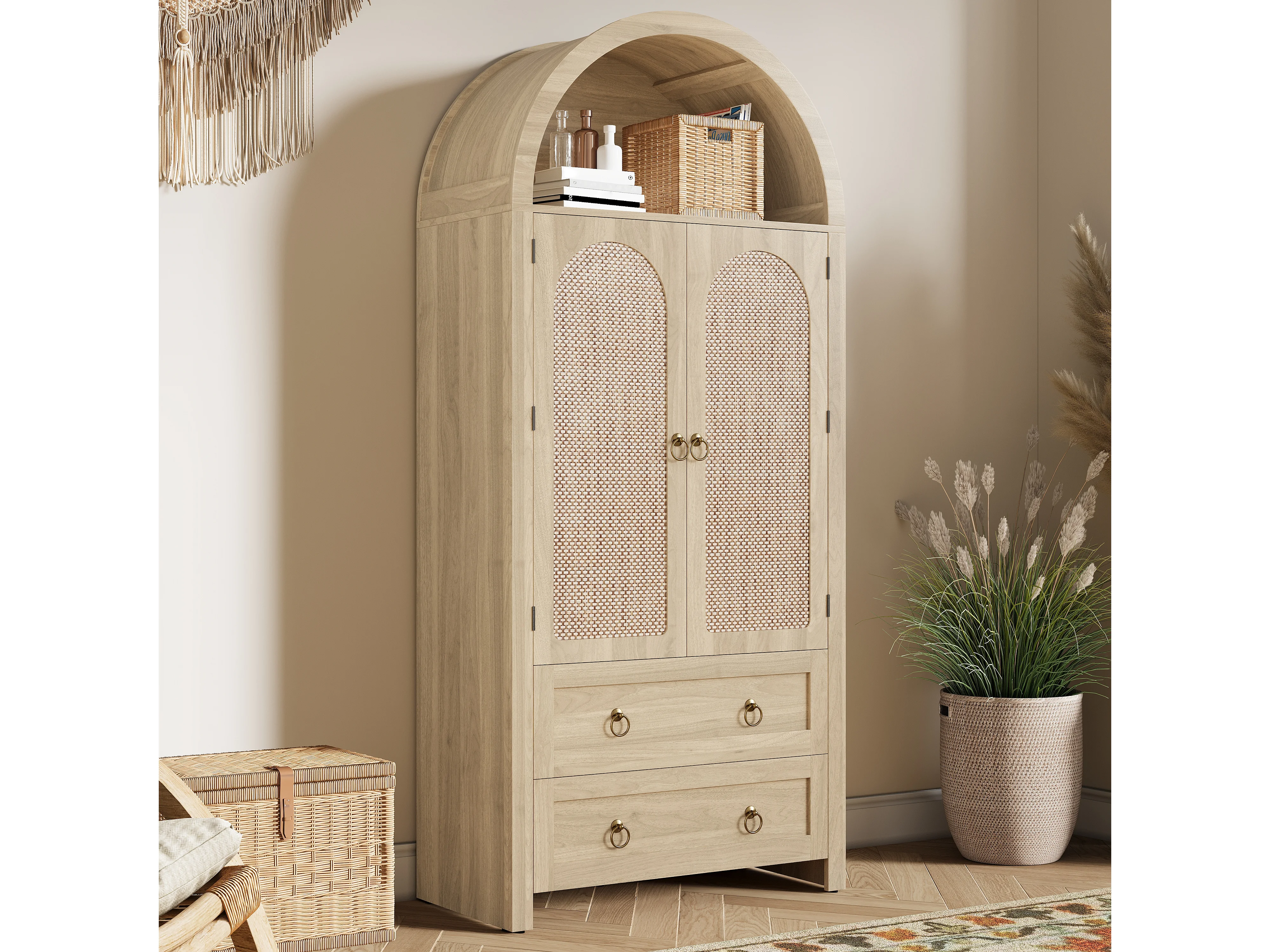Komoda wiklinowa vintage w stylu sklepionym - 80 x 40 x 180 cm - z 2 szufladami + 2 drzwiami - do salonu i sypialni - MDF - naturalny
