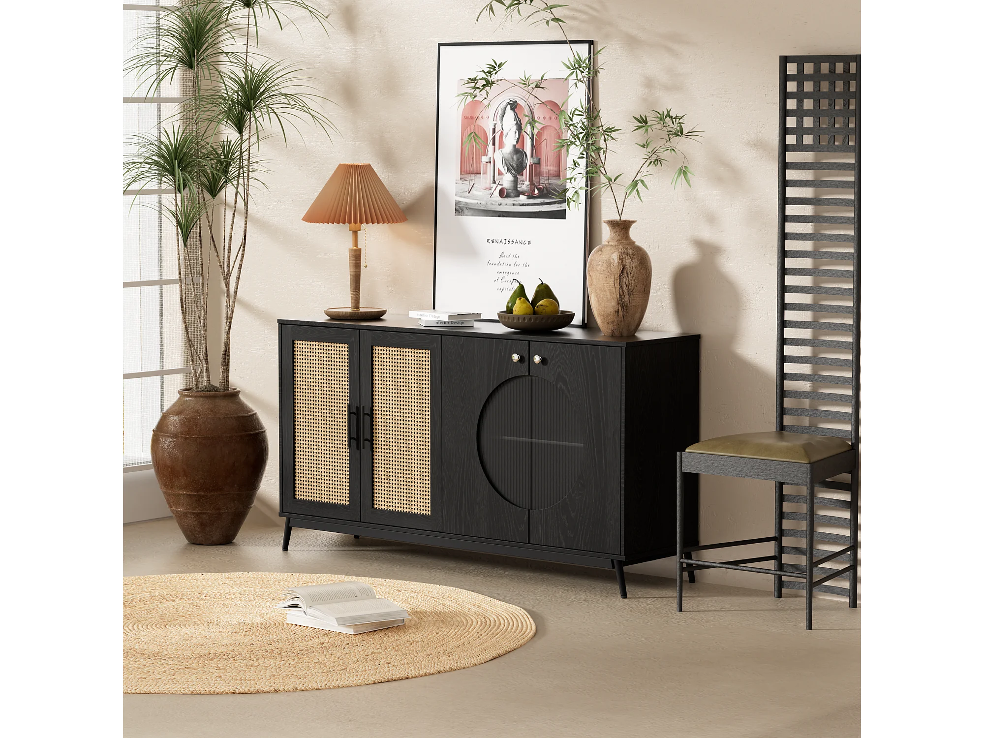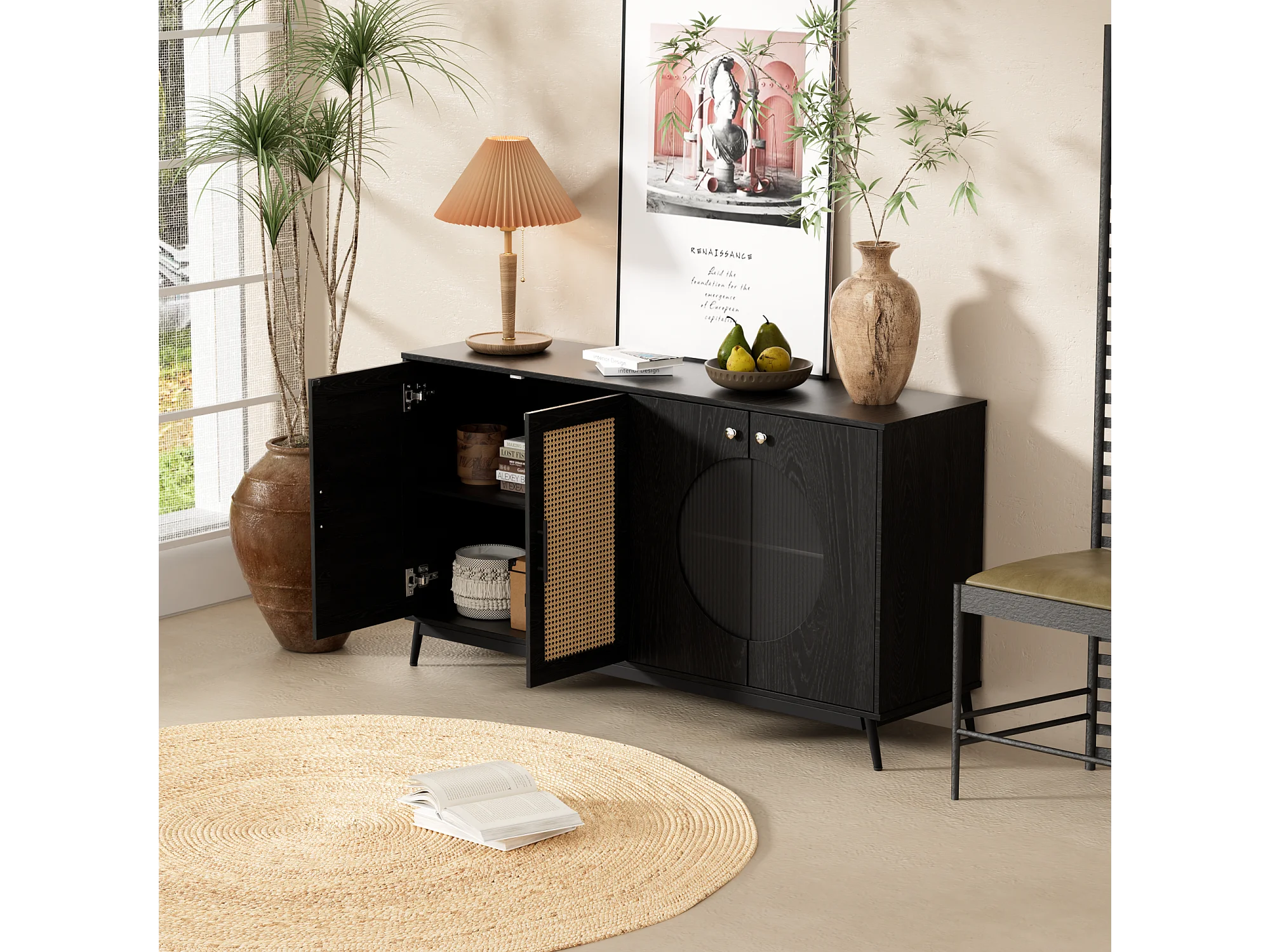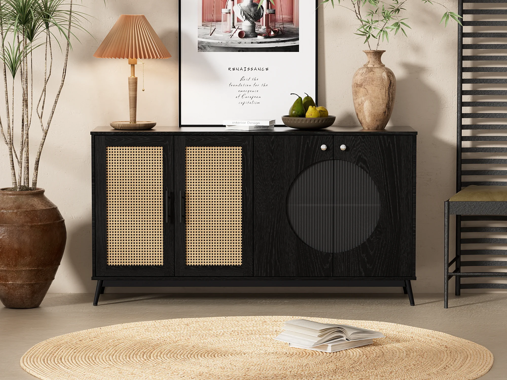 Komoda z 4 drzwiami - Rattan i wzór półkolisty - Płyta wiórowa - Czarny + dąb