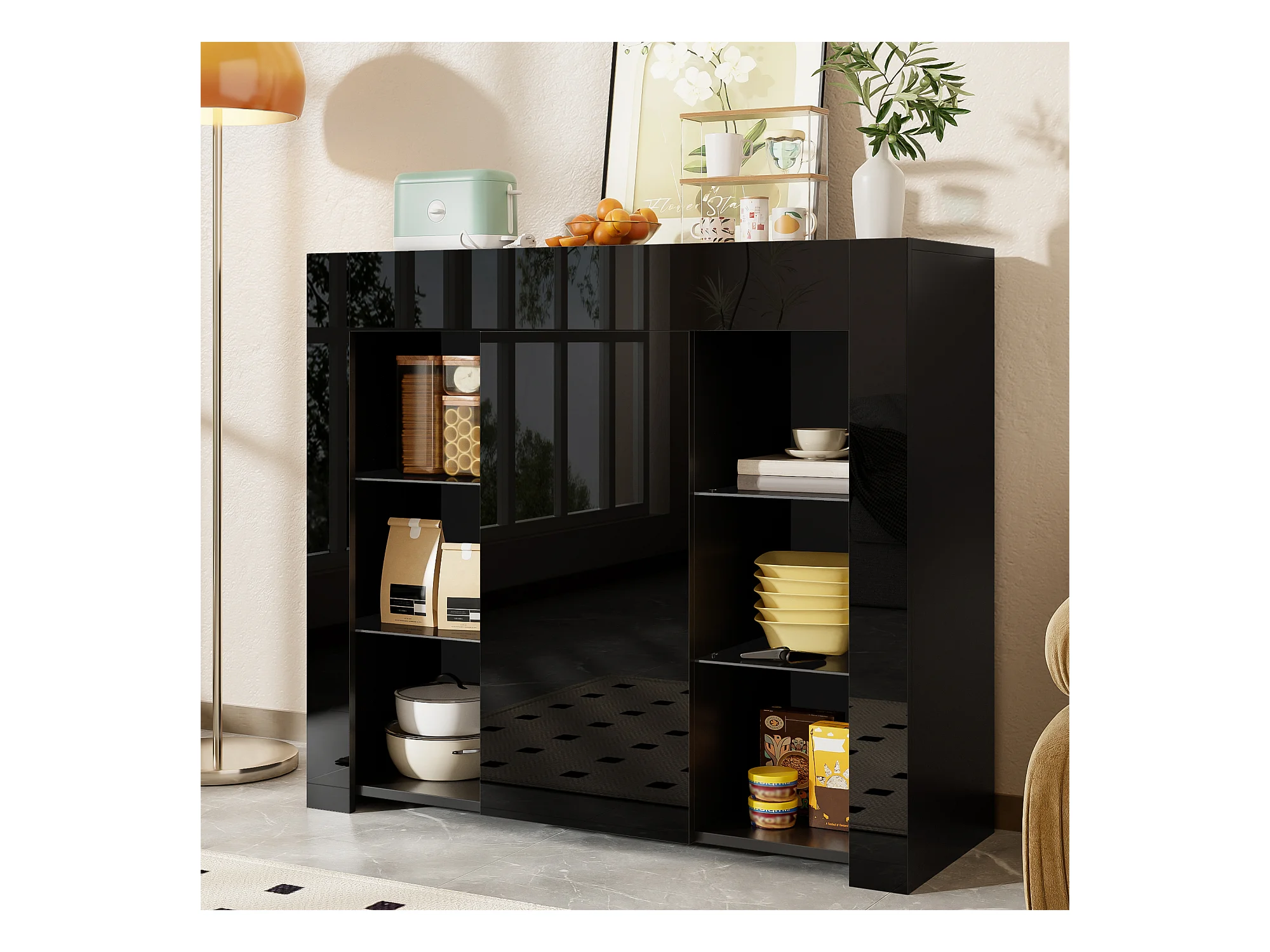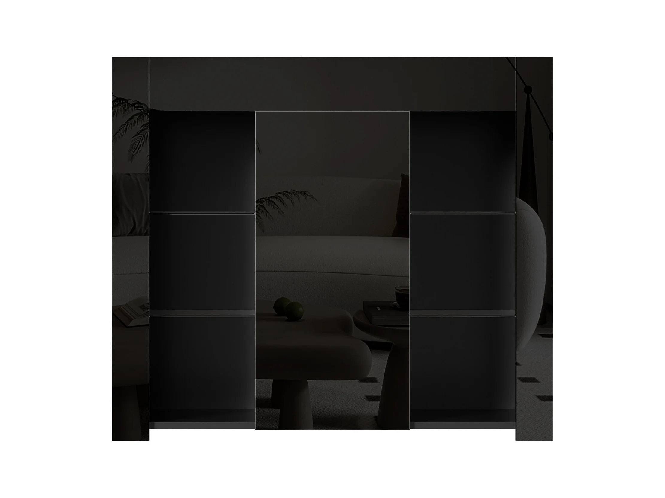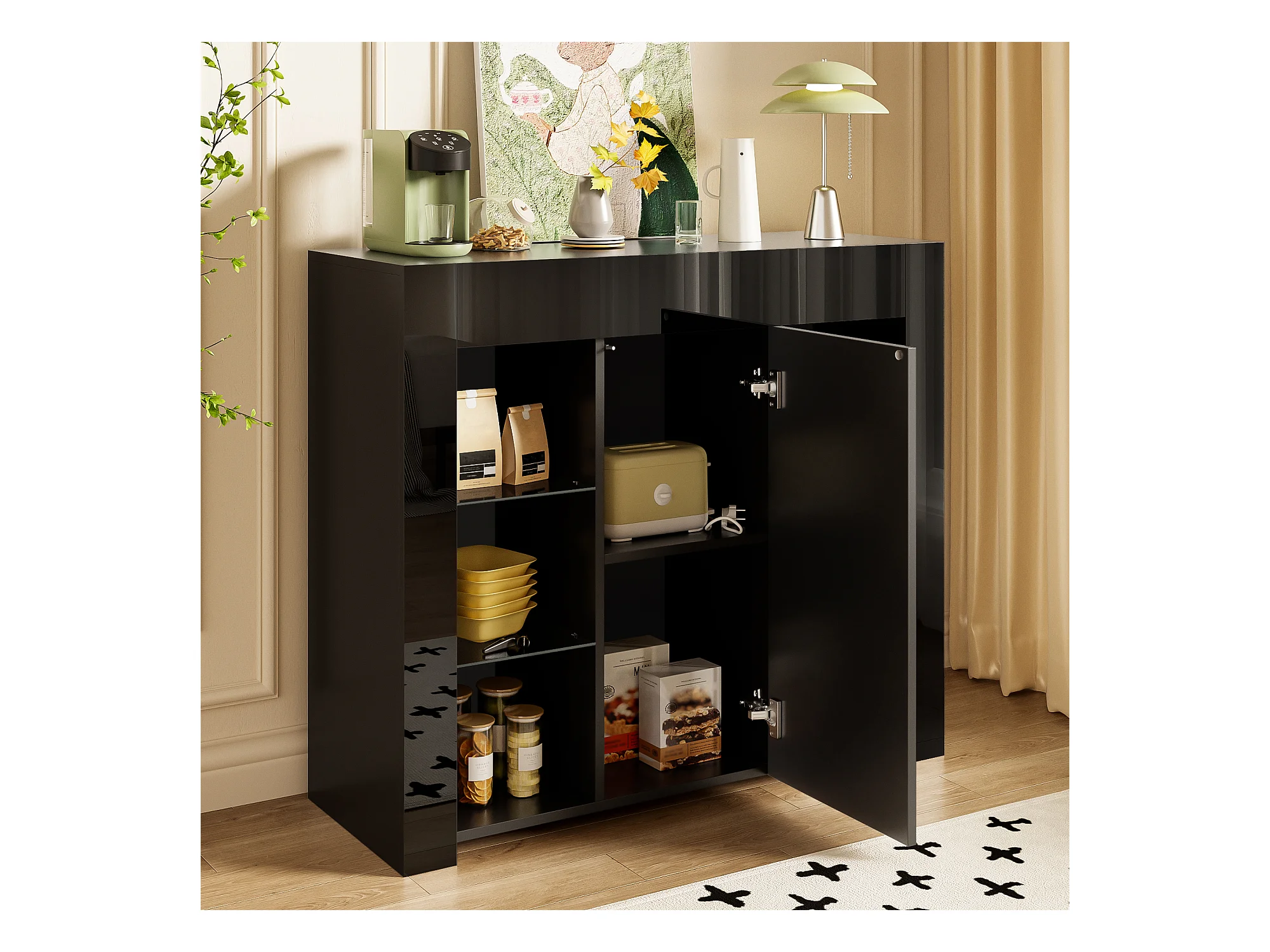 Komoda z frontem błyszczącym - 95 x 35 x 83,5 cm - z półkami szklanymi + drzwi - płyta wiórowa - czarna