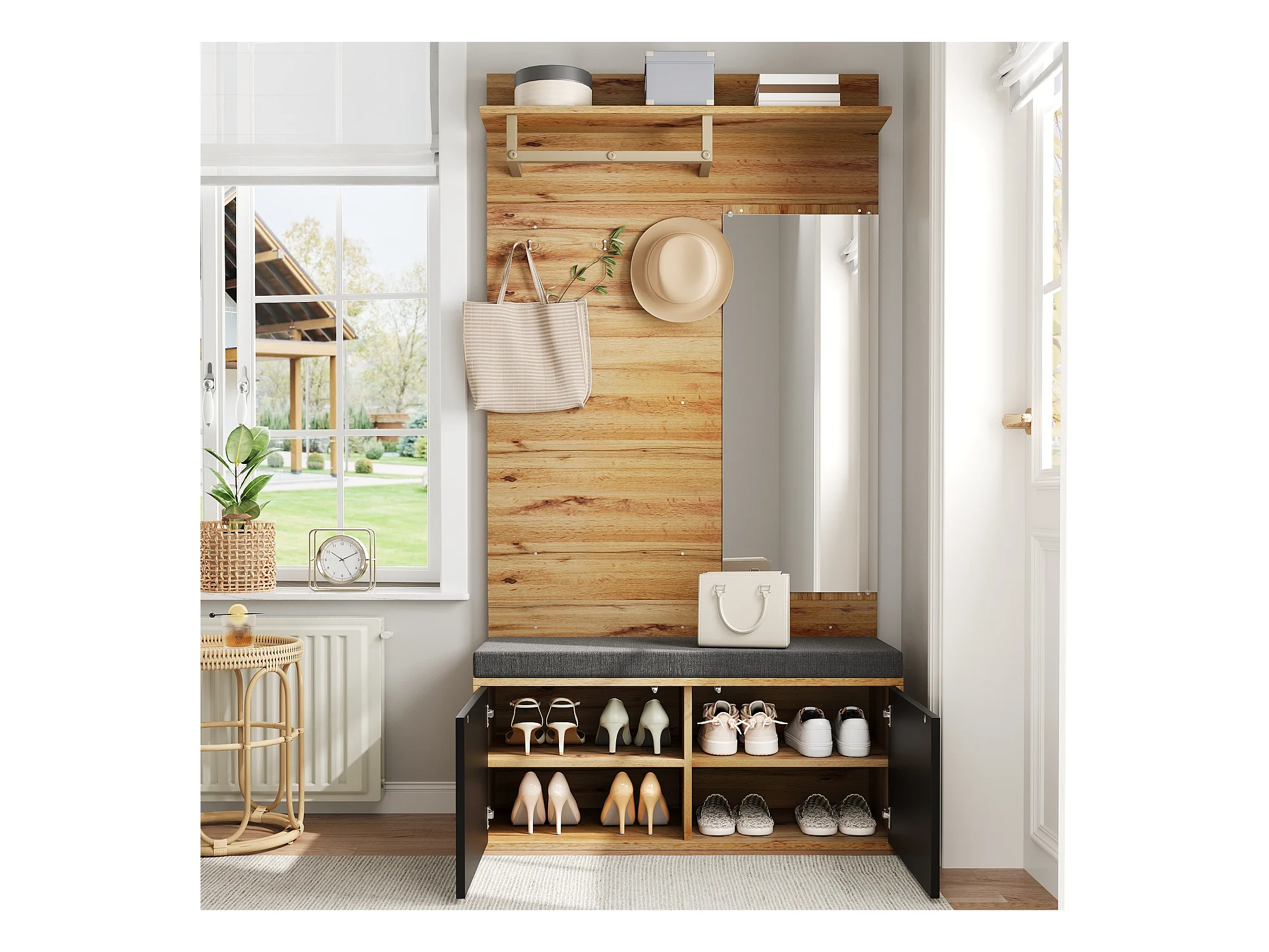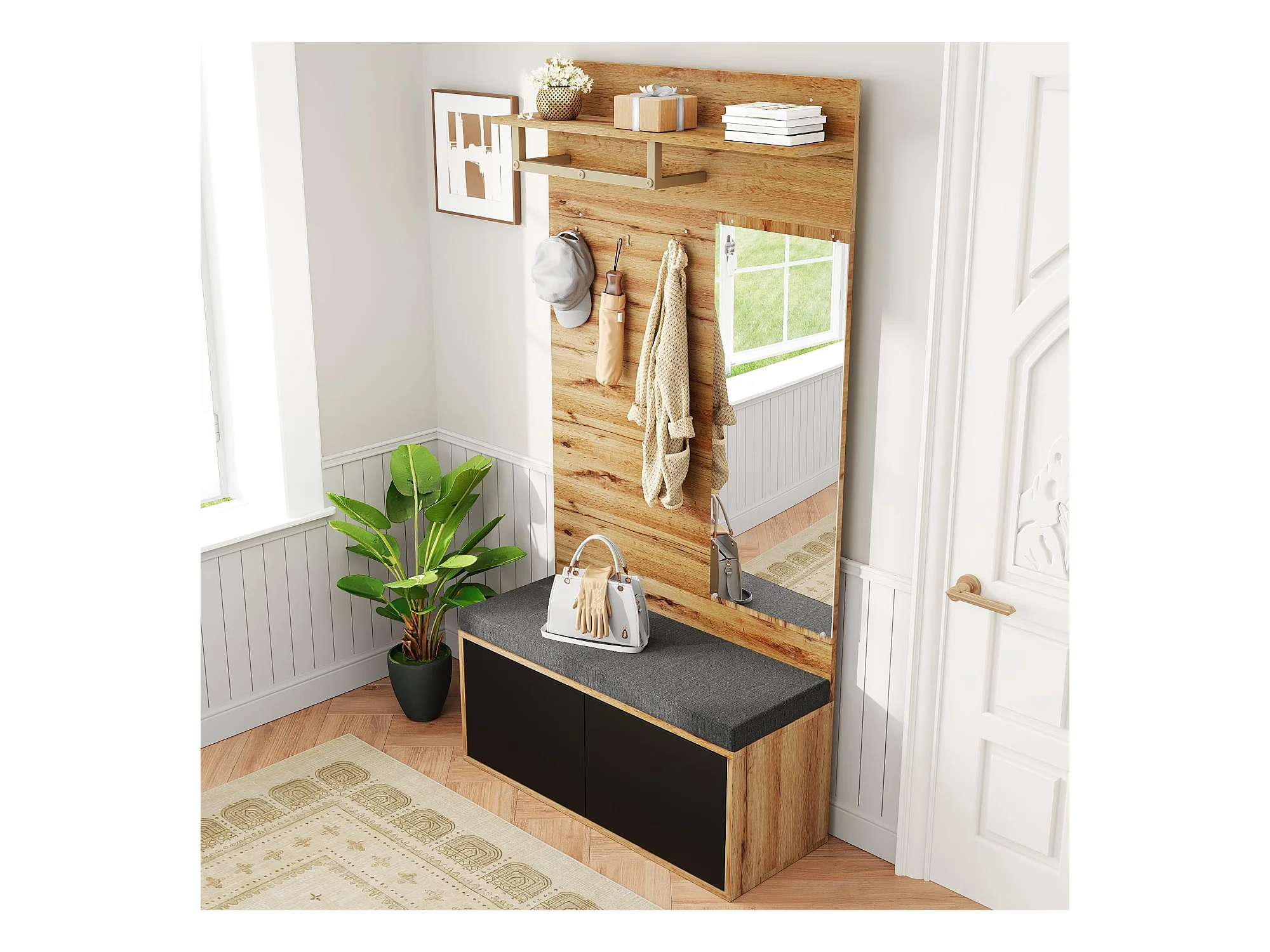 Szafa/szafka do przechowywania z lustrem + szafka na buty - haki metalowe - 78 x 38,5 x 180,5 cm - MDF - czarny