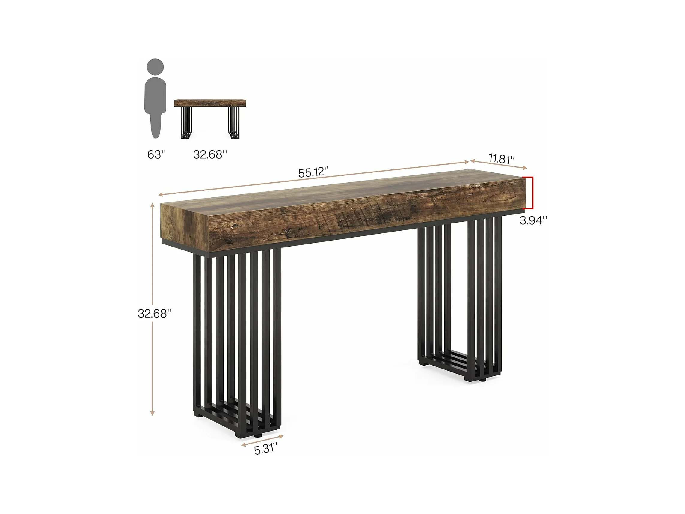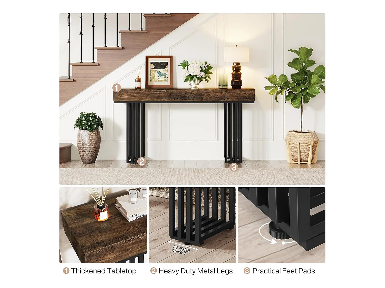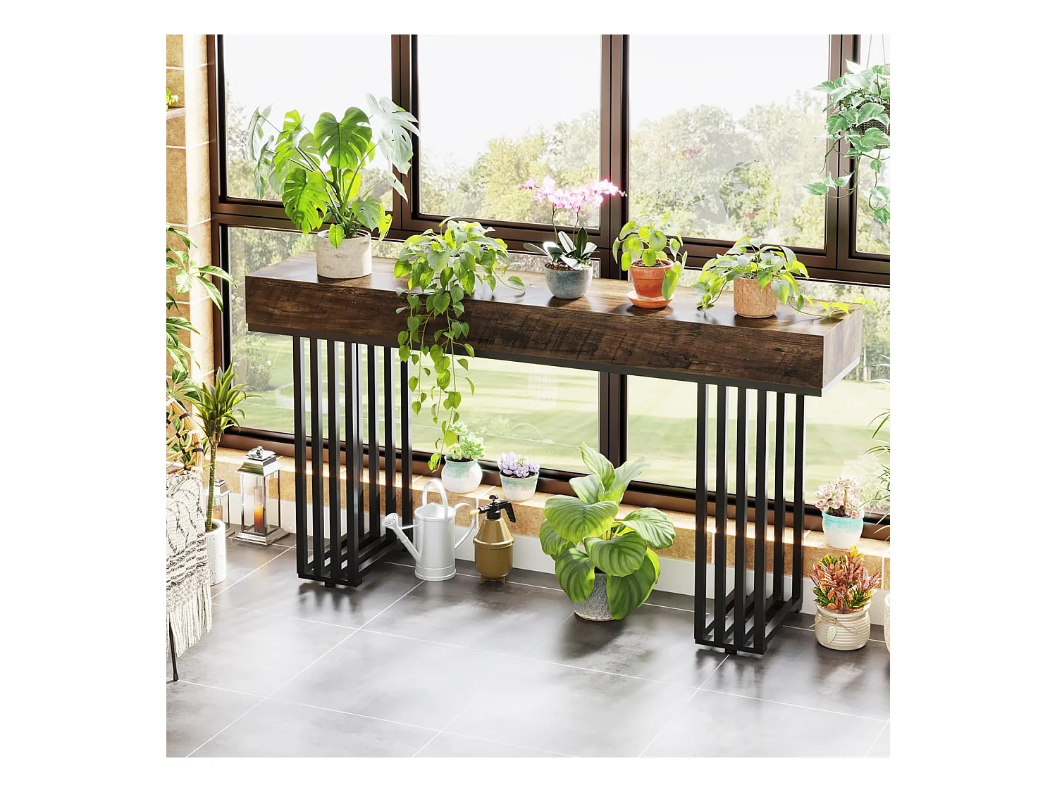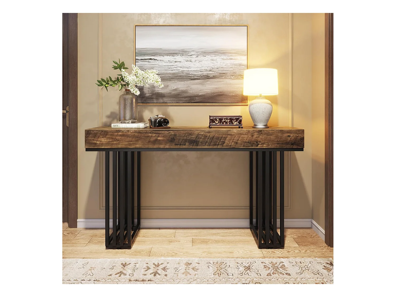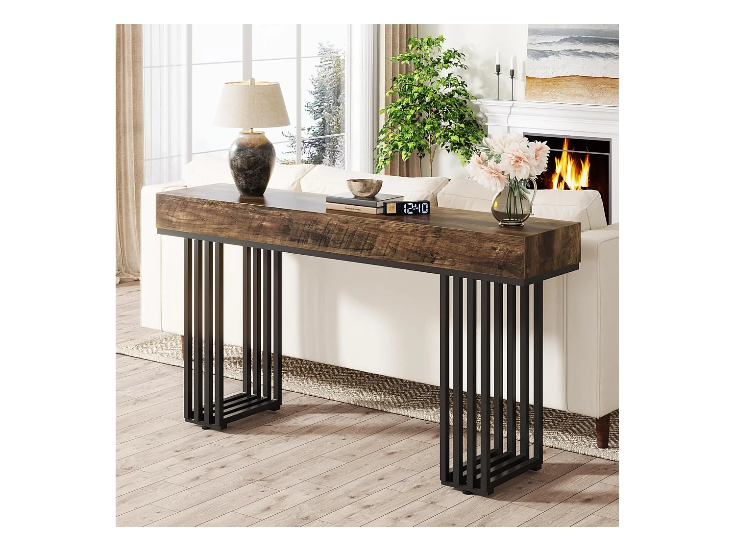 Stół do przedpokoju w stylu rustykalnym, stolik konsolowy za sofą, wąski stół do przedpokoju, stół do przedpokoju z ramą w kształcie litery K do przedpokoju, salon, rustykalny brąz 140 cm