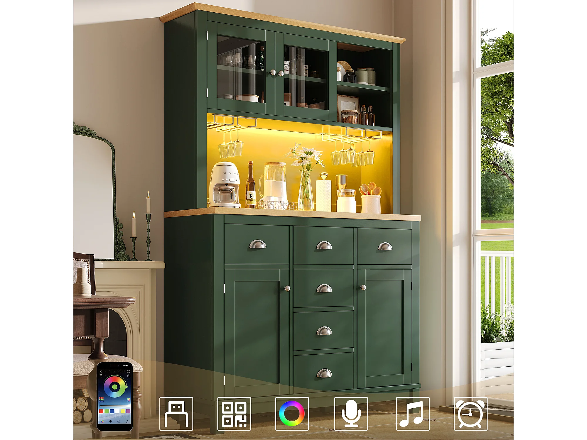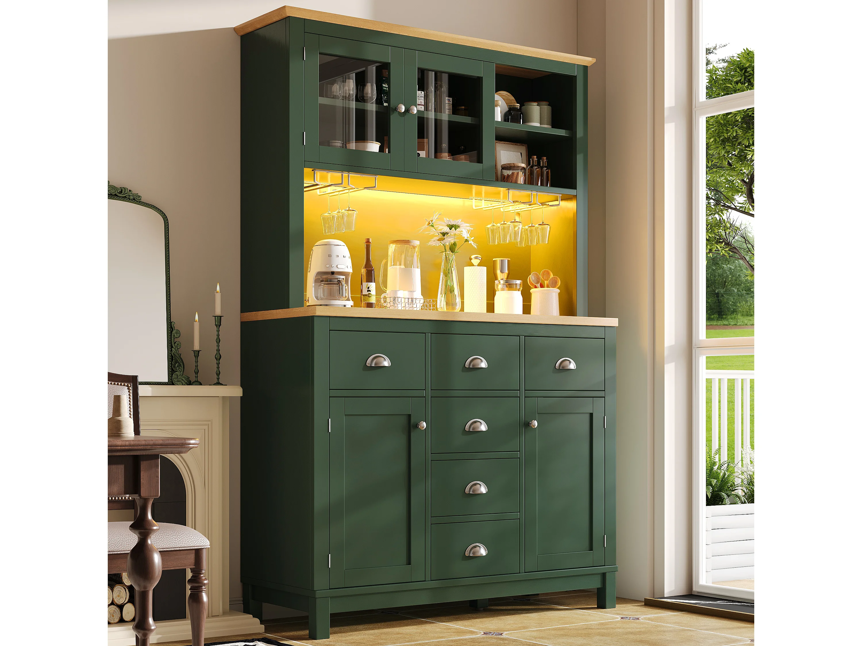 Kredens kuchenny - 120 x 40 x 179 cm - z 4 drzwiami szklanymi + diodami LED + 3 szufladami - MDF - zielony