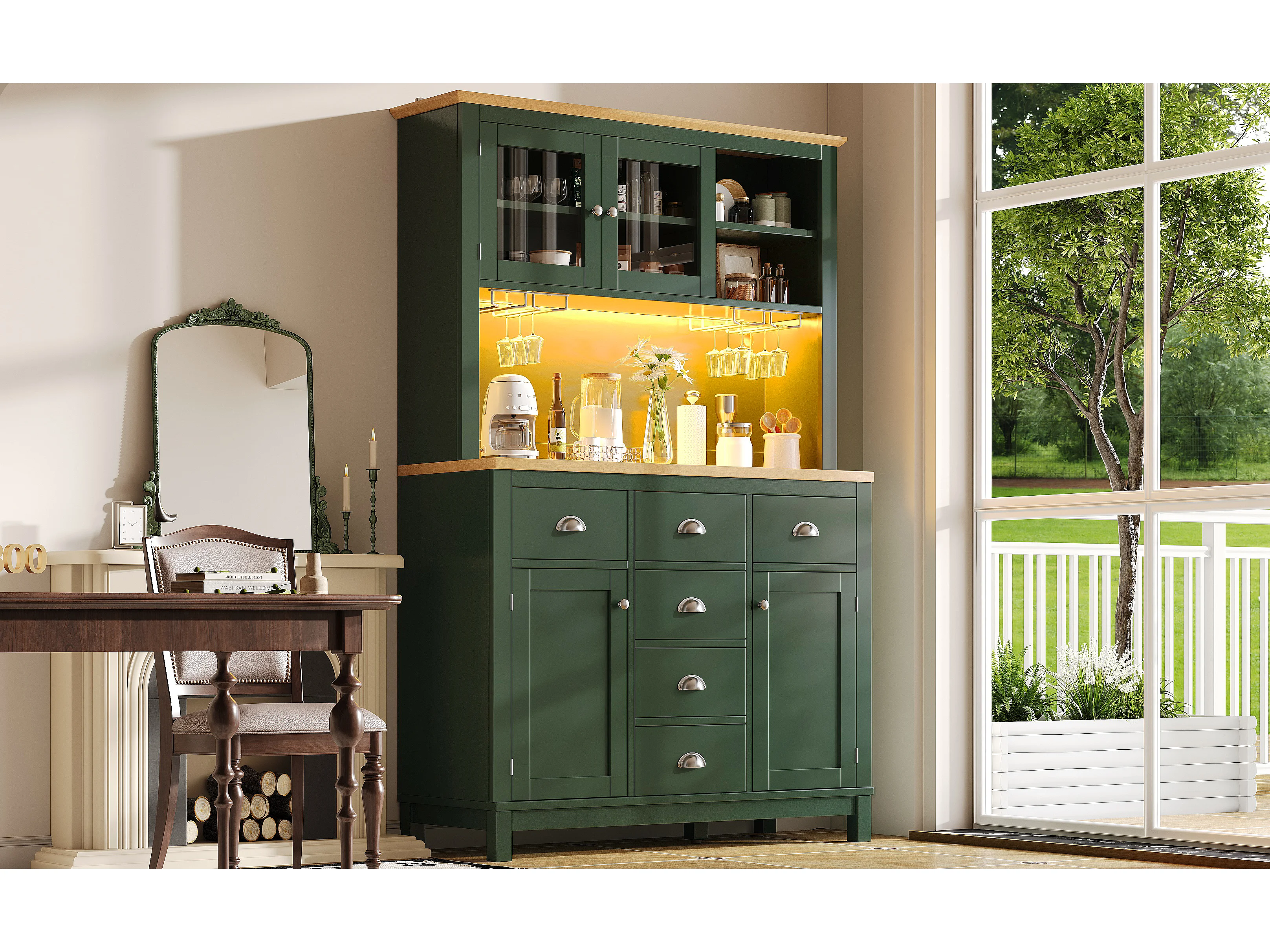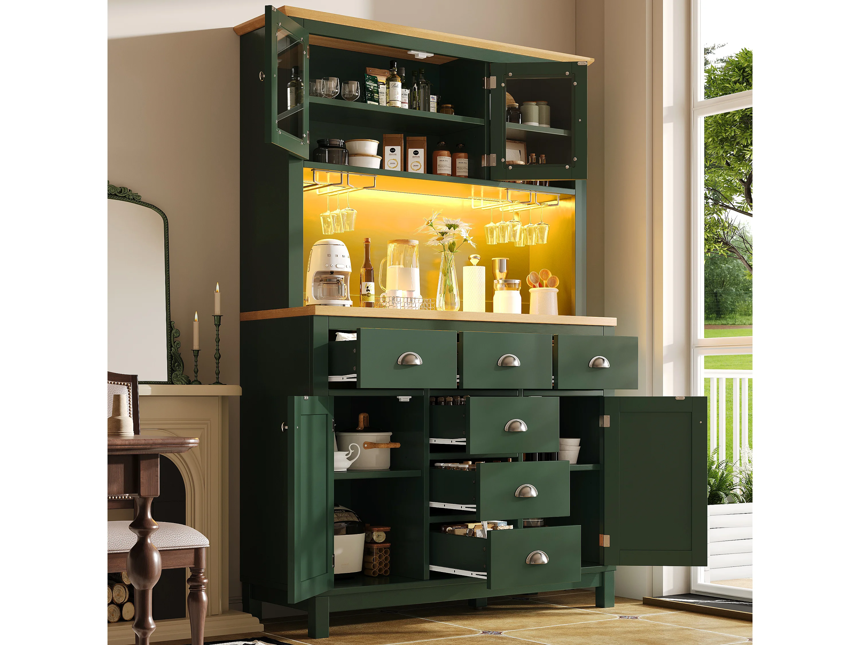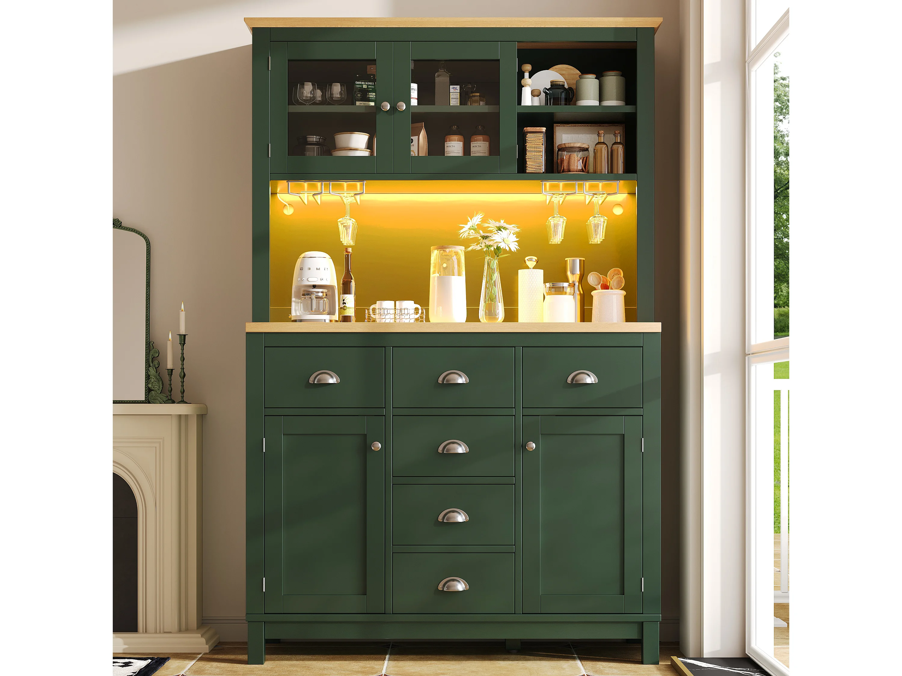 Kredens kuchenny - 120 x 40 x 188 cm - 4 drzwi + oświetlenie LED + uchwyty na kubki + szuflady + półka na przekąski - MDF - zielony