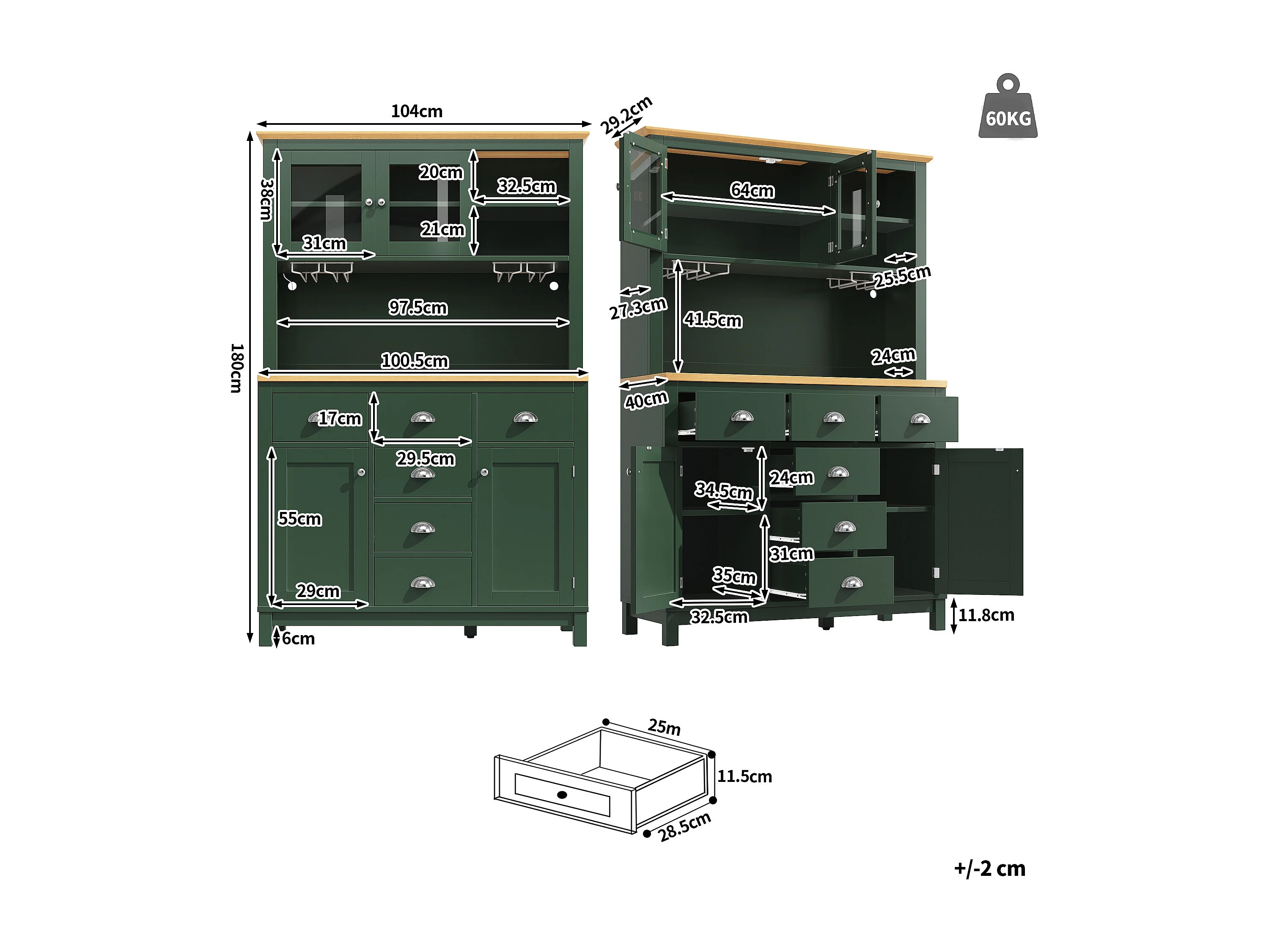 Kredens kuchenny w stylu rustykalnym - 104 x 40 x 180 cm - z drzwiami, diodami LED, półkami i szufladami - MDF - zielony