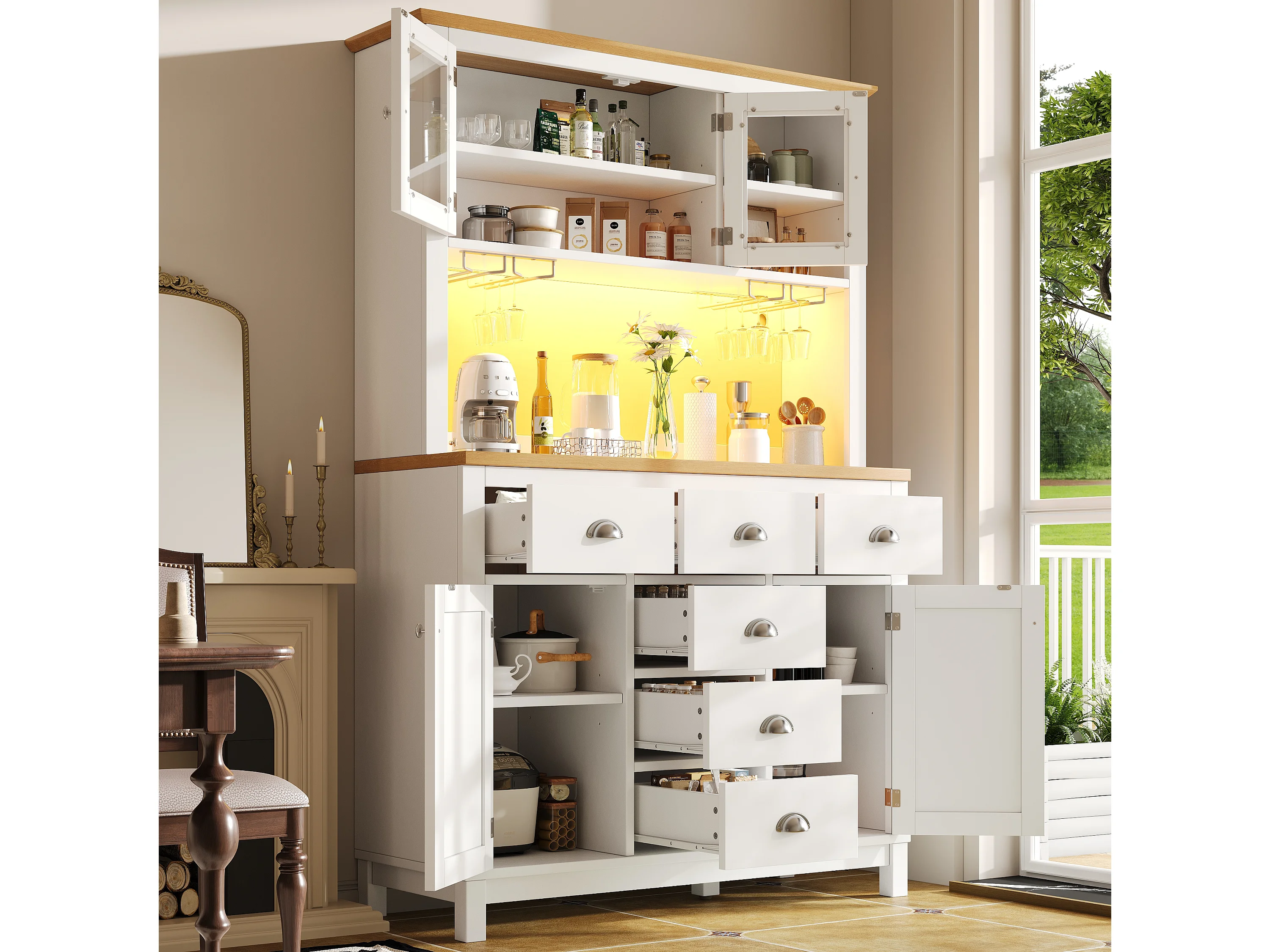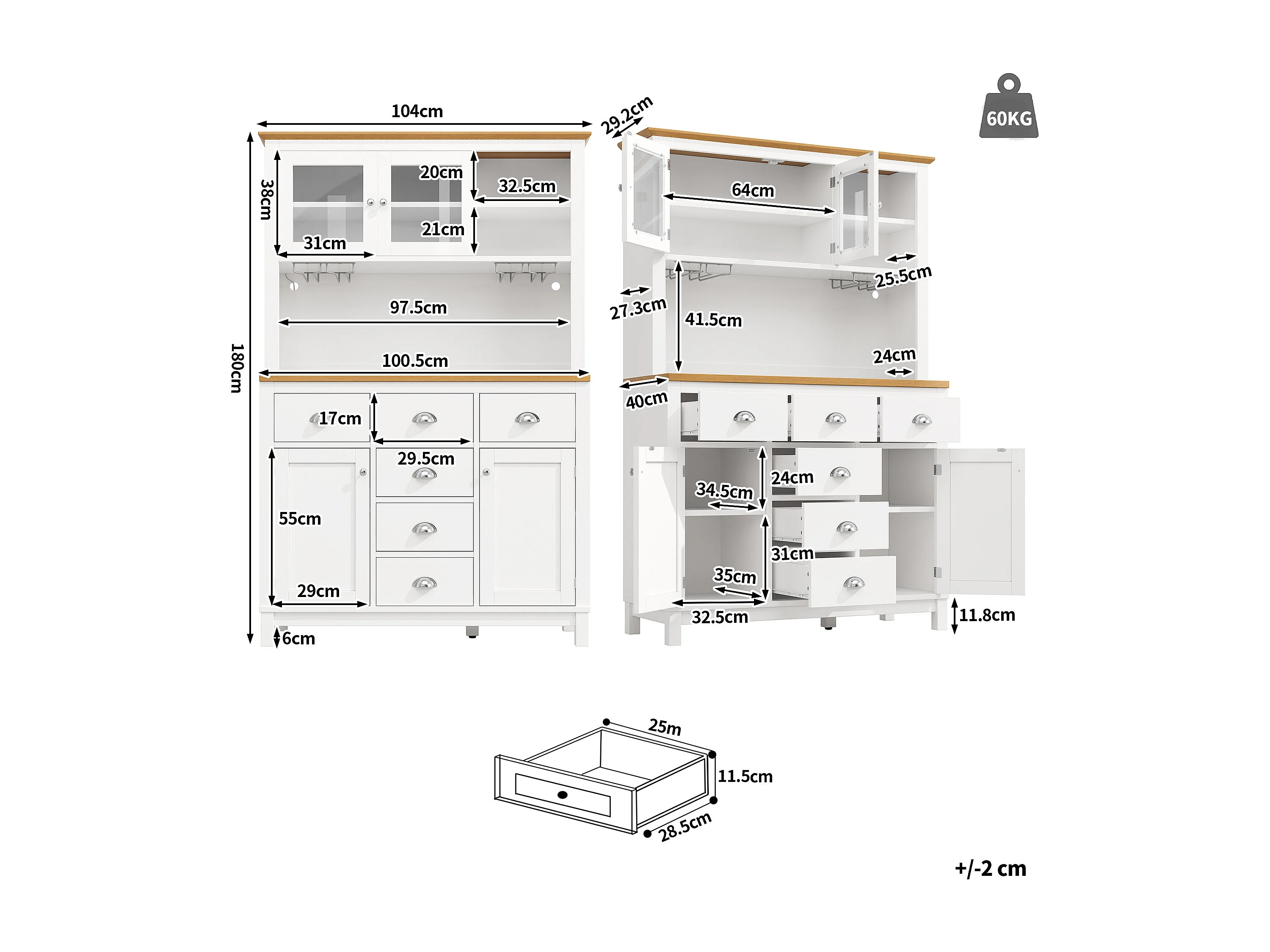 Kredens kuchenny w stylu rustykalnym - 104 x 40 x 180 cm - z drzwiami, diodami LED, półkami i szufladami - płyta MDF - biały