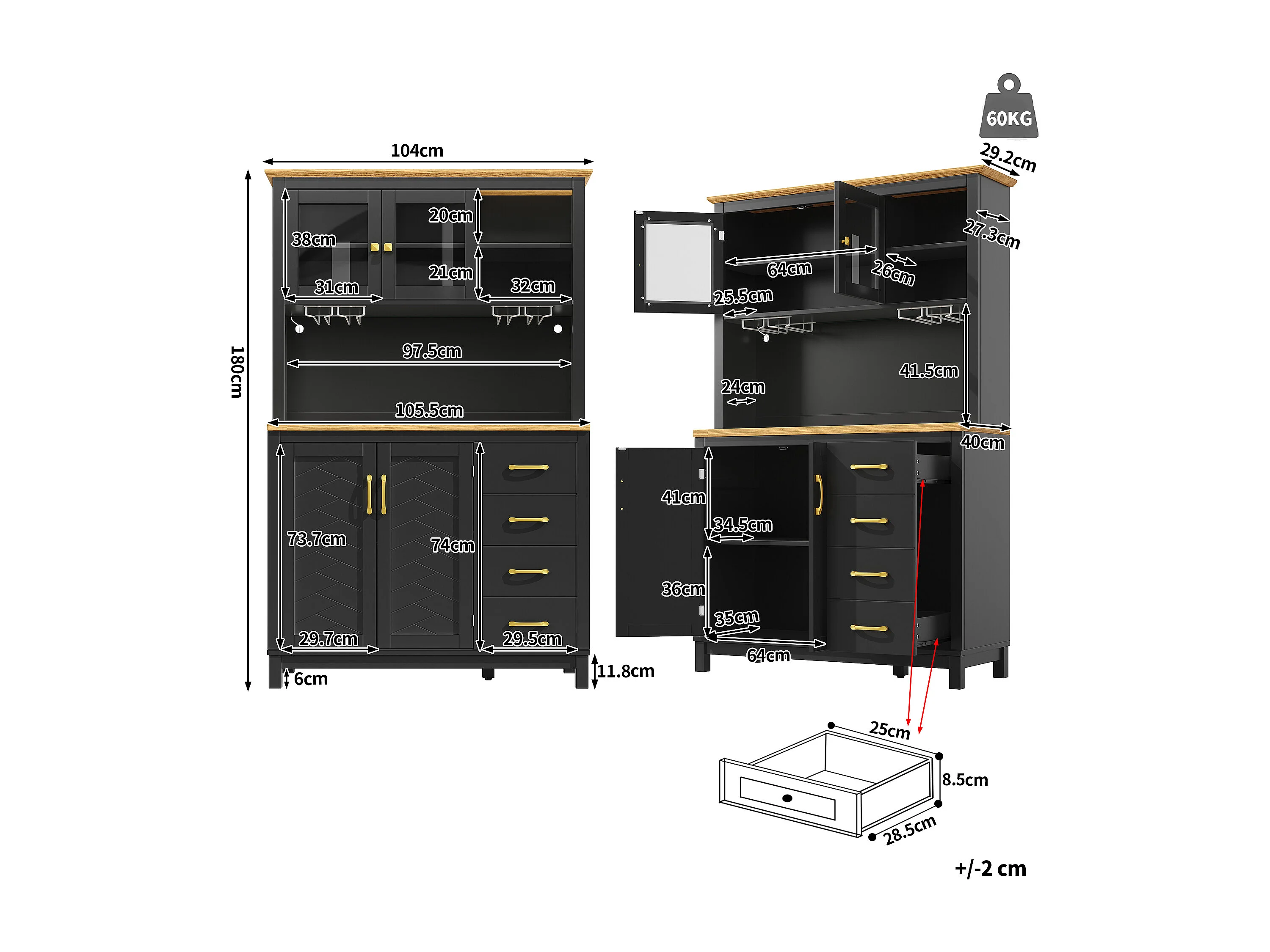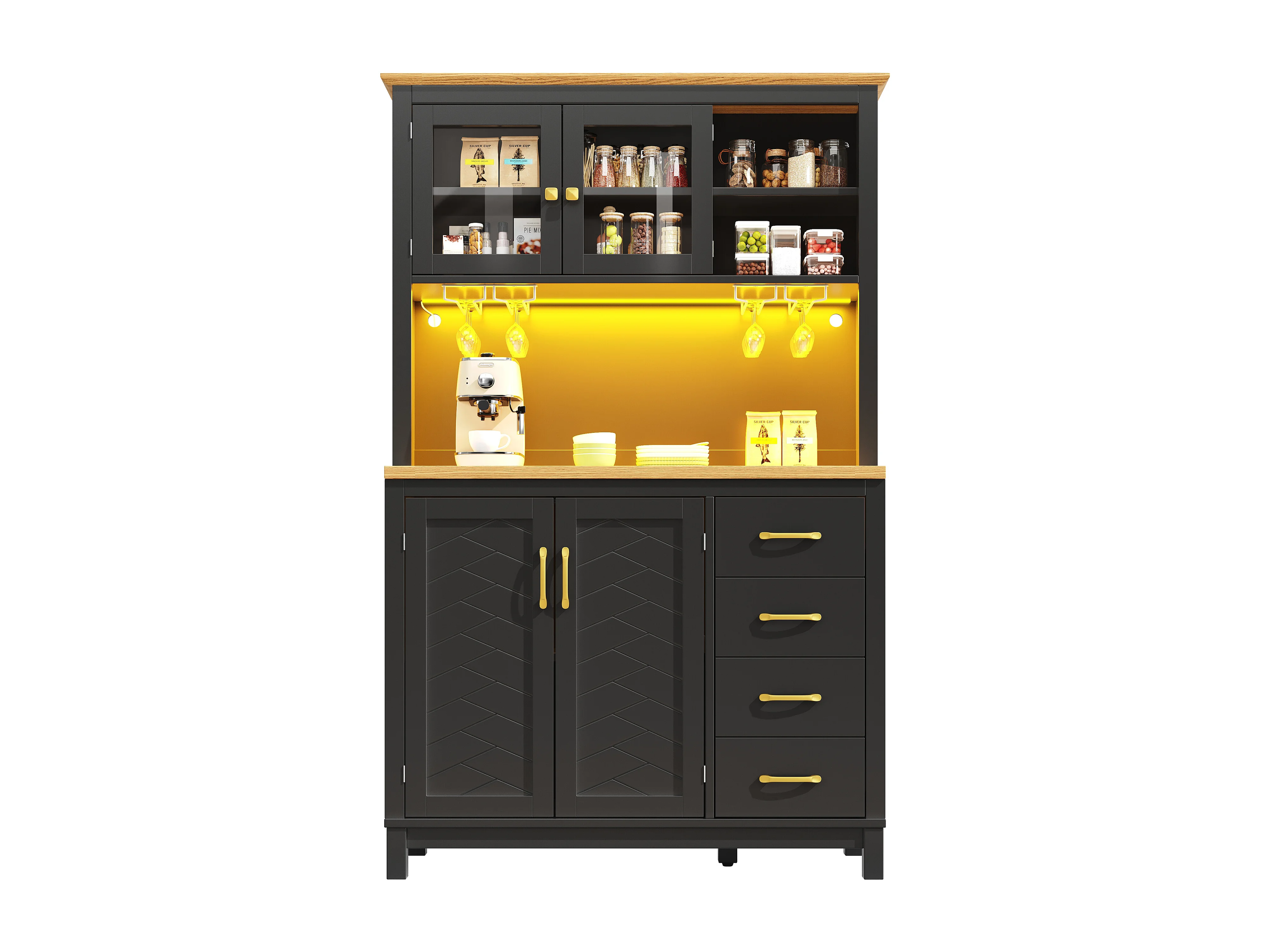 Kredens kuchenny w stylu rustykalnym - 105,5 x 40 x 180 cm - 4 drzwi + diody LED + uchwyty na kubki + szuflady - MDF - czarny